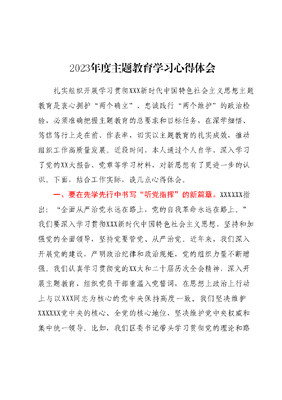 2023年度主题教育学习心得体会扎实组织开展学习贯彻XXX新时代中国特色社会主义思想主题教育是衷心拥护两个确立、忠诚践行两个维护的政治检验,必须准确把握主题教育的总要求和目标任务,在深学细悟、笃信笃行上走在前、作表率,切实以主题教育的扎实成效,推动组织工作高质量发展。近段时间,本人通过个人自学,深入学习了党的XX大报告、党章等学习材料,对新思想有了更进一步的认识。下面,结合工作实际,谈几点心得体会。一、要在先学先行中书写听党指挥的新篇章。XXXXXX指出:全面从严治党永远在路上,党的自我革命永远在路上。我们要深入学习贯彻XXX新时代中国特色社会主义思想,坚持和加强党的全面领导,坚持党要管党、从严治党。近年来,我们深入开展党的建设,严明政治纪律和政治规矩,党的组织力量不断增强。我们认真学习贯彻党的XX大和二十届历次全会精神,深入开展主题教育,组织党员干部重温入党誓词,在思想上政治上行动上与以XXX同志为核心的党中央保持高度一致。我们坚决维护XXXXXX党中央的核心、全党的核心地位,坚决维护党中央权威和集中统一领导。比如,我们区委书记带头学习贯彻党的理论和路线方针政策,坚决服从组织调配,严格落实请示报告制度,在重大问题上及时向党中央请示报告。我们还定期召开民主生活会,严肃批评和自我批评,坚决整改四风问题。这些举措增强了全区党员干部的政治意识、大局意识、核心意识、看齐意识,确保了党中央决策部署在本地区贯彻执行落实,党的组织力量和战斗力进一步增强。在新征程上,我们将继续深入推进全面从严治党,增强四个意识、坚定四个自信、做到两个维护坚决听党指挥、跟党走,以实际行动书写听党指挥的新篇章。我们将进一步加强党的政治建设,严格落实党章党规各项制度,严明政治纪律和政治规矩,严肃党内政治生活,增强政治判断力、政治领悟力、政治执行力。我们将持之以恒正风肃纪,一体推进不敢腐、不能腐、不想腐,坚决反对特权思想和特权现象。我们还将继续深化主题教育,组织开展我为群众办实事实践活动让党员干部在服务人民中检验初心使命,永葆共产党人政治本色二、要在先学先行中书写能打胜仗的新篇章。XXXXXX强调:全面从严治党永远在路上,党的自我革命永远在路上。我们要深入学习贯彻XXX新时代中国特色社会主义思想,坚持和加强党的全面领导,坚持党要管党、从严治党,以零容忍态度惩治腐败,坚决打赢反腐败斗争这场重大政治斗争。近年来,我们深入开展党的建设,坚持抓铁有痕、踏石留印,严明政治纪律和政治规矩,党的组织力量不断增强。我们坚持老虎苍蝇一起打,坚决查处政治问题和经济问题交织的腐败案件。我们区委书记带头接受监督,主动公布财产、遵守廉洁自律各项规定,严格执行中央八项规定及其实施细则精神,坚决反对特权思想和特权现象。在新征程上,我们将继续深入推进全面从严治党坚持标本兼治、治病救人,巩固拓展落实中央八项规定精神成果坚决打赢反腐败斗争这场重大政治斗争,以实际行动书写能打胜仗的新篇章。我们将进一步加强政治监督,完善权力制约和监督体系,坚持无禁区、全覆盖、零容忍,坚决惩治各类腐败问题。我们还将加大审计监察力度,严肃查处形式主义、官僚主义问题严明纪律要求,坚决防止灯下黑。此外,我们将继续加强作风建设,坚持问题导向,严格执行中央八项规定及其实施细则,持之以恒正风肃纪,让党员干部在严的约束下创优争先。三、要在先学先行中书写作风优良的新篇章。XXXXXX强调:我们共产党人的优良作风,就是共产主义作风。我们要深入学习贯彻XXX新时代中国特色社会主义思想,坚持解放思想,改进工作作风,密切联系群众,坚决反对形式主义、官僚主义,牢记为民情怀,把人民放在心中最高位置。近年来,我们深入推进作风建设,坚持问题导向,改进工作作风,提升工作效率。我们开展我为群众办实事实践活动,组织党员干部深入基层一线调研,倾听群众心声,了解群众需求。我们还坚持谈心谈话,面对面接受群众监督。这些做法增强了党员干部的群众观念和公仆意识,有力促进了作风建设。在新征程上,我们将继续深化作风建设,坚持以人民为中心的发展思想,坚决反对形式主义、官僚主义,以实际行动书写作风优良的新篇章。我们将进一步加强作风建设责任制,严格落实中央八项规定及其实施细则,持之以恒正风肃纪,坚决反对特权思想和特权现象。我们还将继续组织我为群众办实事实践活动,让党员干部在服务人民中检验初心使命,永葆共产党人政治本色。此外,我们将加强作风监督,建立健全12345服务热线、网上监督、信访举报等作风监督体系,及时发现和纠正作风问题。我们将继续坚持谈心谈话,设立畅通的民主评议渠道,广泛听取群众意见和建议,不断提高工作水平