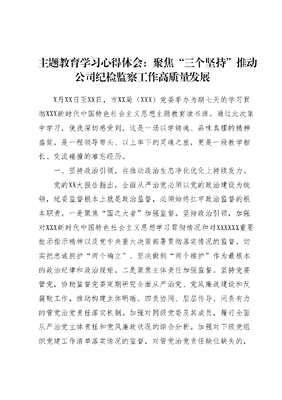 主题教育学习心得体会:聚焦三个坚持推动公司纪检监察工作高质量发展X月XX日至XX日,市XX局(XXX)党委举办为期七天的学习贯彻XXX新时代中国特色社会主义思想主题教育读书班。通过此次集中学习,使我深切感受到,这是一场以学铸魂、品味真理的精神盛筵,是一程领导带头、以上率下的灵魂之旅,更是一段教学相长、交流碰撞的难忘经历。一、坚持政治引领,在推动政治生态净化优化上持续发力。党的XX大报告指出,全面从严治党必须以党的政治建设为统领,纪委监督根本上就是政治监督,必须始终扛牢政治监督的根本职责。一是聚焦国之大者加强监督。坚持政治引领,加强对XXX新时代中国特色社会主义思想学习贯彻情况和对XXXXXX重要批示指示精神以及党中央重大决策部署贯彻落实情况的监督,切实把忠诚拥护两个确立、坚决做到两个维护作为最根本的政治纪律和政治规矩。二是聚焦主体责任加强监督。坚持党要管党,协助监督党委定期研究全面从严治党、党风廉政建设和反腐败工作,推动构建主体明晰、四责协同、层层传导、问责有力的管党治党责任落实机制。加强对同级党委及其成员,履行全面从严治党主体责任和党风廉政状况的综合分析。加强对下级党组织党建工作清单落实情况的监督,对管党治党责任缺位缺失的,予以追责问责。三是聚焦关键少数加强监督。突出关键少数加强对同级一把手和领导班子贯彻执行重大事项报告、民主集中制以及三重一大事项决策、五不直接分管等制度的监督。突出关键环节,坚持关口前移,紧盯工程建设、物资采购组织人事等重点领域和项目招标、资金结算等关键环节,加强权力运行管控。二、坚持全面从严,在反腐倡廉建设抓常抓长上持续发力。加强国企反腐倡廉工作,要把纪律和规矩挻在前面,严肃查处侵吞国有资产和利益输送等问题。一是严明纪律意识。严格执行党风廉政建设责任制,做到在需要面前学会选择,在名利面前学会放弃,在原则面前学会坚定,不论是工作中还是生活中、不论是八小时内还是八小时外,任何时候、任何地点都要慎言慎行自重自警,都要讲规矩、守纪律。二是严查违纪案件。严格执行一准则两条例,加大查办违纪案件工作力度,做到有案必查有贪必反、有腐必惩、有乱必治,对违法乱纪、以权谋私、干扰和影响企业发展的腐败分子,要一查到底,绝不姑息。三是严控权力运行。围绕三重一大,推进规范各项权力运行的体制机制改革,进一步健全完善充分酝酿、科学民主的阳光决策机制,选贤任能、公平公正的阳光人事机制,公开透明、廉洁高效的阳光工程机制,把权力关进制度的笼子,做到用制度管权、管事、管人。三、坚持系统施治,在推动治理体系建立健全上持续发力。国有企业是国民经济的重要支柱,必须坚持两个一以贯之,将监督体系与治理体系有机结合,切实把全面从严治党与深化改革、促进治理、推动发展贯通起来。一是深化防控体系建设。坚持防控结合,动态开展廉洁风险排查,监督跟进各类巡察审计整改,督促落实后半篇文章。坚持破立并举,以信访举报、内部审计等发现问题为重点,结合企业经营管理实际,持续推进制度建设废改立,推动建立完善与现代企业制度相适应的治理体系。二是完善问责体系建设。落实谈心谈话制度,持续开展制度执行情况检查通报,以制度刚性约束力的不断释放,强化内部管理。完善作风建设责任追究管理制度,细化问责追责情形及处理措施,着力构建防控+监督+问责全链条责任追究体系。三是推进监督体系建设。健全纪检与审计、财务、监事等监督的联动机制,推动职能部室更好履行监管责任,促进强监督与强监管同频共振。坚持上下协同,加强与市纪委对口联系监督室、派驻纪检组联系沟通,主动接受监督指导,筑牢企业纪委监督、派驻监督与上级纪委监督三道屏障,以大监督格局为企业高质量发展提供坚强的政治保障和纪律保障。非学无以广才,非志无以成学。读书班学习步入尾声,人生之学习长路漫漫。下一步,我将自觉把理论学习贯穿主题教育全过程,努力做到学思用贯通、知信行统一,真正把学习教育成果转化为推动水务事业高质量发展的强大动力!