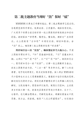 第二批主题教育当用好劲保好绩XXXXXX在黑龙江考察时指出,第二批主题教育已经启动,各地要坚持科学谋划、统筹安排、分类指导,确保取得实效。广大党员干部要全面总结好第一批主题教育的有效做法和成功经验,继续紧扣学思想、强党性、重实践、建新功总体要求,在主题教育后半程中用好实劲、韧劲和狠劲,奋劲而上,确保第二批主题教育取得好成绩。用好知行合一的实劲,确保理论学习入脑入心。开展主题教育理论学习,知是基础和前提,行是重点和关键,必须以知促行、以行促知,做到知行合一。要用好知行合一的实劲,以第一批主题教育为基点,依托主题教育读书班、三会一课等多种方式,静下心来读原著、逐字逐句学原文、联系实际悟原理,深入领会XXX新时代中国特色社会主义思想精髓要义,掌握其中指导实践的思维、解决实际问题的方法,进而把高质量理论学习成果融入到为民解忧、为民造福中。要坚持学以致用,做到以行促知,主动投身乡村振兴第一线、改革攻坚最艰苦等地方学真知、长才干、壮筋骨,在化解治理难点、纾解民生痛点、破解发展盲点中找思路、找方法、找答案,做到入宝山而富理论,切实推动理论学习入脑入心。用好求真务实的韧劲,确保调查研究走深走细XXXXXX指出,研究、思考、确定全面深化改革的思路和重大举措,刻舟求剑不行,闭门造车不行,异想天开更不行,必须进行全面深入的调查研究。第二批主题教育中,要以求真务实的韧劲,念好深、实、细、准、效五字诀,切实展开调查研究,坚持问题导向和目标导向,实行问题大梳理、难题大排查,通过规定路线和自选动作,在田间地头、社区街道即问群众的急难愁盼、所思所想,又问群众的意见建议、创造经验。调而不研、是为无用,要综合运用归纳分析等手段,把调研发现的问题根源弄清楚、症结分析透、对策理通顺,最终形成富有针对性、体现实效性的高质量调研成果,真正做到调以务实、研以致用,让调研成果从纸上到现实,确保调查研究真正走深走细、为民所用。用好刀刃向内的狠劲,确保检视整改见行见效。检视整改是发现问题、解决问题的关键,其效果直接反映出主题教育开展的具体成效。广大党员干部要坚持躬身自省,自觉刀刃向内,主动对照党章党规党纪,对照个人初心使命,从思想根源上开始检视,由表入里查摆具体问题,深入剖析可能隐藏病灶,坚决摒弃隔靴搔痒、避重就轻、避实就虚,切实找出存在的问题,形成清晰明了的问题清单,为具体整改提供精准靶向。过而不改,是谓过矣。要拿出自剜腐肉的狠劲,在改字上下真功夫、见真章,杜绝知而不改、改不彻底的形式主义、惯性思维做法,针对现有问题,无论大小、不分等级,坚持即知即改、真改狠改,做到整改不彻底不放手、群众不满意不停手,切切实实除病灶祛顽疾,确保检视整改见行见效。