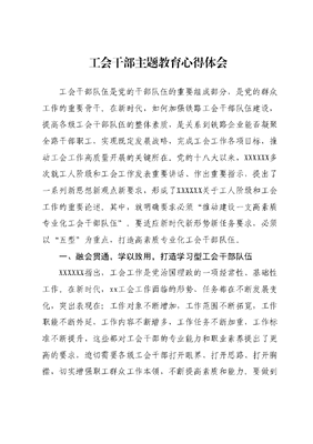 工会干部主题教育心得体会工会干部队伍是党的干部队伍的重要组成部分,是党的群众工作的重要骨干。在新时代,如何加强铁路工会干部队伍建设,提高各级工会干部队伍的整体素质,是关系到铁路企业能否凝聚全路干部职工,实现既定发展战略,完成工会工作各项目标,推动工会工作高质量开展的关键所在。党的十八大以来,XXXXXX多次就工人阶级和工会工作发表重要讲话、作出重要指示,提出了一系列新思想新观点新要求,形成了XXXXXX关于工人阶级和工会工作的重要论述。其中,就明确要求必须推动建设一支高素质专业化工会干部队伍。要适应新时代新形势新任务要求,必须以五型为重点,打造高素质专业化工会干部队伍。一、融会贯通,学以致用,打造学习型工会干部队伍XXXXXX指出,工会工作是党治国理政的一项经常性、基础性工作。在新时代,xx工会工作面临的形势、任务都在不断发展变化,突出表现在:工作对象不断增加,工作范围不断拓宽,工作职能不断外延,工作内容不断增多,工作任务不断加重,工作标准不断提升,这些都对工会干部的专业能力和职业素养提出了更高的要求,迫切需要各级工会干部打开眼界、打开思路、打开胸襟,切实增强职工群众工作本领,不断提高素质和能力。要做到这一点,工会干部就必须树立终身学习理念,不断优化知识结构努力使自己成为学习型工会干部。要努力学习XXX新时代中国特色社会主义思想,学习XXXXXX关于工人阶级和工会工作的重要论述学习工会业务知识技能,学习工会法律法规,学习工会尤其是铁路行业工会工作规章制度,学习思想政治工作技能,学习铁路经营管理、运输安全生产等专业知识,学习社会学、心理学、经济学等相关领域知识。在干什么、学什么;缺什么,补什么;弱什么,强什么的原则下,坚持学以致用,知行合一,融会贯通。学习的过程中,务必坚持常学常新、常思常得、常践常行、常悟常进,切实把学习成果转化为提升工会工作水平、履行工会参与维护、建设、教育职能,推动铁路行业高质量发展的实际成效二、强化意识,找准重点,打造服务型工会干部队伍中国工会十七大将工会基本职责拓展为维护职工合法权益竭诚服务职工群众,因此,工会组织和工会干部要牢固树立宗旨意识,不断强化服务意识,把履行好竭诚为职工群众服务的基本职责作为工会一切工作的出发点和落脚点。首先,要服务工作大局。铁路工会工作只有紧紧围绕铁路企业的大局和中心工作,和企业的中心和重点工作紧密契合、同频共振,在企业高质量发展的大舞台上展现作为,工会工作才有价值,工会干部才有归属因此,作为工会干部必须要做到脑中有大势、胸中有大局、心中有大事,牢记工会宗旨,聚焦主责主业,在铁路改革发展中,大力弘扬劳模精神、劳动精神、工匠精神,进一步凝聚起职工群众投身中心工作的热情和干劲,在服务大局中不断展示新作为。其次,要服务职工群众。XXXXXX深刻指出:群团组织做服务工作具有两重性,既要服务党和国家工作大局,也要服务群众,不能把两者割裂开来,也不能畸轻畸重。在服务职工群众的过程中要聚焦职工群众最关切的问题,建立健全联系广泛、服务职工群众的工会工作体系,强化服务意识,推动工会服务从特惠型向普惠型转化,不断扩大服务的覆盖面和受益面,积极探索互联网+服务,力所能及为职工群众提供具有工会特点的普惠性、常态性、精准性、便捷性的服务。通过服务意识的增强、服务手段的创新、服务质量的提升、服务力度的加大、服务领域的拓展,努力把工会干部锤炼成为能够团结带领职工群众听党话跟党走的娘家人,把工会组织建设成为职工群众信赖的职工之家。三、与时俱进,敢为人先,打造创新型工会干部队伍走建设有中国特色社会主义工会发展之路,离不开创新。XXXXXX高度重视工会改革创新,他强调,工会改革是全面深化改革的重要组成部分。当前,与新时代党对工会工作提出的新要求以及时代发展、社会变化和职工需求带来的新情况新任务相比,工会工作在创新方面还存在一定的差距。如,工会体制机制与劳动关系、职工队伍新变化不够适应;工会工作载体和手段还不够丰富新颖;工会服务的内容还没有与时俱进,完全跟上新形势的发展变化;工会干部自身创新意识、创新思路、创新能力、创新举措不足,整体滞后于形势发展需要等。要解决上述问题,铁路各级工会干部就要进一步破解因循守旧不想创新、能力不足不会创新、求稳怕乱不敢创新的思想禁锢,紧跟新时代的形势需要,敢于在观念、思路、制度、机制、方式方法上打破旧有条条框框的束缚,把紧密围绕全路运输生产经营目标任务展示工会组织作为、加强新时期铁路产业工人队伍建设、解决职工群众十分关心的热点难点问题、保持基层工会工作活力和吸引力等,作为工会干部理论创新、制度创新、手段创新、载体创新的主战场。要根据行业特点,积极尝试互联网+、云端化、智能化等全新工作载体,特别是要紧贴当前全路强化安全专项整治行动、深化疫情防