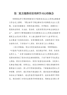 第二批主题教育读书班学习心得体会XXXXXX在学习贯彻XXX新时代中国特色社会主义思想主题教育工作会议上强调,要全面学习领会新时代中国特色社会主义思想,全面系统掌握这一思想的基本观点、科学体系,把握好这一思想的世界观、方法论,坚持好、运用好贯穿其中的立场观点方法。按照学习贯彻XXX新时代中国特色社会主义思想主题教育专题民主生活会有关要求,本人通过集体学习和个人自学等方式,在次重温了党的XX大报告、党章等重要内容,对新思想有了更加全面的认识。下面结合个人实际,跟大家谈几点心得体会。一是以学铸魂,学出对党忠诚的政治品格。XXXXXX指出:中国共产党是马克思主义政党,我们理应学好、用好、传好马克思主义。在学习XXX新时代中国特色社会主义思想的过程中,我深刻体悟到了坚持对党忠诚的重要性。只有不断学习马克思主义理论,将其与实践相结合,我们才能坚定政治品格,为党和人民事业贡献力量。回顾过去,我们以XXXXXX关于强化党性修养的重要指示为指引,深入学习贯彻党的理论,不断提高对党的认识和理解。在我市,我们积极开展党建工作,推动党组织的覆盖面和活动力不断提升。通过开展党员集体学习、组织参观学习等形式,我们加深了对党的忠诚意识和使命担当,同时也在实际工作中切实践行了XXXXXX的重要思想。下一步,我们要继续坚持学出对党忠诚、坚定不移的政治品格。要加强党性修养,深入学习XXXXXX的著作和重要讲话,增强对党的理论自信。要严守政治纪律,自觉践行党的组织原则,自觉维护党的团结统一。要强化党风廉政建设,加强党员干部的自律和廉洁意识,做到始终保持党员的荣誉感和责任感。二是以学增智,学出锐意进取的奋斗精神。XXXXXX指出:中国梦是全体中国人的梦,必须依靠全体人民共同努力。在学习XXX新时代中国特色社会主义思想的过程中,我深刻体会到了锐意进取、矢志奋斗的重要性。只有通过不断学习与实践相结合我们才能增长智慧、提高素质,为实现中华民族伟大复兴的中国梦做出积极贡献。在过去的工作中,我们积极响应XXXXXX奋发有为、争创一流的号召,坚持勇于担当、敢于创新。我们积极推动改革创新,加强科技创新,不断提升经济发展的质量和效益在乡村振兴方面,我们积极引导农民发展特色产业,推动农业现代化进程。同时,在经济发展中,我们注重提升人民群众的生活水平,推动脱贫攻坚工作深入开展。下一步,我们要继续坚持学出锐意进取、矢志不移的奋斗精神。要加强学习,不断提高自身素质和能力,适应新时代的发展需求。要注重创新,积极研究解决实际问题,推动项目建设和产业发展。要加强团队合作,发挥集体的力量和智慧,共同为经济社会发展做出更大的贡献。三是以学正风,学出刀刃向内的革命意志。XXXXXX指出:党风廉政建设和反腐败斗争形势依然严峻复杂,必须保持警醒和清醒。在学习XXX新时代中国特色社会主义思想的过程中,我深刻认识到坚持刀刃向内、一往无前的革命意志的重要性。只有敢于自我革命、正视问题,我们才能不断提升党风廉政建设和反腐败斗争的坚实成效。我市积极贯彻XXXXXX的要求,坚持从严治党、反腐败斗争不松劲。我们以身作则、带头廉洁自律,深入开展党风廉政建设和反腐败斗争。在过去的工作中,我们坚决整治形式主义、官僚主义,推动党风廉政建设取得了明显成效。同时我们积极加强反腐败工作,严肃查处了一批涉及贪污腐败的案件为党风廉政建设树立了良好的示范。下一步,我们要继续坚持学出刀刃向内、一往无前的革命意志。要加强制度建设,完善内部监督机制,防止权力腐败。要强化教育培训,加强廉政意识的教育宣传,培养党员干部具备良好的政治品质。要加强舆论监督,主动接受监督和批评,推动风清气正的政治生态。四是以学促干,学出始终如一的为民初心,做到。XXXXXX指出:人民对美好生活的向往,就是我们的奋斗目标。在学习XXX新时代中国特色社会主义思想的过程中,我深刻体会到了始终如一、赤诚不变的为民初心的重要性。只有始终把人民放在心中最高位置,我们才能不断提高为民服务的水平和质量。在过去的工作中,我们坚持人民至上、以人民为中心的发展思想,积极推动为民办实事工作。通过深入了解群众需求,我们开展了一系列扶贫工作、民生项目建设,取得了显著的成绩。同时,我们注重解决人民群众的烦心事、揪心事,努力改善人民群众的生活条件让人民群众有更多的获得感和幸福感。下一步,我们要继续坚持学出始终如一、赤诚不变的为民初心。要深入了解人民需求,积极推动民生项目建设,解决实际问题。要加强基层工作力量,密切联系群众,听取民意声音,及时回应人民群众关切。要坚持以人民为中心的发展思想,为人民群众创造更加美好的生活环境。