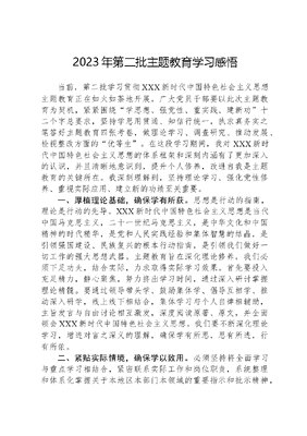 2023年第二批主题教育学习感悟当前,第二批学习贯彻XXX新时代中国特色社会主义思想主题教育正在如火如荼地开展。广大党员干部要以此次主题教育为契机,紧紧围绕学思想、强党性、重实践、建新功十二个字总要求,坚持学思用贯通、知信行统一,执求真务实之笔答好主题教育四张考卷,做理论学习、调查研究、推动发展、检视整改方面的优等生。在这段学习期间,我对XXX新时代中国特色社会主义思想的体系框架和深刻内涵有了更加深入的认识,并且清晰地意识到,提升个人修养,改进自我是主题教育的关键所在。我深刻理解到,坚持理论学习、强化党性修养、重视实际应用、建立新的功绩至关重要。一、厚植理论基础,确保学有所获。思想是行动的指南,理论是行动的先导。XXX新时代中国特色社会主义思想是当代中国马克思主义,二十一世纪马克思主义,是中华文化和中国精神的时代精华,是党和人民实践经验和集体智慧的结晶,是引领强国建设、民族复兴的根本行动指南,是引领我们做好一切工作的强大思想武器。主题教育旨在深化理论修养,我们必须下足功夫,结合实际,力求取得实际学习效果。首先要投入充足精力,静心聚焦,努力挤出学习时间,通过深入研讨掌握理论精髓。要通过领导带头学、鼓励集体学、倡导互相学、推动深入研学,线上线下相结合,集体学习与个人自律相辅助,主旨发言与自由讨论相互激发,深度阅读原著、原文,并全面领会XXX新时代中国特色社会主义思想。我们要不断深化理论学习,增进对言之深义的理解,确保学有所思,思有所进,行有所依。二、紧贴实际情境,确保学以致用。必须坚持将全面学习与重点学习相结合,紧密联系实际工作和岗位职责,系统整理和体系化掌握关于本地区本部门本领域的重要指示和批示精神,并及时更新完善,通过点面结合,实现理论学习的广度与深度相统一。我们需深刻把握XXXXXX的思想要义,确保理论知识的整体把握和深入融会。理论学习的最终目标在于应用,应结合正在开展的具体工作,推动学用结合,以学促干。自觉用党的创新理论观照新形势、分析新情况、解决新问题,将学习成效转化为改善主观世界、提升能力本领的动力,转化为推动工作成果的具体实践。三、务实调研,确保真知灼见。调查研究必须坚持实事求是、求真务实的原则,通过深入、实在、细致、准确、有效的五字诀开展工作。第一,要通过深入基层,倾听群众真实意见,全面了解群众所思所愿。第二,要实地考察,确保问题的精准定位,及时梳理并明确问题列表。第三,要确保针对具体问题提出切实可行的对策,确保调研与工作紧密结合,深入分析问题根源,借鉴群众智慧,提出解决问题的途径和方法,并构建全流程问题解决的闭环管理和责任体系,确保问题得到有效解决。四、坚持理论与实践并重,确保高质量发展。高质量发展是全面建设社会主义现代化国家的首要任务。理论学习与调查研究应围绕推动高质量发展这一核心任务展开。首先,要以扎实的理论学习指导发展实践,把解决问题作为学习的重点,从党的科学理论中汲取智慧,确保战略部署和工作执行的科学性和准确性。其次,务实的调查研究应致力于解决发展难题,通过各类策略性、前瞻性、案例式的调研工作,准确发现并解决问题。最后,将理论学习与调查研究相结合,以学为先,明确发展目标,通过深入调研把握本质规律,汲取力量,找到解决问题的有效途径,共同推进社会主义现代化国家的高质量发展。