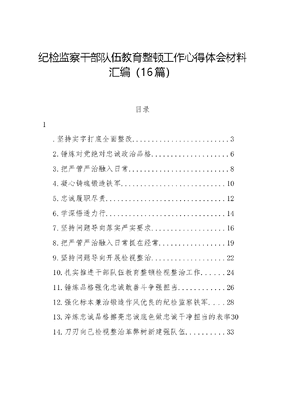 纪检监察干部队伍教育整顿工作心得体会材料汇编(16篇)目录1.坚持实字打底全面整改.32.锤炼对党绝对忠诚政治品格..63.把严管严治融入日常..84.凝心铸魂锻造铁军105.忠诚履职尽责.126.学深悟透力行.147.坚持问题导向落实严实要求.168.把严管严治融入日常抓在经常..199.坚持问题导向开展检视整治.2210.扎实推进干部队伍教育整顿检视整治工作2411.锤炼品格强化忠诚敢善斗争强担当2612.强化标本兼治锻造作风优良的纪检监察铁军.2813.淬炼忠诚品格擦亮忠诚底色做忠诚干净担当的表率3014.刀刃向己检视整治革弊树新建强队伍.3315.淬炼忠诚本色,提升基层党风廉政建设质效.3516.发扬斗争精神,做党的忠诚卫士..3717.严字当头抓整顿建强队伍铸铁军39坚持实字打底全面整改开展纪检监察干部队伍教育整顿,是从政治上建设纪检监察干部队伍、确保忠诚干净担当的必然要求。要深刻认识开展教育整顿的重大意义,自觉接受刻骨铭心的革命性锻造和深入灵魂的精神洗礼,以铁的纪律维护纪检监察干部队伍纯洁性,锻造纯度更高、成色更足的铁军。以学铸魂,确保学习教育入脑入心。坚持把学习教育作为重要环节、贯穿始终,强化理论武装,筑牢政治忠诚。绝对忠诚于党。坚持不懈用XXX新时代中国特色社会主义思想凝心铸魂,严格落实第一议题制度和理论学习中心组学习制度,不断夯实思想根基,把对两个确立的坚定拥护转化为两个维护的自觉行动。绝对忠诚于人民。牢固树立人民至上的理念,用好联、访、督、评、改工作法和社会化征集意见建议平台,主动请群众把脉、自觉受群众监督、真诚让群众评判、勤恳为群众解难。绝对忠诚于纪检监察事业。开展河洛纪检监察论坛等活动,引导纪检监察干部树立正确的权力观、政绩观、事业观,不断探索党风廉政建设和反腐败斗争的新办法、新举措、新途径,推动纪检监察工作高质量发展。以严律己,确保检视整治真刀真枪。坚持问题导向,把问题弄清楚、把症结查明白、把整改搞扎实。坚持严字当头清理门户。对党的十八大以来受理的问题线索起底梳理、归口管理;对反映具体、指向明确、核查条件成熟的问题线索,立查立处、严查严处;对已办结但教育整顿期间又反映集中的进行回头看,坚决清除害群之马。坚持细字着力查纠问题。全面进行自查自纠,对教育整顿期间主动讲清问题的依规依纪依法从宽处理,对心存侥幸、妄图蒙混过关甚至对抗组织审查调查的坚决从严查处。坚持实字打底全面整改。对照XXXXXX对纪检监察干部队伍建设的重要指示批示,按照中央纪委国家监委部署要求,全面开展谈心谈话、自查自纠。针对突出问题、典型问题、普遍性问题开展专项治理,做到问题不解决不松劲、解决不彻底不放手,打造忠诚干净担当的纪检监察队伍。以干为要,确保巩固提升常态长效。坚持当下改与长久立相结合,以新气象新作为推动纪检监察工作高质量发展取得新成效。健全内控机制,做到严管严治。优化工作流程,健全内控机制,完善管思想、管工作、管作风、管纪律的全面从严管理机制,加强对内控制度执行情况的监督检查,把监督执纪执法权关进制度笼子。大兴调查研究,提升履职本领。把调查研究、学习探索、实践锻炼贯穿教育整顿始终,扎实开展业务讲堂、专题培训、支部研学、主题党日活动,实施重点课题大调研,班子带队深入基层学习调研,切实提升能力水平。牢记职责使命,勇担时代重任。紧紧围绕国之大者找准工作切入点、着力点,一刻不停推进全面从严治党,为经济社会高质量发展营造风清气正的政治生态和良好发展环境。锤炼对党绝对忠诚政治品格开展纪检监察干部队伍教育整顿,是党中央着眼锻造高素质纪检监察干部队伍作出的重大决策部署,是对干部队伍忠诚纯度和卫士成色的直接检验。教育整顿开展以来,xx市纪委监委把锤炼对党绝对忠诚的政治品格作为贯穿教育整顿的主线,以学习教育为先导,一体推进检视整治、巩固提升等工作,教育引导全市纪检监察干部筑牢忠诚、淬炼忠诚、践行忠诚、彰显忠诚。深化学习教育,在纯洁思想中筑牢忠诚。理论上的认同是最根本的认同,思想上的追随是最内在的追随,对党忠诚首先要打牢思想根基。开展教育整顿,要牢牢抓住学习教育这个根本,坚持不懈用XXX新时代中国特色社会主义思想