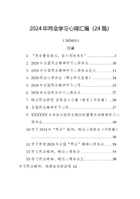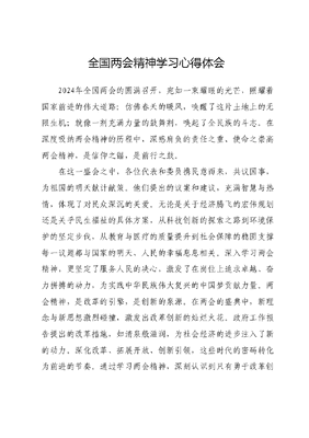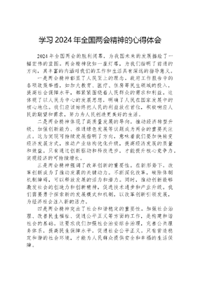 学习2024年全国两会精神的心得体会2024年全国两会的胜利闭幕,为我国未来的发展描绘了一幅宏伟的蓝图。两会精神犹如一座灯塔,为我们指明了前进的方向,其丰富的内涵对我们的工作和生活具有深远的指导意义。一是两会精神彰显了人民至上的理念。政府工作报告中的各项政策举措,如加大教育、医疗、住房等民生领域的投入,提高社会保障水平,都紧紧围绕着人民群众的需求和利益。这体现了以人民为中心的发展思想,明确了人民在国家发展中的核心地位。我们应该始终把人民的利益放在首位,积极响应人民的期望和需求,努力为人民创造更美好的生活。二是两会精神体现了高质量发展的导向。推动经济转型升级、加强创新能力、推进绿色发展等议题成为两会的重要关注点。这为实现可持续发展指明了方向,意味着我们要加快转变经济发展方式,推动产业结构优化升级,提高经济发展的质量和效益。只有通过创新驱动和科技进步,才能提升核心竞争力,实现经济的可持续增长。三是两会精神强调了改革创新的重要性。在新形势下,改革创新成为了推动发展的关键动力。不断深化改革,破除体制机制障碍,可以释放发展的活力和潜力。同时,推动创新能够激发社会的创造力和创新精神,促进技术进步和产业升级。我们需要勇于探索新的发展模式和机制,以改革创新引领发展,为经济社会注入新的活力。四是两会精神突出了社会和谐稳定的重要性。加强社会治理、改善民生福祉、促进公平正义等方面的工作,是构建和谐社会的基础。这要求我们加强社会治安综合治理,完善公共服务体系,提高民生保障水平,促进社会公平正义。只有营造稳定和谐的社会环境,才能为人民群众提供安全和幸福的生活保障。五是两会精神激励着我们担当作为。广大干部肩负着时代赋予的责任,应积极投身到国家发展的大局中。这需要我们增强责任感和使命感,勇于担当,积极主动地履行职责。以实际行动践行两会精神,为国家的繁荣和人民的幸福贡献自己的智慧和力量。六是两会精神提醒我们要保持清醒头脑。面对复杂多变的国际形势和各种风险挑战,我们必须增强忧患意识。时刻保持警惕,勇于攻坚克难,善于应对各种风险和挑战。通过加强风险防范和应对能力,确保国家的安全和稳定。通过学习2024年全国两会精神,我深刻认识到自己肩负的责任和使命。在今后的工作中,我将以两会精神为指引,不断提升自身素质,努力为实现国家发展目标贡献自己的一份力量。我相信,在全国人民的共同努力下,我们一定能够实现国家的繁荣昌盛和人民的幸福安康。让我们携手共进,共同迈向美好的未来!文可居文库——海量学习资料,手机电脑均可下载www.wenkeju.com