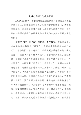 让敢担当善作为蔚然成风XXXXXX强调,要着力建强堪当民族复兴重任的高素质执政骨干队伍。组织部门作为选贤任能的重要职能部门,要扛起组织担当,充分释放促进干部敢为善为有为的强烈信号,让干部在以中国式现代化全面推进中华民族伟大复兴新征程上展现大作为。处理好将与兵的关系,贵在敢为。在新征程上,应有带头冲锋陷阵的将军,还需有落实作战任务的士兵。组织部门育才造士,须锻造更多敢于作为的精兵强将。选优头雁助将强。要着眼知人善任、选配有据,定期对头雁开展精准研判,充分了解学过什么、干过什么,全面预判干了什么、干成什么,做到心中有数、用而有备,选优配强乡村振兴头雁方阵。配强群雁让兵壮。头雁是攻坚克难的主心骨,群雁是干事创业的主力军,组织部门在选优头雁的基础上,更要配强群雁。要在阵形上统筹搭配,重点突出沉稳持重型与敢打敢拼型、开拓者与老黄牛等互补效应,达到1+1>2的整体功能,实现落好一子、盘活全局;要在能力上综合提升,注重理论与实践能力双提升,有组织有计划地把群雁放到关键吃劲岗位和基层一线摔打历练,在壮筋骨的同时增才干。振翅齐飞展作为。既要让将发挥领头谋划作战、牵头下达作战、带头冲锋陷阵的作用,也要激励兵发挥落实作战任务、攻克急难险重、屡立奇绩战功的作用,形成头雁领航、群雁齐飞的良好局面,形成雁阵效应。解决好船与桥的问题,推动善为。毛泽东同志曾经把会干事比作过河的桥或船,组织部门在激励干部敢为的基础上要推动干部善为。亮出想干事的底气。船或桥是想干事之基,造船和搭桥的前提就是要有想为之境界。要教育引导广大干部把想干作为成事的前提,把解决过不了河的问题作为工作方向,主动在岗位上扛起重任、挑起重担,心思向想干事上聚焦,行动在想干事上展现,以广大干部奋勇争先想干事的姿态,奏响干部要干事、为官要有为最强音。磨炼能干事的本领。船与桥是能干事之道,没有两把刷子,就没有干事创业的底气,更没有担当作为的硬气。组织部门要聚焦干部不会为、不善为的突出问题,采取精准滴灌式喂养和田间地头式放养相融合的方式,推动干部从一专向多能转变,教会广大干部把船撑得又快又稳、把桥建的又宽又好,确保平稳过河。同时,要大兴调查研究之风,以调研开局、以调研开路,以调研破冰、以调研破题,磨练干部会造船和善文可居文库——海量学习资料,手机电脑均可下载www.wenkeju.com搭桥的真本领。坚定干成事的决心。船和桥是干成事之本,无论是撑船还是建桥都是一项复杂工程,行船可能会遇到风吹浪打,架桥可能会遇到许多技术难题,如果经受不住风浪拍打和技术考验,过河之路就会前功尽弃、遥遥无期。要把干部干事的态度、行事的速度、成事的韧度作为以事识人、以事择人、以事用人的重要标准,激励广大党员、干部在矛盾困难面前发扬钉钉子精神,以马不离鞍、缰不松手的定力破解过不了河的困局,以善为创新局。把握好容与纠的界限,促进有为。激励干部敢于担当、积极作为,让干部没有后顾之忧干事创业,需要组织部门主动作为,推动形成组织为干部担当、干部为事业担当的良好局面。亮明优与劣的标尺。要以察准考实干部为着力点,为优者、劣者精准画像。把画像刻画到位、画活干部,就要掌握收集好第一手画像素材,这就要求组织部门要充分发挥考核指挥棒作用,建立起全方位的考核体系,把考察方式从屋内延伸到院外,做到既察一时也察一贯,既重过程也重结果。以一人一张考卷打破一把尺子量到底,做到识有因、评有据、用有方。握紧上与下的准绳。干部能上是激励,能下同样也是鞭策。在动真碰硬解决干部能上能下问题上,不能只闻雷声,不见下雨,要释放出干得好就上、干文可居文库——海量学习资料,手机电脑均可下载www.wenkeju.com不好就下的明确信号,在亮明优与劣标尺的基础上,把准干部上与下的准绳,让干部上之有理、下之服气。同时,要建立闭环管理体制机制,一方面要为上的干部压担子搭台子递梯子;另一方面对下的干部也要加强关心关爱,不能一下了之,让干部下得来更上得去。践行严与实的标准。从严管理干部既要有力度也要有温度,一方面,要以零容忍的姿态向不敢为、不善为、不作为重拳出击,切实把板子打到放弃干事担事、选择一躺到底的干部身上;另一方面,要健全完善容错纠错机制,建立回访教育回炉锻造等机制,激励广大干部放下包袱、轻装上阵。文可居文库——海量学习资料,手机电脑均可下载www.wenkeju.com