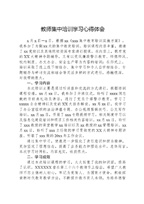 教师集中培训学习心得体会x月x日-x日,根据xx《xxx集中教育培训实施方案》,我参加了为期xx天的集中教育培训。培训课程内容丰富,邀请了xx党校以及其他院校资深专家进行授课。在内容上,既有党的XX大精神专题辅导,又有以党风廉政警示教育、师德师风、校内制度、办文办会、安全生产等为内容的培训;在形式上,培训采取了线上线下相结合、集中学习和个人自学相结合、专题辅导与研讨交流相结合等灵活多样的方式进行,感触很深,对我帮助很大。一、学习内容本次培训主要是通过听讲座和交流的方式进行。根据培训课程安排,xx月xx日,我参加了开班仪式,聆听了xxxx同志做的开班典礼动员讲话,进行了党员干部警示教育。学习了xxxxx全会精神以及党的XX大报告解读。xx月xx日,我学习了办公室组织的法治讲座专题、办公视频剪辑技巧、公文写作培训。xx月xx日,开展了xxx专题视频学习,相关制度学习以及信息化建设培训和项目工作相关内容培训。xx月xx日,聆听了xxx教授的课堂教学xx培训以及xx教授的xx管理培训。xx月xx日,聆听了xxx主任做的学习贯彻党的XX大精神专题讲座。听取了xxx做的20xx年工作会议。通过集中学习,使我进一步强化了责任意识和担当精神,更加坚定了理想信念,提高了业务能力和理论水平。总体而言,本次学习时间长,内容充实,收获很大。二、学习成效通过本次培训课程的学习,大大拓宽了我的知识面,提高了认识。XXXXXX曾在第三十六个教师节上指出,希望广大教师不忘立德树人初心,牢记为党育人、为国育才使命,积极探索新时代教育教学方法,不断提升教书育人本领,为培养德智体美劳全面发展的社会主义建设者和接班人作出新的更大贡献。教育的振兴已经成为全民族日益迫切的需求,教育对于国家富强、民族振兴、社会进步、人民幸福有着非常重要的作用,对于动员全党全国全社会为加快推进教育现代化、建设教育强国、办好人民满意的教育而努力,具有重大的现实意义和深远的历史意义。在新的历史机遇面前,能否建立一支充满活力、勇于探索、业务素质高、教学基本功过硬、具备终身学习意识的教师队伍,是教育现代化能否成功的关键,而作为青年教师的我们,更应成为这只队伍的生力军。三、学以致用作为一名xxx,我将结合本次培训要求,努力做到学以致用,把责任心体现到工作中去。在思想方面,我将以本次培训精神作为指导,深入学习XXXXXX系列重要讲话精神和职业教育新思想,强化思想引领,以自己的实际行动来实现自身价值。高标准严格要求自己,尽快完成从xxxxx的转变,真正做到为人师表、教书育人,努力加强学习和实践锻炼,不断提高自身素质,丰富和完善自己。在工作方面,我将认真学习国家和学校的相关政策文件,恪守爱国守法、敬业爱生、育人为本、终身学习、为人师表的职业守则,努力提高自己的业务能力和理论水平。做好专项工作,坚持良好作风,扎实开展各项工作,按时完成领导交代的各项任务。做好学生工作,围绕学生、关照学生、服务学生,把握学生成长规律,帮助他们树立正确的世界观、人生观和价值观,努力引导他们成为德智体美劳全面发展的中国特色社会主义合格建设者。总之,通过参加这次的培训,让我开了眼界,也学到了很多东西。使我进一步认识到教师这一职业的特殊性,更加坚定了我做好工作的信心。在今后的工作中,我会用好此次培训所学习到的理论和方法,不断提高自己,处理好与同事以及学生们的关系,努力工作,为xxx教育事业的发展贡献自己的一份文可居文库——海量学习资料,手机电脑下载www.wenkeju.com力量。文可居文库——海量学习资料,手机电脑下载www.wenkeju.com