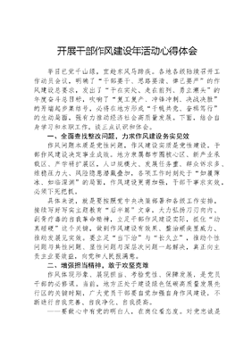 开展干部作风建设年活动心得体会举目已觉千山绿,宜趁东风马蹄疾。各地各级陆续召开工作动员会议,明确了干部要干、思路要清、律己要严的作风建设总要求,发出了干在实处、走在前列、勇立潮头的年度奋斗总目标,吹响了复工复产、冲锋冲刺、决战决胜的开端起步集结号,必将在地方形成千帆共竞、奋楫笃行的生动局面,强有力推动经济社会高质量发展。下面,结合自身学习和本职工作,谈三点认识和体会。一、全面查找整改问题,力求作风建设务实见效作风问题本质是党性问题,作风建设实质是党性建设,干部作风建设决定事业成败。地方隶属都市圈核心区、新产业承载区、产学研扩展区,人口规模大、发展任务重、群众诉求多、维稳压力大、风险隐患潜藏叠加,各项工作时刻处于如履薄冰、如临深渊的局面,作风建设更需加强,干部干事求实效,必须下死把抓。具体来说,就是要按照党中央决策部署和各级工作安排,接续写好写实主题教育后半篇文章,大力弘扬刀刃向内、刮骨疗毒的自我革命精神,立足干部作风建设实际,抓住动真碰硬这个关键,做到作风建设有效果、整治顽疾显威力、推动发展见实效。要立足当下治与长久立,推动个性问题与共性问题、显性问题与深层次问题一起解决,真正向主责主业要效益,向党和人民报满意。二、增强担当精神,敢于攻坚克难作风体现形象、展现担当、考验党性、保障发展,是党员干部的必修课。当前,地方正处于建设绿色低碳高质量发展先行区的关键时期,广大党员干部要自觉加强自身作风建设,不断进行自我完善、自我净化、自我提高。——要做心中有党的明白人,在岗位看态度。对党忠诚是党员干部履职尽责的基本标准,必须用行动筑牢四个意识、坚定四个自信、做到两个维护、捍卫两个确立。要深入学习贯彻党的XXX精神以及系列全会精神,在上级决策部署上扣扣子,在责任履行上担担子,在推动发展上钉钉子,以对党的绝对忠诚向党中央看齐,永远同组织保持高度一致。——要做心中有戒的带头人,在路上看作风。要筑牢拒腐防变防线,始终保持身在舞台中央、聚光灯下、放大镜下和旁若有人、常若有人的警醒,清清白白做人,干干净净做事,带出一支风清气正、有位有为的政法铁干部队伍。——要做心中有责的开路人,在状态看效果。干部就要有担当,有多大担当才能干多大事业,尽多大责任才会有多大成就。必须精准锚定国家战略布局,深度践行地方发展体系布局,高举事争一流、唯旗是夺攻坚大旗,始终坚持发展是第一要务,民生是第一目标,安全稳定是第一责任,勇于自我加压、敢于攀高比强,干就干大事、争就争一流,在对标找差中瞄准标杆,在追赶标杆中成为标杆,书写更多超越过去、超越对手的精彩篇章。要坚持有解思维,践行创新之举,深度聚焦群众急难愁盼,想路子、拿办法、抓落实,敢于打破思想上的误区、开拓观念上的盲区、探索稳定上的难区,努力争做高质量发展的先行者、绿色低碳发展的探索者、安全发展的带头者,以干在实处、走在前列,敢为人先、勇立潮头的工作状态,打造更多部门样板、地方风采。三、对标先进,解放思想,全面提升工作质量加强作风建设,就是要在日常攻坚中去开展,在争先进位上去检验,在群众反馈上去衡量。大会表扬了一些正面典型,也通报了负面典型。耀眼的成绩是干出来的,是有目共睹的,是经得起党和人民检验的。如果落实差、标准低、纪律散、服务粗,那什么事也干不成、干不好、干不利索,最后只会留下一地鸡毛一串笑柄一生遗憾。要立足地方工作大局,多干实事,多办大事,多解难事,多抓要事,把自己看文可居文库——海量学习资料,手机电脑下载www.wenkeju.com得低一些,把工作和人民看得高一些,坚持对上负责与对下负责相统一,切实用工作实效检验作风建设成果。——要在解决问题上走在前。坚持培树有解思维,不为既有经验所束缚,不为传统模式所制约,不为常规眼光所局限,敢于打破思想上的误区、开拓观念上的盲区、探索体制上的难区、突围机制上的禁区,努力争做改革开放的先行者、大胆创新的探索者、率先发展的带头者,以创新有为建设更高水平创新型城市,以机遇意识加快重大战略工程建设,以系统观念深化海陆联动、产业融合、乡村振兴,以历史耐心推进产业升级、万项技改、万企转型,纵深推进工业2.0,全面塑造高质量发展新优势。——要在深化改革上走在前。坚持推进试点探索与鼓励基层创造相结合,聚焦营商环境、生态保护、社会治理、民生保障等重点领域,努力创造更多地方特色、形成更多地方案例、打造更多地方样板。要加大开放融入力度,全新吸引、利用外资,大力推动产业链招商,吸引更多制造业外资项目落地。创新拓展利用外资方式,加快合格境外有限合伙人试点,办好经贸洽谈会,为外商来地投资提供最大程度的便利。——要在担当作为上走在前。各行各业、各条战线都要强化争先意识、激扬开拓精神