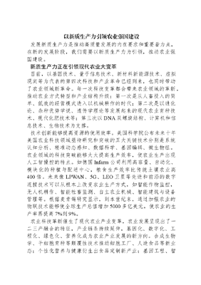 以新质生产力引领农业强国建设发展新质生产力是推动高质量发展的内在要求和重要着力点,在新的发展阶段,我们需要以新质生产力为引领,推动农业强国建设。新质生产力正在引领现代农业大变革目前,以基因技术、量子信息技术、新材料新能源技术、虚拟现实等为代表的第四次科技和产业革命已经到来,也同时带动了农业领域新革命。每一次科技变革都会带来农业领域的革新,推动农业方式转型和产业结构升级:第一次是从人畜投入的简单、低效的经营模式进入以机械耕作的时代;第二次是以进化论、杂种优势学说、遗传学理论等发展起来的现代农业育种技术、现代化肥技术等;第三次以DNA双螺旋结构、计算机和信息技术、生物技术为支撑。技术创新能够提高资源的使用效率。美国科学院公布未来十年美国农业科技领域亟待研究和突破的五大关键技术分别是系统认知分析、精准动态感知、数据科学、基因编辑、微生物组。农业领域的科技突破能够大大提高生产效率,使农业生产出现人工智操控的特点。如德国Infarm公司利用高容量、自动化、模块化的种植与配送中心,粮食生产效率比传统土壤农业高400倍。未来像LPWAN、5G、LEO卫星等先进和前沿的数字连接技术可以从根本上改变农业生产方式,如智能作物监控,无人机耕作、智能牲畜监测、自主农业机械、智能建筑与设备管理等。根据麦肯锡研究显示,到本世纪末,通过加强农业的物联技术能够使全球生产总值增加5000多亿美元,使农业的生产率再提高7%到9%。农业科技革新催生了现代农业产业变革,农业发展呈现出了一二三产融合的特征,产业链条持续延伸,基因化、数字化、工程化、绿色化、营养化成为农业产业发展的新方向。合成生物学、干细胞育种等颠覆性技术推动细胞工厂、人造食品等新业态;个性化营养与健康衍生出食品定制新产业;基因工程、智能装备极大压缩了农业的自然属性;全链条协同创新推动农业生产绿色低碳、可持续发展新态势。新质生产力发展不足是我国农业强国建设的最大短板我国是农业大国,但还不是农业强国。在过去的60年里,我国农业经济保持着高速增长,农业总产值占全球农业总产值的22.5%,位列第一。但有测算显示,我国农业强国整体实现度为67.2%。对标新质生产力和现代农业强国的特征,我国农业在生产效率、科技创新、高水平人才支撑等方面与发达国家还存在一定的差距。主要表现在以下几个方面.一是与农业发达国家相比,我国农业劳动生产率处于较低水平。2021年我国农业就业人数占就业总人数的比重为24%,加拿大、美国等农业强国仅为1%-3%。我国约以24%的农业劳动力产出仅占GDP的6%,而美国以1.4%农业劳动力产出总GDP的5%。农业劳动生产率的巨大差距,背后体现的,就是农业生产力水平的差距。二是前沿性科学技术发展滞后,缺乏重大原创性成果。虽然我国农业科技进步贡献率从2012年的54.5%提高至2022年的62.4%,但发达国家科技对农业的贡献普遍在80%左右。有研究显示,我国农业科技中国际领跑型技术仅占10%,并跑型技术占 39%,跟跑型技术占 51%。三是高水平农业科技人才支撑力度不足。据调查,我国高水平农业科学家比例是0.049‰,美国是0.738‰。当前我国高等农林教育人才培养存在传统人才较多、复合应用型少,整体素质相对偏低,高层次创新型人才匮乏等问题。以上分析显示,要使我国进入全球农业强国第一方阵,依靠传统、常规生产力水平的提升远远不够。如果没有新质生产力引领,与农业发达国家相比,我国的农业现代化建设将如逆水行舟,不但不能缩小差距,差距还将越来越大。以新质生产力引领农业强国建设的着力点根据马克思主义生产力三要素论,生产力由劳动手段、劳动力、文可居文库——海量学习资料,手机电脑均可下载www.wenkeju.com劳动对象三要素构成。以新质生产力引领农业强国建设,必须在这三个方面系统着力。一是着力提升前沿农业科技水平。前沿农业科技是以现代生物技术、信息技术、工程技术、人文社会科学技术交叉融合为特征的大农科,以跨领域、高技术融合为特征,涉及到信息工程、基因编辑、合成生物学等颠覆性技术。以生物制造为例,据预测,全球生物制造产值接近30万亿美元,被认为具有引领第四次工业革命的潜力,是世界各国竞争的热点。我国也把生物制造列为重点发展的战略性新兴产业。类似这种农业和生物科技领域的新质生产力,必须成为未来我国农业科技需要着力突破的领域。二是着力强化创新性人才培养。新质技术的创新、掌握、使用都需要新质人才。需要大力培养具有原创精神、具备交叉学科素养、掌握前沿科技的高素质创新性人才。目前涉农人才的培养中,较为普遍地存在知识体系陈旧、知识结构过窄、创新能力不足等问题,不能很好适应新质生产力发展的需要。三是着力发展涉农新业态。涉农领域新质生产力的发展,将拓展农的边界由第一产业向第二、第三产业延伸,引