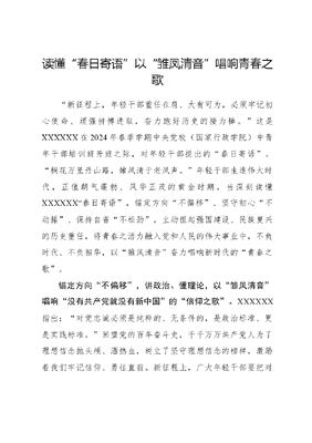 读懂春日寄语以雏凤清音唱响青春之歌新征程上,年轻干部重任在肩、大有可为,必须牢记初心使命、顽强拼搏进取,奋力跑好历史的接力棒。这是XXXXXX在2024年春季学期中央党校(国家行政学院)中青年干部培训班开班之际,对年轻干部提出的春日寄语。桐花万里丹山路,雏凤清于老凤声。年轻干部生逢伟大时代,正值朝气蓬勃、风华正茂的黄金时期,当深刻读懂XXXXXX春日寄语,锚定方向不偏移、坚守初心不动摇、保持自省不松劲,主动担起强国建设、民族复兴的历史重任,将青春之活力融入党和人民的伟大事业中,不负时代、不负韶华,以雏凤清音奋力唱响新时代的青春之歌。锚定方向不偏移,讲政治、懂理论,以雏凤清音唱响没有共产党就没有新中国的信仰之歌。XXXXXX指出:对党忠诚必须是纯粹的、无条件的,是政治标准、更是实践标准。回望党的百年奋斗史,千千万万共产党人为了理想信念抛头颅、洒热血,树立了坚守理想信念的榜样,激励着我们牢记信仰、勇往直前。新征程上,广大年轻干部要把对党忠诚作为根本政治要求,不能只挂在嘴上、写在纸上,必须体现到工作学习生活等具体行动中,真正做到表里如一、知行合一,永葆对党忠诚的政治本色。理论上清醒,政治上才能坚定。一方面,要在学上下苦功夫,坚持多思多想、学深悟透,不断增进对党的创新理论的政治认同、思想认同、理论认同、情感认同。另一方面,要坚持学以致用,把对党忠诚体现到贯彻落实好党中央决策部署的实际行动上,与履职尽责相统一,与担当作为相结合,与纪律要求相一致,真抓实干、务求实效,聚焦问题、知难而进,以时时放心不下的责任感和知重负重、狠抓落实的精气神种好、管好、守好党组织交给的责任田,真正把党的根本宗旨和理想信念落到实处,以新气象新作为全面推动高质量发展取得新成效。坚守初心不动摇,念民生、办实事,以雏凤清音唱响世界上最大的幸福莫过于为人民幸福而奋斗的为民之歌。XXXXXX强调,忘记了人民,脱离了人民,我们就会成为无源之水,无本之木,就会一事无成。一直以来,人民群众都是我党的执政之基、力量之源,为中国人民谋幸福是我们永恒不变的为民初心。不论是不忘初心、未负韶华为扶贫事业奉献青春的黄文秀,还是扎根贫困山区一线用自己照亮梦想的燃灯校长张桂梅,她们都以实际行动诠释文可居文库——海量学习资料,手机电脑均可下载www.wenkeju.com了我将无我、不负人民的崇高情怀。当前,我国已经进入了新的发展阶段和纵深推进乡村振兴的关键时刻,我们年轻干部理应心怀国之大者、牢记初心使命,清醒认识到我是谁、为了谁、依靠谁,时刻坚持以人民为中心的思想,放下架子、扑下身子,接地气,通下情,用显微镜去了解、收集和解决群众反映的问题,不放过任何蛛丝马迹,用心用情办好民生小诉求,把群众满不满意作为衡量工作的标尺,以咬定青山不放松的定力做出经得起实践和历史检验的实绩,以钉钉子的精神全身心投入到乡村振兴和祖国发展的伟大实践中来,用实际行动坚守我们共产党人永恒不变的初心。保持自省不松劲,强自律、守底线,以雏凤清音唱响清正廉洁是共产党人的永恒价值追求的清廉之歌。新松恨不高千尺,恶竹应须斩万竿。腐败是危害党的生命力和战斗力的最大毒瘤,反腐败是最彻底的自我革命。广大年轻干部必须充分发扬彻底的自我革命精神,对标党风要求找差距、对表党性要求查根源、对照党纪要求明举措,严格落实中央八项规定及其实施细则精神,自觉系好廉洁从政的第一粒扣子,常用后视镜审视自身暗处,做到多反思、多总结,不断增强政治敏锐性和政治鉴别力,严格遵守政治纪律和政治规矩,坚持以德正心、净化社交圈,以慎正行、净化工作圈,文可居文库——海量学习资料,手机电脑均可下载www.wenkeju.com以洁正身、净化生活圈,以慎独慎初慎微慎友练就百毒不侵金钟罩。面对工作中的灰色地带,要自觉践行三严三实,念好克己奉公紧箍咒,筑好自身廉政墙、算清得失长远账,无论何时何地,都能既在大是大非面前不越雷池,又在小事小节面前不触红线,始终将人民的满意度设为特别关注,正确对待和行使权力,主动接受组织、社会和群众监督,做到心中有底线、为政不越线,以干净有为的实际行动彰显新时代青年干部的清廉底色。文可居文库——海量学习资料,手机电脑均可下载www.wenkeju.com