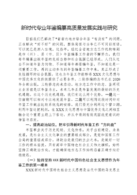 新时代专业年鉴编纂高质量发展实践与研究目前我们已解决了*省省内地方综合年鉴有没有的问题,正在解决好不好的问题,整体局面与当年已不可同日而语,可以说已是渐入佳境。这些年,经过全省地方志工作机构特别是市(州)、县(市、区)年鉴编纂工作者的不懈努力,我们每年编纂出版年鉴的良好态势和社会氛围已经形成。人们从过去不知道年鉴为何物、不知道每年都要编年鉴,不知道这是一项重要工作,再到主动参与到年鉴编纂工作中来,真正形成了良性循环的社会氛围。这也为年鉴工作能够将XXX文化思想与中国优秀文化传统提供了必要条件。二轮修编的志书已在2020年全部出版,三轮修志尚未启动。地方志工作中的志、鉴两项主业目前是以年鉴为主,未来几年正是年鉴发展的最好的历史机遇期。在这个历史机遇期,我们有这么两个优势。一是这一空窗期可以相对专注地发展年鉴。二是可以利用这段时间针对年鉴工作做出比较系统化的安排。我们要充分利用这个窗口期,利用年鉴这把利剑,在XXX文化思想与中国优秀文化之间相互融合这个重要主题上下苦功,并从中得到有效巩固我党意识的借鉴与启发。一、提高政治站位,把牢引导新时代年鉴工作方向盘年鉴事业关乎历史延续、文化传承,关乎当前建设、未来发展,是社会主义文化事业的重要组成部分,是党和国家工作全局的重要组成部分。讲政治是我们的立业之本,是做好一切工作的根本前提。只有高举中国特色社会主义伟大旗帜,始终坚持正确政治方向,才能确保地方志工作始终沿着正确方向行稳致远。(一)始终坚持XXX新时代中国特色社会主义思想作为年鉴工作的第一根本XXX新时代中国特色社会主义思想是当代中国的马克思主义、**世纪的马克思主义,是引领中国特色社会主义新时代的纲领、旗帜和灵魂,是全党全国人民为实现中华民族伟大复兴而奋斗的行动指南,是我们必须长期坚持的指导思想。坚持以XXX新时代中国特色社会主义思想为指导,是新时代地方志事业始终沿着正确方向不断前进的根本保证,是我们做好各项工作的强大思想武器。全省地方志系统干部职工要树牢四个意识、坚定四个自信、做到两个维护,不断增强政治判断力、政治领悟力、政治执行力,严守政治纪律和政治规矩,始终在政治立场、政治方向、政治原则、政治道路上同以XXX同志为核心的党中央保持高度一致。(二)始终坚持中国共产党对年鉴工作的绝对领导东西南北中,党政军民学,党是领导一切的。中国共产党领导是中国特色社会主义最本质的特征,中国共产党是国家最高政治领导力量,是实现中华民族伟大复兴的根本保证。作为党委政府领导下履行为党立言、为国存史、为民修鉴的地方志工作部门,要坚决拥护党的领导、执行党的路线、落实党的政策,主动承担起记录新时代、书写新时代的使命,通过地方志成果和宣传平台,教育引导人民群众深刻认识历史和人民选择中国共产党、选择马克思主义、选择社会主义道路、选择改革开放的历史必然性,正确认识社会主义事业的长期性、艰巨性和光明前途,充分彰显社会主义制度的强大生命力和巨大优越性,切实增强实现中华民族伟大复兴的坚定信心和必胜信念,增强人民群众的政治认同、民族认同、道路认同、理论认同、制度认同、文化认同。(三)始终把意识形态工作嵌入年鉴工作主阵地意识形态工作关乎旗帜,关乎道路,关乎国家政治安全,决定文化前进方向和发展道路,对一个政党、一个国家、一个民族的生存发展至关重要,是一项极端重要的工作。年鉴编纂部门是意识形态工作重要部门,要坚持马克思主义在意识形态领域的指导地位,把好政治关口、站稳政治立场,增强政治敏文可居文库——海量学习资料,手机电脑均可下载www.wenkeju.com锐性,及时甄别和发现各种形式的低级红高级黑;始终以唯物史观为指导,发扬斗争精神,增强斗争本领,坚决抵制和反对历史虚无主义等错误思想,全面系统、客观真实记录历史,打造无愧于时代、无愧于历史、无愧于人民的精品佳志。要加强网站、期刊、新媒体等舆论阵地管理,唱响主旋律、弘扬正能量,对错误思想、错误思潮、错误言论,敢于亮剑、敢于抵制、敢于斗争,加强中华优秀传统文化、革命文化、社会主义先进文化和XXX思想文化宣传弘扬,积极培育和践行社会主义核心价值观,牢牢守住意识形态主阵地。二、打开思想格局,准确把握新时代年鉴工作历史新脉搏有这样一句谚语:眼界决定格局,你的目光所及处,就是你将来的去处。格局决定高度。对个人来说,心有多大,舞台就有多宽;对一项事业来说,格局有多大,事业就有多广。我们要准确把握新时代地方志事业面临的新机遇,构建大方志格局,坚定方志人自信,履行好新时代方志人的光荣使命。(一)抓准新时代年鉴新机遇新中国成立后特别是党的十八大以来,党和国家高度重视历史文化,高度重视年鉴编修。XXXXXX在首都博物馆考察时说,要高度重视修史修志,让文物说话、把历史智慧告诉人们,激发我们的民族自豪