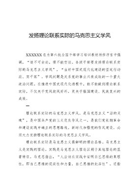 发扬理论联系实际的马克思主义学风XXXXXX在为第六批全国干部学习培训教材所作序言中强调,道不可坐论,理不能空谈。各级干部要发扬理论联系实际的马克思主义学风,当好中国式现代化建设的坚定行动派、实干家。学风问题是关系党的事业兴衰成败的一个重大政治问题。在推进中国式现代化进程中,能不能做到理论联系实际,不仅关乎党风政风好坏,更关乎强国建设、民族复兴的成败。一理论联系实际的马克思主义学风,是马克思主义活的灵魂,是中国共产党的三大优良作风之一,是我们党长期革命和建设实践中确立的思想路线。新时代加强党的作风建设,必须大力发扬理论联系实际的马克思主义学风。理论联系实际是马克思主义最鲜明的理论品格。马克思主义是实践的理论。实践是马克思主义理论区别于其他理论的显著特征。马克思指出,人应该在实践中证明自己思维的真理性,即自己思维的现实性和力量,自己思维的此岸性。还指出,不论在自然科学或历史科学的领域中,都必须从既有的事实出发,因而在自然科学中必须从物质的各种实在形式和运动形式出发;因此,在理论自然科学中也不能虚构一些联系放到事实中去,而是要从事实中发现这些联系,并且在发现了之后,要尽可能地用经验去证明。马克思逝世后,恩格斯立足资本主义世界出现的新变化,要求各国无产阶级政党必须根据实际及时调整指导策略,把科学共产主义理论当成活的行动理论,即同工人阶级在其每个可能的发展阶段一道工作的理论。他强调,马克思的整个世界观不是教义,而是方法。它提供的不是现成的教条,而是进一步研究的出发点和供这种研究使用的方法,尤其要深入研究本国无产阶级解放的实际条件。类似论述在经典作家著作中俯拾皆是,彰显出马克思主义者唯实求真的理论品格和科学精神。理论联系实际是推进马克思主义中国化时代化的必然要求马克思主义中国化时代化的过程,就是一个理论联系实际的过程。毛泽东同志曾提出,只有用马克思主义观点来研究实际问题、能解决实际问题的,才算实际的理论家。XXXXXX深刻指出,我们坚持理论联系实际,及时回答时代之问、人民之问,廓清困扰和束缚实践发展的思想迷雾,不断推进马克思主义中国化时代化大众化,不断开辟马克思主义发展新境界,文可居文库——海量学习资料,手机电脑均可下载www.wenkeju.com我们要强化问题意识、时代意识、战略意识,用深邃的历史眼光、宽广的国际视野把握事物发展的本质和内在联系,紧密跟踪亿万人民的创造性实践,借鉴吸收人类一切优秀文明成果,不断回答时代和实践给我们提出的新的重大课题,让当代中国马克思主义放射出更加灿烂的真理光芒。XXX新时代中国特色社会主义思想继承和发扬了马克思主义理论品格和理论精髓,深深植根于党领导人民进行具有许多新的历史特点的伟大斗争、以中国式现代化全面推进中华民族伟大复兴、积极构建人类命运共同体的丰富实践之中,科学回答了中国之问、世界之问、人民之问、时代之问。理论联系实际是马克思主义中国化时代化的必要条件,是持续推进理论创新的必然逻辑。理论联系实际是确保党的事业兴旺发达、推进中国式现代化的现实需要。XXXXXX指出:我们党的历史反复证明,什么时候理论联系实际坚持得好,党和人民事业就能够不断取得胜利;反之,党和人民事业就会受到损失,甚至出现严重曲折。一百多年来,中国共产党人坚持运用马克思主义立场观点方法,分析中国革命、建设、改革实践中遇到的实际问题,团结带领人民接续奋斗,不断开创党和国家事业发展新局面。各级领导干部必须牢记XXXXXX殷殷嘱托,更加自觉地掌握运用好党的创新理论这一强大思想武器,紧紧围绕以中国式现文可居文库——海量学习资料,手机电脑均可下载www.wenkeju.com代化全面推进强国建设、民族复兴伟业这个中心任务,在根本性方向性原则性的问题上旗帜鲜明、不迷失方向、不犯颠覆性错误,以真理指导实践,创造性开展工作,不断把党的XXX描绘的宏伟蓝图变成美好现实。理论联系实际是传承弘扬中华优秀传统文化、建设中华民族现代文明的应有之义。理论联系实际的思想方法和优良传统,既来源于马克思主义理论体系和中国共产党政治文化,也是对中华优秀传统文化的继承和发展,是中华文明的智慧结晶。一方面,中国古代先贤认为知是行的基础和前提,指出知先行后,知是行的主意;另一方面,也重视行的作用,指出行是知的功夫,不闻不若闻之,闻之不若见之,见之不若知之,知之不若行之,知者行之始,行者知之成,特别是格物致知、知行合一等思想,既强调良知与言行的高度统一性,也蕴含着理论与实践的紧密联系性,对中国传统文化和现代社会都产生了深远影响。只有坚持理论联系实际,推动中华优秀传统文化创造性转化、创新性发展,才能更好地为建设中华民族现代文明提供思想储备和文化滋养。二XXXXXX指出:学