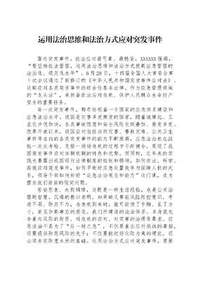 运用法治思维和法治方式应对突发事件面对突发事件,依法应对最可靠、最稳妥。XXXXXX强调,要坚持依法管理,运用法治思维和法治方式提高应急管理的法治化、规范化水平。6月28日,十四届全国人大常委会第十次会议通过了新修订的《中华人民共和国突发事件应对法》。这部应对各类突发事件的综合性基本法律,作为应急管理领域的龙头法,承担着依法应对危机、保护人民群众生命财产安全的重要任务。 每一次突发事件,都在检视着一个国家的应急体系建设和应急法治水平。我国是灾害多发频发的国家,随着城镇化、工业化步伐加快,各类事故隐患和安全风险交织叠加、易发多发。改革开放以来,我国应对包括自然灾害、事故灾难、公共卫生事件等在内的各类突发事件的能力不断提高,应急法治也在战胜一次次考验、克服一场场危机的过程中不断健全,展现了我国突发事件应对体制机制的特色和优势。但同时,近年来的实践也暴露出我国现行法律制度的短板和弱项,如何依法、科学、高效应对突发事件,如何平衡好应急处置效率与保障人权的关系,领导干部如何补好应急法治观念和能力这门课,成为摆在我们面前的现实问题。 居安思危、未雨绸缪,这既是一种生活经验,也是公共治理的智慧。沉痛的教训表明,如果缺乏事前风险防控意识,考虑不周、防范不力,当危机到来时,就可能慌了手脚、乱了方寸,甚至加剧事态的恶化。我们所建设的法治体系,本身就包含着对风险的防范、对危机的应对、对灾害的