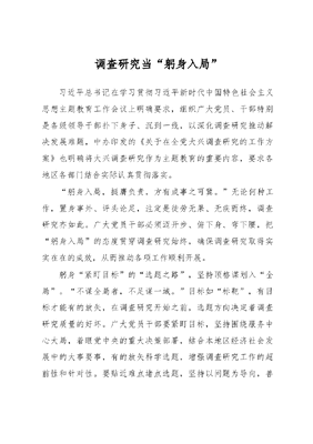 调查研究当躬身入局习近平总书记在学习贯彻习近平新时代中国特色社会主义思想主题教育工作会议上明确要求,组织广大党员、干部特别是各级领导干部扑下身子、沉到一线,以深化调查研究推动解决发展难题,中办印发的《关于在全党大兴调查研究的工作方案》也明确将大兴调查研究作为主题教育的重要内容,要求各地区各部门结合实际认真贯彻落实。躬身入局,挺膺负责,方有成事之可冀。无论何种工作,置身事外、评头论足,注定是徒劳无果、无疾而终,调查研究亦如此。广大党员干部必须迈开步、俯下身、弯下腰,把躬身入局的态度贯穿调查研究始终,确保调查研究取得实实在在的成效,从而推动各项工作顺利开展。躬身紧盯目标的选题之路,坚持顶格谋划入全局。不谋全局者,不足谋一域。目标如标靶,有目标才能有的放矢,在调查研究开始之前,选题方向决定着调查研究质量的好坏。广大党员干部要紧盯目标,坚持围绕服务中心大局,着眼党中央的重大决策部署,结合本地区经济社会发展中的大事要事,有的放矢科学选题,增强调查研究工作的超前性和针对性。要贴近难点堵点选题,坚持以问题为导向,善于从工作之中发现问题,并抓住关键领域、关键问题、关键环节进行调查研究,围绕工作中的堵点、痛点、难点问题从不同侧面、不同角度深入开展调查研究,提高调研成果的转化率。躬身深入一线的答题之路,坚持务实作风入大局。涉浅水者得鱼虾,涉深水者得蛟龙。调查研究必须坚持党的群众路线,从群众中来、到群众中去。广大党员干部要走到基层一线看实情、听心声、问冷暖,迈开双脚多走,带上耳朵多听,亲身体验、直面问题,才能掌握最真实、最客观的情况,为理性判断、科学决策奠定基础。同时切忌将深入基层误解为大下基层,避免频繁下基层,从而给基层增添负担,要坚决不搞花架子、避免走过场,才能更好杜绝形式主义、官僚主义作风。要坚持科学统筹、注重依法规范,确保调研规范有序地推进展开,让调研取得实际成效。躬身回头看看的总结之路,坚持成果转化入新局。毛泽东同志在《反对本本主义》中指出:调查就像十月怀胎,而解决问题就像一朝分娩,调查就是解决问题。调查研究既要善于发现问题,更要注重解决问题。要拿出一竿子插到底的精神,对调查中发现的各种问题难题进行细致剖析,有针对性地提出整改指导意见,把准整改方向,更要持续对整改结果进行回头看,真正把调查研究工作的成果巩固好、运用好。要总结出好的经验、提出好的措施、制定好的政策并及时运用到具体问题、对应工作中,同时在运用的过程中要结合实际,不断改进和完善对策措施,确保最终能够解决实际问题,更好地满足人民群众的新期待。