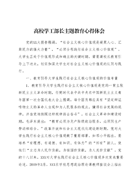 高校学工部长主题教育心得体会党的XX大报告强调,社会主义核心价值观是凝聚人心、汇聚民力的强大力量,必须全程践行社会主义核心价值观。大学生正处于价值观形成和确立的关键时期,需要高校从教育引导上下功夫,切实加深大学生对社会主义核心价值观的认同与践行。一、教育引导大学生践行社会主义核心价值观的价值考量1.教育引导大学生践行社会主义核心价值观是党的一贯主张新民主主义革命时期,任弼时代表中共中央在中国新民主主义青年团第一次全国代表大会上强调,每个团员都应具有坚定辩证唯物主义的革命人生观和为人民服务的观点,懂得社会发展的规律,并自觉地按照这种规律而去奋斗。社会主义革命和建设时期,毛泽东提出:教育必须为无产阶级政治服务,必须同生产劳动相结合。改革开放和社会主义现代化建设新时期,党对大学生践行社会主义核心价值观做了重要部署,如邓小平指出,要培养有理想、有道德、有知识、有体力的四有新人,使他们立志为人民作贡献,为祖国作贡献,为人类作贡献。党的十八以来,XXX对大学生践行社会主义核心价值观多次发表重要论述。2019年3月,XXX在学校思想政治理论课教师座谈会上指出大学生要把爱国情、强国志、报国行自觉融入坚持和发展中国特色社会主义事业、建设社会主义现代化强国、实现中华民族伟大复兴的奋斗之中。由此可见,在中国共产党从站起来、富起来到强起来的历史进程中,教育引导大学生积极践行社会主义核心价值观始终是我们党的一贯主张。2.教育引导大学生践行社会主义核心价值观是检验高等教育质量水平的根本标准。高等教育有着极强的阶级属性、政治属性任何国家、任何社会,维护其社会统治、政治稳定的重要途径之一是教育。我们党办高等教育,就是要教育培养大学生正确认识世界和中国发展大势,从党探索中国特色社会主义历史发展和伟大实践中,认识和把握人类社会发展的历史必然性,认识和把握中国特色社会主义的历史必然性;正确认识时代责任和历史使命脚踏实地、珍惜韶华,把远大抱负落实到实际行动中。随着新时代新征程的开启,我们对高等教育的需要比以往任何时候都更加迫切,对科学知识和卓越人才的渴求比以往任何时候都更加强烈。这就要求高等教育一定要抓住机遇、超前布局,以更高远的历史站位、更宽广的国际视野、更深邃的战略眼光,以德立人以德施教,将大学生时刻听从党的召唤、积极践行社会主义核心价值观作为检验高等教育质量的标准。如此,方能确保高等教育培养出来的大学生是能够用脚步丈量祖国大地,用眼睛发现中国精神,用耳朵倾听人民呼声,用内心感应时代脉搏,把对祖国血浓于水、与人民同呼吸共命运的情感贯穿学业全过程、融汇在事业追求中的合格建设者和可靠接班人。否则,高等教育便难以保持正确的前进方向,失去其存在的意义。3.教育引导大学生践行社会主义核心价值观是其自身成长的需要。大学生正处在拔节孕穗期,高校应加强对大学生践行社会主义核心价值观的教育引导,促使其将社会主义核心价值观转化为自身成长的需要。践行社会主义核心价值观前提是认知认同,只有认知认同才能自觉践行。高校在对大学生进行社会主义核心价值观教育时,首要解决的是社会主义核心价值观知的问题,引导大学生在成为社会主义核心价值观学习者、宣传者的同时,自觉成为社会主义核心价值观的践行者、先行者。总之,高校应帮助大学生加深对所掌握的社会主义核心价值观的正确认知,进而由易到难、由近及远,努力把社会主义核心价值观的要求变成日常的行为准则,成为自觉奉行的信念理念。二、教育引导大学生践行社会主义核心价值观的问题探析1.教育引导大学生践行社会主义核心价值观的主体力量尚需增强。高校教育引导大学生践行社会主义核心价值观的主体力量是思想政治工作者,包括思想政治理论课教师和辅导员等。党的十八大以来,党中央十分重视高校思想政治工作队伍建设,印发了许多规范性的文件。各地各高校逐步按要求落实辅导员、思政课教师等队伍的编制配备和待遇保障,并取得较大成效,如大多数高校专兼职辅导员总量达到中央规定的1:200配备要求。与此同时,我们也要看到教育引导大学生践行社会主义核心价值观距离党和国家的要求尚存在一定差距。例如,各高校的思想政治工作队伍建设质量参差不齐,难免会影响思想政治工作的效果。部分思想政治工作者缺乏爱岗敬业精神,没有把大学生践行社会主义核心价值观教育看成为党育人、为国育才的重要组成部分部分思想政治工作者仅仅把社会主义核心价值观教育当成了知识传授,教学全过程未能很好地实现知行合一,无法很好地帮助大学生将社会主义核心价值观转化为知识体系,进而转化为信仰体系;部分思想政治工作者不能以德立身、以德立学、以德施教、以德育德,言传与身教相脱离,人格力量不够,无法为大学生践行社会主义核心价值观起到推动和鼓舞作用。2.教育引导大学生践行社会主义核心价值观的实际做法尚需更实。