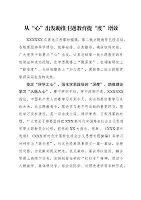 从心出发助推主题教育提度增效XXXXXX在黑龙江考察时强调,第二批主题教育已经启动,各地要坚持科学谋划、统筹安排、分类指导,确保取得实效。广大党员干部要从心出发,认真总结第一批主题教育的有效做法和成功经验,在学思践悟上强深度、在调查研究上提准度、在检视整改上加力度,助推第二批主题教育取得实实在在的成效。坚定好学之心,强化学思践悟的深度,助推理论学习入脑入心。理不学则不知,学不深则不通。XXXXXX指出,中国共产党人依靠学习走到今天,也必然要依靠学习走向未来。在主题教育中,理论学习是不可或缺的重要环节,理论学习没有捷径,是一项由浅入深、循序渐进、日积月累的过程,广大党员干部要坚持把XXX新时代中国特色社会主义思想贯穿主题教育全过程,把党的XX大报告、党章、《XXX著作选读》《XXX新时代中国特色社会主义思想专题摘编》等学习材料作为案头卷,对这些经典原著原文一篇一篇读,逐段逐句悟,自觉做到既见树木,也见森林。要在学以致用、融会贯通上持续下功夫,发扬刻苦钻研的钉钉子精神,通过个人精读学、集体研讨学、结合实际学、对照先进学等多种形式,全方位、立体化强化理论学习,切实将学习成果转化为干事创业的实际本领。淬炼为民之心,提高发现问题的准度,助推调查研究走深走实。调查研究是我们党的优良传统,是学习贯彻XXX新时代中国特色社会主义思想主题教育的重要内容,因此,开展第二批主题教育必须进行大兴调查研究之风,扎扎实实练好调查研究基本功。广大党员干部要认真总结第一批主题教育在开展调查研究过程中采用的好形式、形成的好经验,本着一切从实际出发的原则,敢于正视问题,善于发现问题,既要身入基层,更要心到基层,既看高楼大厦又看背阴胡同,真正把群众面临的问题发现出来,把群众的意见反映上来。要坚决杜绝作秀式调研、盆景式调研、蜻蜓点水式调研,多走自选路线、多找盲点盲区,深入到困难较多、情况复杂、矛盾尖锐的地方开展调查研究,找准问题症结之源,从而确保调研取到真经,全面准确掌握基层一线真实情况。锚定实干之心,加大问题查摆的力度,助推检视整改见行见效。XXXXXX强调,要坚持边学习、边对照、边检视、边整改,把问题整改贯穿主题教育始终,让人民群众切实感受到解决问题的实际成效。主题教育开展得好不好,主要看检视问题、整改问题彻不彻底、到不到位。发现问题是起点,整改落实是关键。广大党员干部要严格对照党章党规党纪、对照初心使命、对照党中央部署要求,主动把思想摆进去、把工作摆进去、把作风摆进去,深入查找自身思想上的差距、实践中的不足、作风上的问题,整理形成全面准确的问题清单。要坚持当下改与长久立相结合,分类整改与集中整治相结合,对查摆出来的差距、短板与不足,逐项制定整改措施,既立足当前,立行立改、即知即改,又着眼长远,盯住不放、持续整改,坚决做到不解决不松劲、不到位不放手,切实把问题清单转化为成效清单。