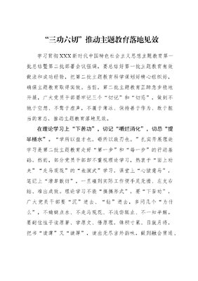 三功六切推动主题教育落地见效学习贯彻XXX新时代中国特色社会主义思想主题教育第一批总结暨第二批部署会议强调,要总结好第一批主题教育有效做法和成功经验,把第二批主题教育科学谋划好精心组织好,确保主题教育取得实效。当前,第二批主题教育正蹄急步稳地开展,广大党员干部要牢记三个切记和切忌,做到不驰于空想、不骛于虚声,不履于薄冰、保持善于作为、敢于担当的常态,推动主题教育落地见效。在理论学习上下苦功,切记嚼烂消化,切忌提半桶水。学所以益才也,砺所以致刃也。扎实开展理论学习是第二批主题教育走好第一步和每一步的行动基础。然而,部分党员干部却不重视理论学习,热衷于面上功夫走马观花的表演式学习,课堂上心猿意马,笔记上潦草敷衍,一旦碰到实际工作便手足无措、左支右绌、难出成效。理论学习不能搞搞形式,要下苦功,广大党员干部要沉进去、钻进去,多问几个为什么,不蜻蜓点水、不走马观花、不浅尝辄止、不一知半解。要耐住性子读原著、学原文、悟原理,铢积寸累、日就月将,把书读薄又读厚,读出无尽言外韵味,做到融会贯通、学有所悟、悟有所得。在调查研究上下实功,切记脱虚向实,切忌做门外汉。知屋漏者在宇下,知政失者在草野。调查研究是我们党的传家宝,是做好各项工作的基本功。然而,现实中不乏一些党员干部不重视群众心声,沉溺于逢场作戏水中望月的作秀式调研,下乡调研坐在车上转、探访民情隔着玻璃看,一旦碰到实际工作便非推即躲、不敢承担、敷衍了事。调查研究不能走走过场,要下实功,多采取四不两直方式开展调研,深入田间地头,用倍镜下剖麻雀蹲下去看蚂蚁的调研态度,找深剖透问题的根与源,进一步整合所掌握材料,多角度、全方位了解调研地情况,理清解题思路、找出适用对策,最终把问题清单转化为成果清单。在检视整改上下硬功,切记求真务实,切忌吃夹生饭。不贵于无过,而贵于能改过。检视整改是党员干部强身治病、掸灰去尘、纠偏补差,保持肌体健康的锐利武器。然而,现实中不乏一些党员干部不愿自我剖析,热衷于纸上作业掩耳盗铃的虚假式整改,问题台账闭门造车,整改措施隔靴搔痒,一旦碰到棘手问题便六神无主、抓耳挠腮、无所作为。检视整改不能翻翻表皮,要下硬功,把准重实践、建新功的要求,着重从思想上找原因,在行动上抓落实,坚持当下改和长久立相结合,以刮骨疗毒壮士断腕的决心和毅力,对发现问题一项一项制定整改措施,能改的要即知即改、立行立改;一时解决不了的要盯住不放、持续整改,争取一次性解决,不留余毒。