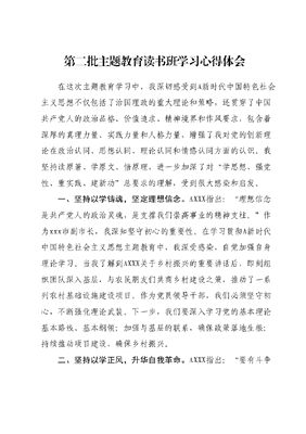 第二批主题教育读书班学习心得体会在这次主题教育学习中,我深切感受到A新时代中国特色社会主义思想不仅包括了治国理政的重大理论和策略,还贯穿了中国共产党人的政治品格、价值追求、精神境界和作风要求,包含着深厚的真理力量、实践力量和人格力量,增强了我对党的创新理论在政治认同、思想认同、理论认同和情感认同方面的认识。我坚持读原著、学原文、悟原理,进一步加深了对学思想、强党性、重实践、建新功总要求的理解,受到很大感染和启发。一、坚持以学铸魂,坚定理想信念。AXXX指出:理想信念是共产党人的政治灵魂,是支撑我们崇高事业的精神支柱。作为xxx市副市长,我深知坚守初心的重要性。在学习贯彻A新时代中国特色社会主义思想主题教育中,我深受感染,自觉加强自身理论学习。当我了解到AXXX关于乡村振兴的重要讲话后,即刻组织团队深入基层,与农民朋友们共商乡村建设之策,推动了一系列农村基础设施建设项目。作为党员领导干部,我们必须坚守初心,不断强化理论武装。下一步,我们要深入学习党的基本理论基本路线、基本纲领;加强与基层的联系,确保政策落地生根;持续推动项目建设,确保乡村振兴。二、坚持以学正风,升华自我革命。AXXX指出:要有斗争精神,不怕困难,勇于自我革命,始终保持清醒头脑。回想xxx市的发展历程,我们曾面临种种困难。但在学习贯彻A新时代中国特色社会主义思想主题教育的引导下,我们勇于自我革命,大力整顿内部作风,严肃查处了一批违纪违法问题,为xxx市的稳定发展打下了坚实基础。作为党员领导干部,我们必须严于律己勇于自我革命。下一步,我们要加强纪律建设,确保党员干部清正廉洁;深化作风建设,确保政府决策科学合理;推动经济发展确保xxx市持续繁荣。三、坚持以学增智,提升履职能力。AXXX指出:要增强学习本领,提高思想政治觉悟,不断提高综合素质。在我任职期间,xxx市在安全生产上取得了显著成绩。我们坚持定期组织安全生产培训,确保每位职工都能熟练掌握安全知识,大大降低了事故发生率。作为党员领导干部,我们必须不断提高自身素质。下一步,我们要持续组织各种培训活动,提升全体员工的综合素质加强安全生产管理,确保xxx市安全稳定;深化与群众的联系,确保政策贴近民生。四、坚持以学促干,推进乡村振兴。AXXX指出:乡村振兴关键在党。受此启示,在乡村振兴中,我们始终坚持党的领导在学习贯彻A新时代中国特色社会主义思想主题教育中,我们确定了一系列乡村建设方案,如支持农民发展特色种植业,成功吸引了大量游客,既提高了农民收入,又推动了乡村文化传承。作为党员领导干部,我们必须始终坚持党的领导。下一步,我们要加强党建工作,确保乡村振兴方向正确;支持农民创业创新,确保乡村经济持续发展;加强乡村文化建设,确保乡风文明。第二批主题教育读书班学习心得体会在这次主题教育学习中,我深切感受到A新时代中国特色社会主义思想不仅包括了治国理政的重大理论和策略,还贯穿了中国共产党人的政治品格、价值追求、精神境界和作风要求,包含着深厚的真理力量、实践力量和人格力量,增强了我对党的创新理论在政治认同、思想认同、理论认同和情感认同方面的认识。我坚持读原著、学原文、悟原理,进一步加深了对学思想、强党性、重实践、建新功总要求的理解,受到很大感染和启发。一、通过主题教育淬炼绝对忠诚的政治品格。AXXX指出:党员领导干部要做到两个维护,就要增强四个意识,坚定四个自信。在宁德市,我们坚持学习贯彻A新时代中国特色社会主义思想主题教育,明确发展方向。回首过去,当我在推进乡村振兴战略时,便深切感受到AXXX绿水青山就是金山银山的生动实践。例如,我们助力当地农民发展特色农业,打造一系列生态农业旅游项目,既增加了农民收入,又保护了绿水青山。作为党员领导干部,我们必须坚定政治立场,增强政治意识始终与党中央保持高度一致。下一步,我们要强化党的组织领导确保政策的贯彻落实;深入基层,听取群众意见,确保政策的有效执行;加强自身建设,确保始终保持与人民群众的血肉联系。二、通过主题教育历练担当作为的过硬本领。AXXX指出:真正的能力是在实践中锻炼出来的,真正的本领是在工作中培养起来的。宁德市在经济发展上,经历了许多的困难与挑战。学习贯彻A新时代中国特色社会主义思想主题教育后,我们明确了发展战略,大力支持中小企业创新发展。在此过程中,我们成功引进了多家技术型企业,为当地创造了大量的就业机会,并成功打造了一个技术创新高地。作为党员领导干部,我们必须增强四个意识,坚决贯彻AXXX的指导精神。下一步,我们要加强对中小企业的政策扶持,激发市场活力;进一步完善产业链,吸引更多的高新技术企业入驻;培训一批有知识、有能力、有担当的企业家,推动宁德经济持续稳定发展。三、通过主题教育锤炼力行严实的优良作风。AXXX指出:作风建
