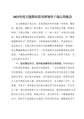 2023年度主题教育读书班领导干部心得体会自主题教育开展以来,各级党组织牢牢把握学思想、强党性、重实践、建新功的总要求,深入开展专题式学悟、课题式学研、主题式学践、问题式学改,以到一线去专项行动为载体,推动主题教育更加具有基础性、实践性与创新性。把强基铸魂彰显担当贯穿始终,不断提高政治判断力、政治领悟力、政治执行力,自觉从伟大思想中寻找破解发展难题的金钥匙将主题教育焕发出来的学习、工作热情转化为高质量发展的实际成效、干事创业的强大动力。下面,我结合自己的学习体会,与大家共同交流学习。一、强化理论学习,坚持读原著学原文悟原理。XXXXXX指出没有理论的高度,就没有行动的深度。这句话强调了理论学习的重要性。历史和实践都证明,深刻的理论学习是党员干部提高政治觉悟、政治能力的基础。我们党的历史就是一部用马克思主义基本理论武装头脑、指导实践的历史。在当前的工作中,读原著、学原文、悟原理是我们深化理论学习的有效途径。作为党员干部,我们要持续深入学习党的创新理论,特别是XXX新时代中国特色社会主义思想;要通过研讨、培训等形式,不断提高理论水平;要把学习成果转化为推动工作的实际行动,确保理论学习得到落实。二、厚植为民情怀,坚持全心全意为人民服务。XXXXXX强调要始终坚持以人民为中心的发展思想。这句话是我们党的根本宗旨的体现。无论是革命、建设还是改革,我们党都始终站在人民的立场上,从人民的需求出发,解决人民的痛点、难点问题在工作中,我们坚持把人民群众的利益放在首位,如在公共服务提供、基础设施建设等方面,我们始终坚持以满足人民群众需求为导向,取得了良好的社会效果。作为党员干部,我们要继续坚持人民至上,倾听人民声音,反映人民意愿,解决人民所需;要切实做好服务工作,提升服务质量,让群众更有获得感、幸福感安全感;要不断完善民主制度,加强社会治理,确保人民群众是国家和社会发展的主体。三、加强作风建设,强化责任担当和廉洁意识。XXXXXX指出全面从严治党,关键在于严。这句话强调了加强党风廉政建设和反腐败工作的重要性。作为党员领导干部,我们必须自觉接受党纪国法的约束,不断加强自我净化、自我完善、自我革新、自我提高。在我们的实际工作中,加强作风建设是提高党员干部工作效能的关键。比如,我们通过严格落实中央八项规定精神,大力纠正四风,取得了显著的成效。作为党员干部,我们要继续强化作风建设,深入推进党风廉政建设和反腐败斗争;要强化责任意识,提高政治站位,确保在任何时候都能够勇于担当、敢于负责、积极作为;要坚持廉洁自律,不断提高个人修养,做到清正廉洁,为人民群众树立良好形象。