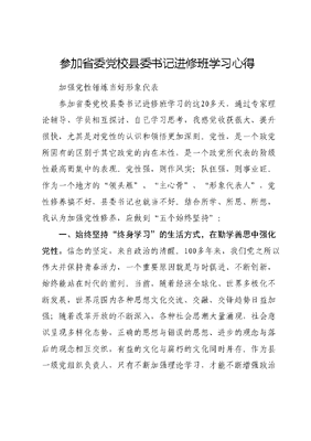 参加省委党校县委书记进修班学习心得加强党性锤炼当好形象代表参加省委党校县委书记进修班学习的这20多天,通过专家理论辅导、学员相互探讨、自己学习思考,我感觉收获很大、提升很快,尤其是对党性的认识和领悟更加深刻。党性,是一个政党所固有的区别于其它政党的内在本性,是一个政党所代表的阶级性最高而集中的表现。党性强,则作风实;队伍强,则事业旺。作为一个地方的领头雁、主心骨、形象代表人,党性修养搞不好,县委书记也就当不好。结合所学、所思、所想,我认为加强党性修养,应做到五个始终坚持:一、始终坚持终身学习的生活方式,在勤学善思中强化党性。信念的坚定,来自政治的清醒。100多年来,我们党之所以伟大并保持青春活力,一个重要原因就是与时俱进、不断创新,始终能站在时代的前列。当前,随着经济全球化、世界多极化不断发展,世界范围内各种思想文化交流、交融、交锋趋势日益加强;随着改革开放的不断深入,各种社会思潮大量涌现,社会意识呈现多样化态势,正确的思想与错误的思想、进步的观念与落后的观念相互交织,有益的文化与腐朽的文化同时并存。作为县一级党组织负责人,只有不断加强理论学习,才能不断增强政治鉴别力,自觉坚定前进方向不动摇。一方面,要坚持树立终身学习的理念,把学习当作一种责任、一种追求、一种修养、一种生活方式,作为强化党性的第一要务、履行职责的第一需求,努力争当学习型领导,建设学习型党组织。多年来,无论是在企业、市级部门还是区县工作,我始终高度重视理论学习,积极参加中央、省、市各种培训,并挤出时间自学,自觉养成理性思考习惯坚持不断向书本学习,向实践学习,向群众学习,精学理论知识深学业务知识,广学必需知识,进一步深化了对共产主义理想、党员先进性的认识,坚定了走中国特色社会主义道路、为党的事业奋斗终身的理想信念,有效提高了领导科学发展、改革创新、应对复杂局面和处置突发事件以及做群众工作的能力。另一方面要坚持理性思考,就是要把党的理论创新与工作实际有机结合,形成推进地方发展的一系列好思路、好做法、好作风。近年来,我坚持勤思考、善总结,先后撰写了《文明创建展示地震重灾区科学发展新形象》、《以四个注重推动X科学发展新局面》、《对丘区县域经济发展的思考》、《应把握学习实践科学发展观的着眼点》、《争当新一轮加快发展的排头兵》等一大批理论文章,被精神文明报、X经济日报、X党的建设、X日报等党报党刊刊载。二、始终坚持求真务实的工作作风,在真抓实干中锤炼党性。我认为,党性原则不是无形的、虚幻的、空洞的,而是有形的、具体的、实在的。正如小平同志所说,不干,半点马克思主义也没有。在改革发展稳定任务如此繁重的今天,我们更要把干事创业作为一种使命、一种追求,在真抓实干中锤炼党性我深知,在X这样一个50万人口的传统农业大县工作,担子有多重责任有多大,尤其是发展的压力更大。具体工作实践中,我们坚持把中央精神和上级要求与X的具体实际相结合,把开拓创新与求真务实相结合,把近期效益与远期效益相结合,不追求虚假指标和轰动效应,不搞不切实际、违背科学的瞎折腾和劳民伤财的形象工程。任县委书记后,我在全县上下大力倡导实干出实绩,落实见成效的务实作风,从班子成员到一般党员,始终保持干事创业的激情,定下来的事情就雷厉风行,抓紧实施;部署了的工作就一抓到底,抓出成效。近年来,县以科学发展观为指导,紧扣加快建设灾后美好新家园、加快建设X丘区经济强县的工作主题,围绕在X争先、在扩权县升位的目标定位,大力实施开放立县、工业强县、产业富民三大战略,认真落实三加大一改进四项任务,先后获得全国文明县城、中国金融生态县、全国粮食生产先进县标兵、全省十大三农样板县、全省城乡环境综合治理先进县等众多表彰奖励,实现了一年一个样三年大变样。2023年GDP达到113亿元,净增50亿元;财政总收入达到5.65亿元,是2015年的3倍;规上工业总产值达到60.17亿元是2015年的3.6倍;固定资产投资近80亿元,是前4年的总和。截至目前,全县总投资226亿元的1381个灾后恢复重建项目累计开工率达99.6%,完成总投资的81%。近三年综合目标考核名列全市前茅。三、始终坚持勤政为民的执政理念,在强县富民中彰显党性。立党为公、执政为民,既是共产党人的党性要求,更是一种思想感情、精神境界和政治追求。金杯银杯不如老百姓的口碑,金奖银奖不如老百姓的夸奖。我作为一个农村娃,能够在党的关心下成长、成才,能够在组织的关怀下一步一步干到县委书记这个位置上,确实不容易。所以我一直怀着一种感恩的心在工作,时常对自己说,要对得起党和人民,对得起组织的信任,绝对不能犯糊涂。近年来,我抓谋划、搞决策、定政策时,始终坚持把群众的利益放在首位,用百姓的利益来检验自己的工作,自觉做到不追风、不作秀、不妄为、