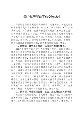 国企基层党建工作交流材料严密的组织体系是党的优势所在、力量所在,加强党的组织体系建设是一项长期任务。xx公司(以下简称:XX)坚持系统谋划、一体推进,在提升基层党建规范化水平上出实招,在提升整体效能上下功夫,开展中央企业基层党建提质增效七抓行动(抓组织、抓书记、抓党员、抓活动、抓制度、抓培训、抓保障),理顺管理体制机制,以规范化、精细化、体系化的思路措施强化功能,筑牢基层党组织战斗堡垒。一、抓组织,健全上下贯通、执行有力的组织体系。XX严格落实四同步四对接要求,新设立的二三级单位全部建立党组织,把党的组织嵌入企业管理各环节,推进基层党组织和党建工作有效覆盖,确保企业发展到哪里,党组织就建到哪里,党组织作用就发挥到哪里。弘扬支部建在连上传统,规范党组织设置,以部门、专业、班组为主体设立党支部,打通党的组织体系建设最后一公里,实现党组织有效覆盖,确保党中央决策部署在公司系统内不折不扣贯彻执行。持续推进党组织设置与企业组织架构的有机融合,优化党组织设置,做到应设必设、应建必建、应换必换。紧紧围绕中心工作,以深化红旗党支部建设为抓手,以加强标准化、规范化、信息化建设为目标,统筹推进基层党组织建设,全面增强基层党组织政治功能和组织功能,推动基层党组织从有形覆盖向有效覆盖转变,活动从偏于形式向突出作用转变,使党组织工作更接地气、更有实效。二、抓书记,培养选拔三懂、三会、三过硬的党支部书记。建立起一支政治坚定、作风过硬、能力突出、群众信任的党支部书记队伍,对于新时代国有企业党的建设工作具有重要意义。XX要求党支部书记必须懂党务、懂业务、懂管理,会解读政策、会疏导思想、会解决问题,做到政治过硬、作风过硬、廉洁过硬。严格落实《中国共产党支部工作条例(试行)》,选优配强基层党支部书记,在党员较多、业务较重的基层生产类党支部设置专职党支部书记,兼职党支部书记原则上由部门(单位)主要负责人担任。强化党支部书记第一责任,发挥其示范表率作用,把党的建设各项工作谋划好、组织好、落实好,推动基层党建工作落实落细、落地见效。三、抓党员,锻造高素质党员干部队伍。提高党员队伍建设质量,对于激发党组织的生机活力,推动全面从严治党向纵深发展,夯实党长期执政基础,实现党伟大执政使命,具有十分重要的意义。XX按照控制总量、优化结构、提高质量、发挥作用的总要求,突出政治标准,严格程序,严肃纪律,严把发展党员入口关,保证新发展党员质量。注重在一线产业工人、青年职工和高知识群体中发展党员,致力于把党员培养成骨干,把骨干培养成党员,把党员骨干输送到重要岗位。树立正确选人用人导向,建立优秀党员干部发现、培养、选拔、使用、调整常态化工作体系。加强党员日常教育管理,坚持全覆盖、全方位、全周期管理,延伸管理链条,落实管理责任,充分摸清党员基本情况,提高党组织管理效率。坚持严管和厚爱结合、激励和约束并重,坚持三个区分开来,更好激发广大党员、干部的积极性、主动性、创造性,营造奋进新征程、建功新时代的浓厚氛围。注重党员先锋模范作用的发挥,围绕急难险重任务开展党员示范区岗队组创建工作,聚焦服务国家重大战略、聚焦科技创新重点难点、聚焦职工群众关心关切进行靶向治疗,引领各级党组织和广大党员干部振奋精神,在党建质量、公司治理、科技创新、绿色转型、效益效率、国际化发展等方面担当作为,不断推进企业做强做优做大。四、抓活动,确保党建活动走深走实走心。党建活动既要从实际出发,立足企业的管理模式、经营特色、生产效益,积极发挥党的政治优势和组织优势;又要扎实开展党员群众喜闻乐见的党建活动,增强活动的影响力和感召力,营造党员群众主动参与的国企党建活动氛围。XX大力创新活动形式,用好红色资源,积极探索开展开放式主题党日活动、创意型组织生活新路径,提高组织生活针对性、吸引力和感染力,使党组织活动讲政治、接地气、鼓士气、聚人心。组织党员就近、就便到红色基地学习、重温入党誓词、聆听革命故事、解读历史文物,进一步坚定理想信念、强化责任担当意识、汲取前行力量。注重把党组织活动办在一线,在一线开展讲党课、建言献策、安全生产教育等活动,使党员在工作中接受党性教育,提升能力水平,实现党建活动融入生产经营全过程,确保党建工作与企业发展目标同向、工作同步、效果加成。以结对共建聚合力、服务基层促发展为主题,总部22个党支部分别与17个二级单位本部党支部、12个基层企业党支部开展结对共建,搭建集团总部与基层交流互动的桥梁,丰富党建工作形式,达到学习交流解难题、组织联建办实事、聚力攻坚促发展的目的。积极践行新时代党的群众路线,以党建带团建、党建带群建的方式支持群团组织更好发挥桥梁纽带作用,围绕党员群众普遍关心的热点难点问题开展政策解读、走访慰问、技能竞赛等群众性创新活动,协助解决党员