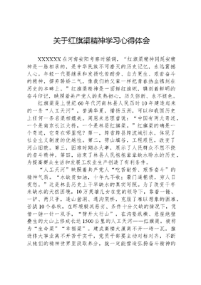 关于红旗渠精神学习心得体会XXXXXX在河南安阳考察时强调,红旗渠精神同延安精神是一脉相承的,是中华民族不可磨灭的历史记忆,永远震撼人心。年轻一代要继承和发扬吃苦耐劳、自力更生、艰苦奋斗的精神,摒弃骄娇二气,像我们的父辈一样把青春热血镌刻在历史的丰碑上。红旗渠精神是一面鲜红旗帜,镌刻着鲜明的奋斗印记,映照着共产党人的炙热初心,历久弥新、永不褪色。红旗渠是上世纪60年代河南林县人民历时10年建造起来的一条人工天河,誉满华夏,播扬五洲,可以和我国历史上任何一条名渠相媲美。周恩来总理曾说:中国有两大奇迹,一个是南京长江大桥,一个是林县红旗渠。红旗渠的确是一个奇迹,它奇在哪里呢?第一,跨省跨县跨流域引水,体现了社会主义制度的优越性。第二,劈山填谷,工程艰巨,改变了河山旧貌。第三,困难时期办大事,展示了人民群众不屈不挠的奋斗精神。第四,结束了林县人民祖祖辈辈缺水盼水的历史,为提高群众生活和发展工农业生产创造了有利条件。人工天河映照着共产党人吃苦耐劳、艰苦奋斗的精神气质。水缺贵如油,十年九不收;豪门逼租债,穷人日夜愁。这是林县历史上干旱缺水的真实写照。为了改变千年来缺水的天然困境,10万英雄儿女在党的领导下,靠着一锤、一铲、两只手,逢山凿洞、遇沟架桥,克服了难以想象的困难,苦战10个春秋,在环境极其恶劣、条件十分欠缺的情况下,凭借一锤一针一双手,劈开太行山,在沟壑纵横、悬崖绝壁叠生的大山上修成长达1500公里的人工天河——红旗渠,被称为生命渠幸福渠。建成高楼大厦离不开一砖一瓦,推进伟大事业离不开苦干实干,党员干部要主动对标对齐,不断从他们的精神世界里汲取养分,就一定能营造弘扬奋斗精神的强磁场,我们的追求就会更有高度,生命就会更有张力,在老百姓心中就会更有分量。人工天河映照着共产党人对党忠诚、矢志不渝的政治品格。忠诚为民的奉献精神是红旗渠精神的深刻内涵之一,它体现了我们党的性质和宗旨。党领导的艰苦卓绝的革命斗争让林县人民翻身做了主人,红旗下的人们坚信劳动可以改变命运,双手能够创造美好生活。他们之所以能够在物资匮乏、技术落后、人们吃饭都成问题的年代,建成红旗渠这个世界奇迹,靠的正是党员干部对党、对人民的无比忠诚,靠的就是革命理想大于天的坚定信念,是林县人民坚定信念跟党走的结果。新的征程上,我们学习弘扬红旗渠精神,就是要坚持人民至上,做到忠诚为民,想人民之所想,急人民之所急,把人民利益置顶,把人民装进心窝里,保持越是艰险越向前的英雄气概和敢叫日月换新天的昂扬斗志,在干事创业中勇挑重担、担当作为,用奋斗诠释忠诚。人工天河映照着共产党人服务群众、为民造福的宗旨意识。当年红旗渠流传一句顺口溜,干部能搬石头,群众就能搬山头;干部能流一滴汗,群众的汗水流成河。这个顺口溜是干群齐心筑梦的最好诠释。在10年修渠过程中,30000多名共产党员、共青团员、青年民兵冲锋在前、与群众同甘共苦,强大有效的凝聚力和感召力。党员干部要细照红旗渠这面熠熠生辉的明镜,勇于担苦、担难、担重、担险,始终把群众的需求和群众是否满意作为工作的出发点和落脚点,以百姓心为心,把百姓利益高高举过头顶,以苦了我一个,幸福千万家的无私奉献为党分忧,用实实在在的一桩桩、一件件惠民实事书写责任担当,擦亮共产党员这块金字招牌。人工天河映照着共产党人严以律己、廉洁奉公的廉政意识。鲜为人知的是,历时10年,投资近亿元的浩大工程,未发生一起贪污或挪用修渠物资事件,没有一个干部失职渎职,连账单都有整有零、清晰可查,账目分文不差,无一人失职渎职。把权力关进制度的笼子,是一种束缚,更是保护。清泉绝无一尘染,长松自是拔俗姿。作为一种情操,一种修养,一种自律,干净做人、干净做事折射出的是一种光明磊落的胸怀,党员干部理所应当作终生镜鉴,常怀律己之心,常修为政之德,常照红旗渠之镜,有所行、有所止、有所戒,时刻握紧行为戒尺,心中永远流淌一条清澈的人工天河,有一面永远屹立的圣洁的红旗。