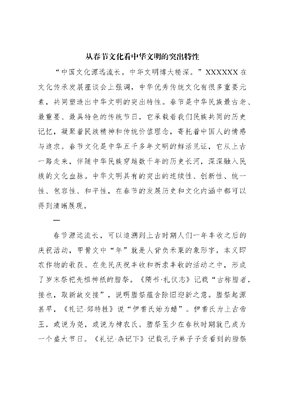 从春节文化看中华文明的突出特性中国文化源远流长,中华文明博大精深。XXXXXX在文化传承发展座谈会上强调,中华优秀传统文化有很多重要元素,共同塑造出中华文明的突出特性。春节是中华民族最古老、最重要、最具特色的传统节日,它承载着我们民族共同的历史记忆,凝聚着民族精神和传统价值理念,寄托着中国人的情感与追求。春节文化是中华五千多年文明的鲜活见证,它从上古一路走来,伴随中华民族穿越数千年的历史长河,深深融入民族的文化血脉。中华文明具有的突出的连续性、创新性、统一性、包容性、和平性,在春节的发展历史和文化内涵中都可以得到清晰展现。一春节源远流长,可以追溯到上古时期人们一年丰收之后的庆祝活动,甲骨文中年就是人背负禾粟的象形字,本义即农作物的收获。在先民庆祝丰收和祈求丰收的活动之中,形成了岁末祭祀先祖神祇的腊祭。《隋书·礼仪志》记载古称腊者,接也,取新故交接,说明腊祭蕴含除旧迎新之意。腊祭起源甚早,《礼记·郊特牲》说伊耆氏始为蜡。伊耆氏为上古帝王,或说为尧,或说为神农氏。腊祭至少在春秋时期就已成为一个盛大节日。《礼记·杂记下》记载孔子弟子子贡看到的腊祭场面是一国之人皆若狂,可见当时节日气氛之浓厚。汉武帝以前,历代岁首所在月份各不相同,夏以寅月,商以丑月,周以子月,秦以亥月。武帝太初元年(前104年)颁布太初历,确定用夏正,即以夏历正月朔日(初一)为岁首。自此以后的两千多年里,除了几次短暂的变更,汉武帝确立的岁首一直延续下来。历史上,岁首又被称为元日、元朔、元辰、元旦、正旦、正朔、新正、岁日等。汉代《四民月令》记载正旦之日要躬率妻孥,絜祀祖祢,子孙各上椒酒于其家长,称觞举寿,欣欣如也,还要谒贺师长亲朋。我们看到,后世过年的习俗在两千多年前大体都已形成。辛亥革命之后改用公历,以公历1月1日为元旦,改称夏历(农历)正月初一为春节。春节作为中华民族的传统节日至少已传承了两千多年,其源头更可追溯到中华文明的早期发展阶段,其中祭祀祖先、迎新祈福等传统习俗及其精神内核亦是一直绵延不绝。二春节是一个除旧迎新的节日,从本质上反映了中华民族对新的不懈追求,反映了中华民族求新求变的进取精神。孜孜不懈地追求变化、追求发展、追求进步,是中华民族数千年文可居文库——海量学习资料,手机电脑均可下载www.wenkeju.com来创造辉煌文明、历经磨难却愈发壮大的精神源泉。《礼记·月令》讲:数将几终,岁且更始。中国古人以自然秩序为人间秩序的源头和规范,人间的生产生活、政治活动都要因循四时节律。元日是一年之始,元日的前一天则是一岁之终,被称为除日或除夕。除即去除之意,去除的不仅是旧的一年,还意味着灾祸疫病的驱除,各种旧秽的扫除。改岁宜新,是说人们要以全新的姿态迎接新的一年。履端元日,正始之初,人们企盼新的一年有一个良好的开端。年岁更替之际,中国人表现出积极的人生态度,既有应转悟前非愿除旧妄生新意,端与新年日日新的自我反省,更有努力尽今夕,少年犹可夸老夫冒冷披衣起,要听雄鸡第一声的自我勉励。无论老少,都期许新年当有新作为。新春万物资始,要惟新政理。《周礼》记正月之吉,始和,布治于邦国都鄙,孙诒让解释说:正月正岁,岁时更始,将以除旧布新,明布治县(悬)法,皆所以新王事也。王安石著名的《元日》诗爆竹声中一岁除,春风送暖入屠苏。千门万户曈曈日,总把新桃换旧符,就是借咏元日,抒发除旧立新的意象。春节的名称其实也是在传统之上的创新。春节之文可居文库——海量学习资料,手机电脑均可下载www.wenkeju.com称古代早已有之,《后汉书·杨震传》载冬无宿雪,春节未雨,但这里指的是立春。今天的春节是给旧称赋予了合理的新内涵。从遥远的腊祭到今天的春节,从桃符到春联,从压胜钱到压岁钱,还有腊八、小年、除夕、守岁、破五、元宵等年俗的逐渐形成,春节一直在与时俱进。时至今日,网上拜年等新的过年方式不断涌现,春节文化还在不断推陈出新。三岁首在古代又称正朔,正即正月,朔即初一。古代正朔有着非常特殊的意义。《史记》说:王者易姓受命,必慎始初,改正朔,易服色。自汉武帝确定夏正以后,后世虽然不轻易改正朔,但颁布历法仍然是王朝统治的象征。大一统除了政治和思想上的统一,也体现在礼乐等方方面面。大一统观念的确立也与正月紧密相关。大一统一词出自《春秋公羊传》,其认为《春秋》首书元年春王正月就是为了推重一统。于是一年之始被赋予了独特意义,成为维系大一统的政教之始:夫王者,始受命改制,布政施教于天下,自公侯至于庶人,自山川至于草木昆虫,莫不一一系于正月,故云政教之始。自汉代起,历代皆在元日举行盛大的元日朝会。四方来贺万邦来朝,齐八荒于蕃服兮,咸稽首