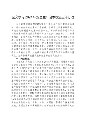 全文学习2024年安全生产治本攻坚三年行动为认真贯彻落实XXXXXX关于安全生产系列重要指示精神,进一步夯实安全生产工作基础,从根本上消除事故隐患,有效防范遏制重特大生产安全事故,国务院安委会近日印发《安全生产治本攻坚三年行动方案(2024—2026年)》,部署各地区、各有关部门和单位深入开展安全生产治本攻坚三年行动,着重在安全理念、安全责任、安全规划、安全法治、安全标准、安全科技、安全工程、安全素质等方面补短板、强弱项,切实提高风险隐患排查整改质量,切实提升发现问题和解决问题的强烈意愿和能力水平,推动重大事故隐患动态清零,不断提升本质安全水平,加快推进安全生产治理体系和治理能力现代化,努力推进高质量发展和高水平安全良性互动。一、内容概述《方案》共提出了八个方面20条具体措施,同时国务院安委会办公室集中印发了各部门牵头制定的31个部门子方案,形成了1+31的安全生产治本攻坚行动总体框架,利用三年时间,深入开展生产经营单位主要负责人安全教育培训、重大事故隐患判定标准体系提升、重大事故隐患动态清零、安全科技支撑和工程治理、生产经营单位从业人员安全素质能力提升、生产经营单位安全管理体系建设、安全生产精准执法和帮扶、全民安全素质提升八大行动,推动地方党委政府、部门及生产经营单位进一步强化统筹发展和安全的理念;重点行业领域建立健全全链条排查整治重大事故隐患的责任体系,安全监管能力显著提升;2024年底前基本消除2023年及以前排查发现的重大事故隐患存量,2025年底前有效遏制重大事故隐患增量,2026年底前形成重大事故隐患动态清零的常态化机制;针对重大安全风险的一批人防、技防、工程防、管理防措施落地见效,本质安全水平大幅提升;全国安全生产形势持续稳定向好,重特大生产安全事故多发势头得到有效遏制。二、全文学习(一)开展生产经营单位主要负责人安全教育培训行动1.会同中央党校集中开展重点行业领域生产经营单位主要负责人专题安全教育培训,固化完善中央党校主课堂+各地区分课堂同步的模式,推动相关重点行业领域生产经营单位主要负责人教育培训全覆盖,其中:2024年,重点开展矿山企业主要负责人和二级三级医院消防安全责任人集中培训;2025年,重点开展金属冶炼生产经营单位主要负责人、重点文物保护等单位消防安全责任人集中培训;2026年,重点开展大型商业综合体消防安全责任人集中培训。各地区及国务院安委会有关成员单位要结合实际,组织对未覆盖到的有关重点行业领域生产经营单位主要负责人开展安全教育培训。(二)开展重大事故隐患判定标准体系提升行动2.总结重大事故隐患专项排查整治2023行动经验做法,修订一批、提升一批重大事故隐患判定标准,形成覆盖各行业领域的较为完备的标准体系。对于已经出台重大事故隐患判定标准的行业领域,要及时修订完善,增强操作性和实用性,并针对新问题、新风险补充完善标准要求;对于以推荐性标准或以试行、暂行办法等文件出台的,2024年底前要积极总结提升为部门规章、强制性国家标准等,增强权威性。结合行业领域实际情况,针对性制修订重大事故隐患判定标准解读、检查指引指南等配套文件、制作有关视频,规范事故隐患排查工作流程、提升排查整改质量。(三)开展重大事故隐患动态清零行动3.因地制宜建立完善各类发展规划的安全风险评估会商机制,有效衔接国土空间规划和全国自然灾害综合风险普查成果等,结合地区实际制定开发区、高新区、工业园区、化工园区等重点区域安全生产禁止和限制类产业目录,严格准入,强化重大安全风险源头管控。文可居文库——海量学习资料,手机电脑均可下载www.wenkeju.com4.健全完善生产经营单位重大事故隐患自查自改常态化机制,生产经营单位主要负责人要每季度带队对本单位重大事故隐患排查整治情况至少开展1次检查(高危行业领域每月至少1次),完善并落实生产经营单位全员安全生产岗位责任制。完善行业领域专家、企业退休技安人员以及专业技术服务机构参与排查整治工作的长效机制,加大支撑保障力度,提高排查整治专业性。对于未开展排查、明明有问题却查不出或者查出后拒不整改等导致重大事故隐患长期存在的,参照事故调查处理,查清问题并依法依规严肃责任追究。5.完善地方政府对于重大事故隐患治理的督办制度,建立政府负有安全监管职责有关部门审核把关销号机制,加大专业指导力度,确保重大隐患闭环整改到位。2024年底前建立健全分区域、分行业重大事故隐患统计分析机制,对进展缓慢的及时采取函告、通报、约谈、曝光等措施。修订《安全生产事故隐患排查治理暂行规定》,进一步加强事故隐患排查治理的监督管理。6.健全重大事故隐患数据库,2024年底前完善数据库运行管理机制,实现企业自查上报、督导检查发现、群众举报查实等各渠道排查的重大事故隐患全量汇总,推动重大事故隐患信息共享集