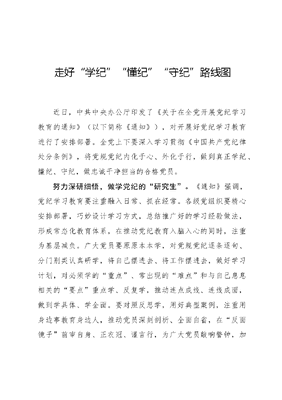 走好学纪懂纪守纪路线图近日,中共中央办公厅印发了《关于在全党开展党纪学习教育的通知》(以下简称《通知》),对开展好党纪学习教育进行了安排部署。全党上下要深入学习贯彻《中国共产党纪律处分条例》,将党规党纪内化于心、外化于行,做到真正学纪、懂纪、守纪,做忠诚干净担当的合格党员。努力深研细悟,做学党纪的研究生。《通知》强调,党纪学习教育要注重融入日常、抓在经常。各级党组织要精心安排部署,巧妙设计学习方式,总结推广好的学习经验做法,形成常态化教育体系,在推动党纪教育入脑入心的同时,注重为基层减负。广大党员要原原本本学,对党规党纪逐条逐句、分门别类认真研学,将自己摆进去、将工作摆进去,做好学习计划,对必须学的重点、常出现的难点和与自己息息相关的要点重点学、反复学,推动连点成线、连线成面,做到学具体、学全面。要对照反思学,用好典型案例,注重用身边事教育身边人,推动党员深刻剖析、全面自省,在反面镜子前审自身、正衣冠、谨言行,为广大党员敲响警钟,加强警示教育。追求知事明理,做懂党纪的明白人。欲行先知,想要开展实践,首先要将理论知识学懂弄通、学深悟透。党纪学习教育不能只停留在学,要在学中不断向知规懂规努力,真正明白什么该干、什么不该干,什么该说、什么不该说,做到对党规党纪烂熟于心、如数家珍。要在学中不断陶冶道德情操,树立正确的价值观、世界观、从政观,守好纪律这条底线红线,弄清楚树什么样的政绩政绩为谁而树等问题,做让人民群众放心满意的党员干部。要在学中不断加强党性修养,进一步增强政治敏锐性和政治辨别力,强化拒腐防变能力,树牢规矩意识,形成法治思维,时刻保持思想警惕,永葆共产党人政治本色。全面对标对表,做守党纪的践行者。XXXXXX强调,制定纪律就是要执行的。广大党员、干部特别是领导干部,要时刻对标对表、严格自律、严守党纪,在遵规守纪上做标杆、做表率,带头践行党规党纪,对一切违反纪律的行为坚决抵制。工作中,要严守工作纪律,严格按照规章制度办事,坚决杜绝吃拿卡要、利用职务之便开后门等违纪行为,做到不该拿的不拿、不该办的不办。生活中,要自觉净化朋友圈,杜绝奢靡享乐之风,自觉接受组织和群众的监督,同时,正确督文可居文库——海量学习资料,手机电脑均可下载www.wenkeju.com促引导亲朋好友等身边人,涵养良好家风。各级党组织要在加强教育引导的前提下,秉持无规矩不成方圆的理念,敢抓敢管、严抓严管、常抓常管,用好党纪戒尺,在全党营造出纪律严明、风清气正的干事氛围。文可居文库——海量学习资料,手机电脑均可下载www.wenkeju.com