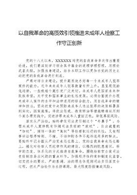 以自我革命的高质效引领推进未成年人检察工作守正创新党的十八大以来,XXXXXX对党的自我革命多次作出重要论述,我们要深刻学习领会其中蕴含的道理学理哲理,用理论武装头脑,加强自身建设,结合本职工作以更加自觉的历史主动把党的自我革命进行到底。严肃对待自身建设,提升高质效办好每一个未成年人犯罪案件的能力。近年来未成年人犯罪数量有所上升,且呈现低龄化趋势,一些极端个案引发广泛关切。未成年人是国家未来和民族希望,关乎党和国家事业的长远发展。必须全面提升办理未成年人案件的水平和法律适用的综合能力,用自我革命的精神和担当,坚决把党中央预防未成年人违法犯罪的决策部署落到实处,因案施策,将依法惩戒、教育矫治等措施精准运用到个案办理实践中,促进涉罪未成年人重回正轨,降低再犯风险。落实从严治检,始终牵住司法责任制这个牛鼻子。办理未成年人案件既有伴随司法责任的放权、自由裁量的加权、捕诉一体的集权等检察权运行的共性,又有刑事诉讼程序特别、不捕、不诉和附条件不起诉适用多的特点。要始终牢记全面从严治党永远在路上、党的自我革命永远在路上,强化对检察人员纪律作风的建设,以强烈的忧患意识,科学的态度、体系化的方式推进自我革命,围绕检察官办案司法责任制容易出问题的重点环节,加强程序性约束和制度化监督,切实把全的要求、严的基调、治的理念体现到司法责任落实全过程,把从严治检作为永恒课题,最大限度防控廉政风险。以高度的历史自觉,努力构建中国特色未成年人司法自主知识体系。面对近年来未成年人权利保护多样化的司法需求,检察机关全面贯彻XXX法治思想,大力推进未成年人刑事、民事、行政、公益诉讼检察业务统一集中办理,不断深化未成年人司法综合改革。以理论创新讲明我国未成年人司法改革的实践逻辑,还要坚持自我革命的历史自觉,沿着构建中国自主法学知识体系的正确方向,推动形成一种实体规定、程序规则、组织体系合一的中国特色社会主义未成年人司法模式,回答好未成年人司法发展的中国之问,走出未成年人司法的自主发展路径。文可居文库——海量学习资料,手机电脑均可下载www.wenkeju.com