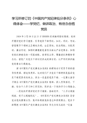 学习新修订的《中国共产党纪律处分条例》心得体会——学党纪,做讲政治、有信念合格党员2024年3月18日至21日XXXXXX在湖南考察时强调,组织开展好党纪学习教育,引导党员干部学纪、知纪、明纪、守纪,督促领导干部树立正确权力观,公正用权、依法用权、为民用权、廉洁用权。加强纪律教育是落实全面从严治党要求、加强党的纪律建设的一项基础性、经常性工作,要推进纪律教育常态化,督促广大党员干部切实养成纪律自觉,以严明纪律护航党的事业行稳致远。新《中国共产党纪律处分条例》的颁布对于党员干部的指导性更强、理论性更深,这对我们广大党员干部特别是基层党员干部更具有约束力。作为一名基层党员干部,一定要认真学习领会《中国共产党纪律处分条例》精神,深入贯彻落实。下面,结合个人学习和工作实际,简单谈一下我的学习心得体会。一是组织开展好党纪学习教育,基础在学。人不以规矩则废,党不以规矩则乱。《中国共产党纪律处分条例》是管党治党的重要法宝,集中体现着集体意志和原则要求。党员干部要把《中国共产党纪律处分条例》作为为官从政的定盘星、为人处世的压舱石,通过学习《中国共产党纪律处分条例》,自觉加强党性锻炼,提升党性修养,坚定三个自信,补精神之钙,固思想之元,铸党性之魂,守为政之本,不断增强党员干部的规矩意识、纪律意识、学习意识和担当精神,充分发挥党员干部先锋模范作用,真正把党要管党、从严治党要求落到实处。同时要通过开展党纪学习教育,引导党员干部自觉把各项要求转化为实际行动,内化于心、外化于行,切实做到为党分忧、为国尽责、为民奉献。作为财政党员干部要自觉在工作和生活中,要自觉地按照党章的要求,模范遵守党的纪律,以蝼蚁之穴,溃堤千里的忧患之心对待自己的一思一念,以如临深渊,如履薄冰的谨慎之心对待自己的一言一行,以夙夜在公,寝食难安的公仆之心对待自己的一职一责,视党的政策为生命线以自持,视党纪国法为高压线以自省,视廉洁自律为警戒线以自警,清清白白做人,干干净净为官。要带头立规矩、建制度,划红线、设底线,一切按规矩来、一切按规定办、一切按程序走,做到有令必行、有禁必止,确保各项决策部署不折不扣地落实到财政工作中来。要善于算好政治账、经济账、感情账和家庭账,做到分外之物不收,不义之财不取,恪守为政底线,保持清廉本色。文可居文库——海量学习资料,手机电脑均可下载www.wenkeju.com二是组织开展好党纪学习教育,关键在做。做是目的,也是关键。作为党员干部,就要严格对照党员六大纪律标准,牢固树立三种观念,坚定自觉地在思想上、政治上、行动上同以XXX同志为XXX的党中央保持高度一致,自觉向党中央看齐,向党的理论和路线方针政策看齐,严守政治纪律和政治规矩,做政治上的明白人,进一步增强四个意识,坚定四个自信,做到两个维护,全面提升党员队伍思想政治素质。同时党员干部要坚定理想信念,提高道德修养,要心存敬畏、手握戒尺,廉洁从政、从严治家,筑牢拒腐防变的防线,始终保持干事创业、开拓进取的精气神。财政工作涉及经济社会发展各个领域,往往牵一发而动全身。正是由于财政工作的特殊性、敏感性决定了财政干部凡事要做到廉字当头,严字当先,要时刻谨记职业操守、岗位职责,只有心中高悬党纪国法的明镜,手中紧握法律的戒尺,才能真正做到规范用权、秉公办事、依法理财,才能切实防止权力失控、决策失误、行为失范。三是组织开展好党纪学习教育,根在为民。做合格共产党员,是学习教育的着眼点和落脚点。做合格党员就必须不忘初心、继续前进,始终牢记党的根本宗旨,全心全意为人民服务,保持同群众的血肉联系,始终坚持以民为本,把人民群众的冷文可居文库——海量学习资料,手机电脑均可下载www.wenkeju.com暖疾苦放在心上,仔细倾听群众的真实诉求,努力解决群众的实际困难,为民办好事、做实事,真正把人民群众的根本利益维护好、实现好、发展好,保持党员干部在群众心中的良好形象。同时要牢固树立权为民所赋的意识,坚持问政于民问计于民问需于民,真正从群众中汲取智慧和力量,做到权为民所用、情为民所系、利为民所谋,坚持民生优先导向,始终把保障和改善民生作为工作的出发点和落脚点,加大民生保障和改善力度,着力推进民生优先发展,全力增进民生福祉,让改革发展成果更多更公平地惠及广大人民群众。结合财政工作就是要带头发扬艰苦奋斗、勤俭节约的精神,牢固树立过紧日子的思想,精打细算,严格把关,管理好各项资金,发挥财政资金的最大效益,把财政资金用在刀刃上,用在事关群众长远利益、根本利益、民生利益上。开展党纪学习教育的实质是把思想建设、作风建设、纪律建设融为一体。学是基础,做是关键,根在为民服务,力在真抓实干,功在深入持久。党员干部必须坚持以