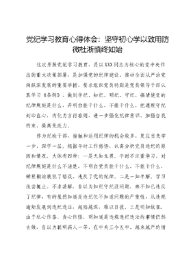 党纪学习教育心得体会:坚守初心学以致用防微杜淅慎终如始这次开展党纪学习教育,是以XXX同志为核心的党中央作出的重大决策部署,是加强党的纪律建设、推动全面从严治党向纵深发展的重要举措,要求组织党员特别是党员领导干部认真学习《条例》,做到学纪、知纪、明纪、守纪,搞清楚党的纪律规矩是什么,弄明白能干什么、不能干什么,把遵规守纪刻印在心,内化为言行准则,进一步强化纪律意识、加强自我约束、提高免疫力。作为纪检干部,接触和运用纪律的机会较多,更应当先学一步、深学一层。根据平时工作感悟,认真分析党员违纪的原因和情况,大体有四种:一是无知无畏。平时不注重学习,对纪律规矩是什么不清楚,不明白党员能干什么、不能干什么,稀里糊涂就犯了错误、违反了党的纪律。二是一知半解。学习浅尝辄止、不求甚解,自以为知纪守纪没问题,殊不知已违反了纪律,有的虽然知道是违纪但不知道问题的严重性,从违规逾矩发展到违纪违法,越陷越深,难以自拔。三是明知故犯。由于私心作祟、贪心作怪,明知道是违规违纪违法的事情仍然去做,自以为聪明高人一等,在中央三令五申、越来越严的情况下,仍然不知止、不收手、不收敛,心存侥幸,甚至铤而走险。四是相知恨晚。从放松个人学习、降低个人要求开始,有了第一次违规越矩,发展到违纪违法,直到被查处甚至锒铛入狱,从身边人成为了身边人,才幡然醒悟,悔不该当初,教训极为深刻。作为一名党员,如何通过这次党纪学习教育,做到学纪、知纪、明纪、守纪,个人体会是四句话:坚守初心、学以致用、防微杜渐、慎终如始。坚守初心,就是要尊崇党章,从内心深处敬畏党纪。党章是党的根本大法,是全党必须遵循的总规矩;党纪是党的生命线,是规范党员言行的戒尺。在纷繁复杂的现实中,面对各种诱惑,党员干部要坚守初心、经受考验,必须先遵守纪律。没有纪律的约束,就经不起考验、受不了困苦、扛不住挫折,进而偏离初心、忘却初心、背叛初心。坚守初心,可以提升遵守纪律的境界,懂得为什么遵守纪律和怎样遵守纪律,从而将遵守纪律转变为自觉行动。有了坚定的初心,就会使遵守纪律建立在共同思想、共同目标、共同理想和共同利益的基础之上。作为党员干部,我们要始终坚守初心、牢记使命,时刻对纪律、对群众、对组织怀有敬畏之心,就能言有所戒、行有所止。文可居文库——海量学习资料,手机电脑均可下载www.wenkeju.com学以致用,就是要学用结合,时时处处紧绷纪律之弦。知是行之始,行是知之成。只有深入学习《条例》,了解、熟悉并牢记党的纪律,才能真正落实好纪律要求,做一名严守党纪的合格党员。从以往各级通报的违纪违法反面典型案例可以看出,无知无畏、一知半解、明知故犯、相知恨晚的人不乏其例,也都不在少数。要从中吸取教训,牢记纪律面前人人平等、执行纪律没有例外,践踏纪律必将受到惩处。我们要以此次党纪学习教育为契机,认真学习党规党纪,真正弄明白哪些是不可触碰的雷区、哪些是不可逾越的红线,时刻紧绷纪律之弦,用纪律规矩规范言行。防微杜渐,就是要谨言慎行,从小事小节常思贪欲之害。但凡错误的铸成,都是由于平时的疏忽和放纵积累而成,所以我们必须加强党性锻炼和党性修养,严于律己,谨言慎行,慎初、慎微、慎独。慎初,就是时刻保持清醒和警惕,耐得住寂寞、守得住清贫、管得住小节,把初心当恒心,时时叩问自己,坚决守住第一道防线,始终把好第一道关口。慎微,就是要从小事小节做起,小事里面有政治,小事里面有原则,小事里面有纪律。不矜细行,终累大德。在小节、小利问题上不检点,日积月累终将变成大问题。始终谨记众多因小节不慎而导致大节翻船的沉痛教训,高度警惕小问题、小毛病的腐蚀作用。文可居文库——海量学习资料,手机电脑均可下载www.wenkeju.com慎独,就是要筑牢拒腐防变的思想防线,常思贪欲之害,做到在别人看不到的时候能十分自觉、在别人听不到的时候能十分警惕、在组织管不到的时候也能十分谨慎。慎终如始,就是要始终如一,自始至终常怀律己之心。党性修养、党纪观念不会随着党龄、年龄和职务增长而增长,只有通过不断学习和党性锻炼而增强。无数事实证明,哪个党员都没有天然免疫力,也没有金刚不坏之身。所以,党章规定:每个党员,不论职务高低,都必须编入党的一个支部、小组或其他特定组织,参加党的组织生活,接受党内外群众的监督。不允许有任何不参加党的组织生活、不接受党内外群众监督的特殊党员。作为党员干部,要勇于自我净化、善于接受批评、主动接受监督,始终像刚入党时那样,对党怀有赤诚之心,对党纪怀有敬畏之心,做到慎终如始、始终如一。在风云变幻中,处变不惊,严格遵守党章党纪党规,用纪律规矩修心修德,咬定青山不放松;在乱花迷眼中,保持定力,稳定自己的心性,坚持自己的追求,约束自己的行为,清白做人,干净做事,乱云飞渡仍从容;在纷繁复杂中,勤勉敬业,干