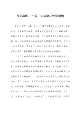 支部学习二十届三中全会决议发言稿7月15日至18日,党的二十届三中全会在北京召开,会议对进一步全面深化改革、推进中国式现代化作出了战略部署。实践永无止境,改革未有穷期。在改革开放进入攻坚期和深水期,进一步全面深化改革的任务更加艰巨的大背景下,我作为一名党员干部,须永葆改革者的攻坚劲头,勇敢立潮头,永远立潮头,紧紧围绕中国式现代化把改革推向前进。永立潮头需要坚持问题导向。问题是时代的声音,人民心声是改革所向。改革开放越往纵深发展,遇到的问题和矛盾、有待完成和新提出的任务越交织叠加、错综复杂。因此,我们必须坚持问题导向和目标导向,从老百姓急难愁盼中找准改革的发力点和突破口,才能在进一步全面深化改革的火热实践中永立潮头。党员干部要扎实走好新时代党的群众路线,在改革中运用好调查研究这个传家宝,在困难多、群众意见集中、工作打不开局面的地方去发现改革的问题、方向,把问题清单变为改革清单。坚持问计于民、问需于民,从民之所需民之所盼中深刻洞察社会基本矛盾的变化,对重要情况、矛盾焦点、群众期盼要心中有数。要想人民之所想,行人民之所嘱,多推出一些民生所急、民心所向的改革举措,多办一些惠民生、暖民心、顺民意的实事,全心全意把老百姓的事一件一件办好,切实增强改革的针对性、科学性和实效性。永立潮头需要勇立潮头的精气神。改革开放40多年取得的伟大成就离不开一代代改革者