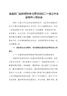 县直部门副职领导学习贯彻党的二十届三中全会精神心得体会党的二十届三中全会在北京胜利召开,这是在全面建设社会主义现代化国家新征程上召开的一次十分重要的会议。作为一名基层领导干部,我认真学习了全会精神,深感使命光荣、责任重大。全会为进一步全面深化改革指明了方向,为推进中国式现代化提供了根本遵循。我将把学习贯彻全会精神作为当前和今后一个时期的重要政治任务,切实把思想和行动统一到全会精神上来。一、深刻领会全会精神,切实增强全面深化改革的决心和信心(一)全面深化改革是推进中国式现代化的根本动力全面深化改革是党和人民事业发展的强大动力源泉。改革开放40多年来,我们党领导人民进行了一场新的伟大革命,不断推进理论创新、实践创新、制度创新,极大激发了社会创造力,推动我国实现了从站起来、富起来到强起来的历史性飞跃。党的十八大以来,以XXX同志为核心的党中央以前所未有的决心和力度推进全面深化改革,啃下了不少硬骨头,闯过了不少急流险滩,推动改革呈现全面发力、多点突破、蹄疾步稳、纵深推进的崭新局面。实践充分证明,全面深化改革是推进中国式现代化的根本动力,是实现中华民族伟大复兴的必由之路。(二)坚持党的领导是改革取得成功的关键回顾改革开放40多年的历程,我们党之所以能够领导全国各族人民推进改革开放伟大事业,关键在于始终坚持党的集中统一领导。党的领导是我国最大的制度优势,是全面深化改革的根本保证。正是在党的坚强