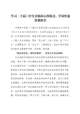 学习二十届三中全会精神心得体会:学深悟透抓紧抓实中国共产党第二十届中央委员会第三次全体会议于2024年7月15日至18日在北京举行,全会审议通过了《中共中央关于进一步全面深化改革、推进中国式现代化的决定》。贯彻落实二十届三中全会精神,要在怎么看上统一思想,在干什么上凝聚共识,在怎么干上精准发力,结合本单位实际,切实把全会精神学习好、贯彻好、落实好。危机育先机、变局开新局,学深三中全会精神。全会高度评价新时代以来全面深化改革的成功实践和伟大成就,研究了进一步全面深化改革、推进中国式现代化问题,认为当前和今后一个时期是以中国式现代化全面推进强国建设、民族复兴伟业的关键时期。中国式现代化是在改革开放中不断推进的,也必将在改革开放中开辟广阔前景。面对纷繁复杂的国际国内形势,面对新一轮科技革命和产业变革,面对人民群众新期待,必须自觉把改革摆在更加突出位置,紧紧围绕推进中国式现代化进一步全面深化改革。学习贯彻落实三中全会精神,我们要从风险挑战中增强危机感、从政策利好中抢抓新机遇,更加自觉地在两个大局下辨大势、找方向,准确识变、科学应变、主动求变,坚持用全面、辩证、长远的眼光看待当前的困难、风险、挑战,深刻把握危机共生、危中蕴机、危可转机的辩证关系,善于在危机中育先机、于变局中开新局,抓住机遇,应对挑战,趋利避害,奋勇前进,始终保持战略定力,全面增强必胜信心。树立新理念、展
