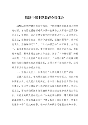 铁路干部主题教育心得体会XXXXXX在党的XX大报告中指出:继续推进实践基础上的理论创新,首先要把握好新时代中国特色社会主义思想的世界观和方法论,坚持好、运用好贯穿其中的立场观点方法。必须坚持人民至上,坚持自信自立,坚持守正创新,坚持问题导向,坚持系统观念,坚持胸怀天下。六个必须坚持相互联系、内在统一,蕴含着根本政治立场、重大原则方向、强烈政治担当、崇高精神境界、科学思想方法和工作方法,回答了为谁创新的根本问题、什么是创新的基本问题、如何创新的关键问题新时代我们推进铁路高质量发展,必须不折不扣地坚持好、运用好贯穿其中的立场观点方法。一、坚持人民至上,认真践行人民铁路为人民宗旨坚持人民至上,首先要求我们必须坚持生命至上,站在对党和国家负责、对人民负责的高度,千方百计防范各类责任和非责任事故,坚决守住确保安全稳定的政治红线和职业底线。坚持人民至上,要求我们要把客货运输作为服务经济社会发展的主责主业,对标党的XX大报告提出的加快发展物联网,建设高效顺畅的流通体系,降低物流成本健全基本公共服务体系,提高公共服务水平的战略部署,进一步提升铁路运输服务保障水平,不断满足人民群众人享其行、物畅其流的美好生活需要。坚持人民至上,要求我们要把落实依靠方针作为凝心聚力、攻坚克难的根本源泉,深化企业与职工命运共同体建设,在高质量发展中持续提升职工生产生活品质,不断实现好、维护好、发展好干部职工的根本利益,提升职工群众的归属感、获得感和幸福感。二、坚持自信自立,坚定推进铁路高质量发展的决心和信心我们要深刻认识和把握新时代十年党和国家事业取得的历史性成就、发生的历史性变革,要深刻认识党的十八大以来铁路改革发展的历史进程,要深刻认识十年来XX局取得的历史性成就。我们要自豪地看到,这十年,铁路网规模质量大幅提升。截至2022年9月底,全国铁路营业里程达到15.3万公里,其中高铁4.1万公里,基本形成了布局合理、覆盖广泛、层次分明、安全高效的铁路网络。这十年,铁路装备技术水平不断攀升。中国铁路总体技术水平迈人世界先进行列,高速、高原、高寒、重载铁路技术在世界处于领先地位,形成了具有独立自主知识产权的高铁建设和装备制造技术体系。这十年,铁路国际合作开创了新局面。中老铁路、亚吉铁路、蒙内铁路相继开通运营,雅万高铁标志性项目有序推进。铁路技术装备出口全球100多个国家和地区,实现了全产业链走出去。中欧班列通达欧洲24个国家的204个城市,成为一带一路建设的重要成果和突出亮点。党的XX大报告在回顾新时代十年的伟大变革时指出,我国建成世界最大的高速铁路网货物贸易总额居世界第一,这就是对铁路取得的成绩的最好肯定。我们要自豪地看到,十年来,XX局集团公司也取得了历史性成就。截至2021年年底,集团公司营业里程达到6418.8公里,其中高铁2338.8公里,较2012年分别增加了71.8%、204.3%,XX省高铁里程位居全国前三。通过认识铁路发展成就,我们要进一步坚定中国特色社会主义道路自信、理论自信、制度自信、文化自信,进一步坚定推进中华民族伟大复兴历史进程的决心和信心,进一步坚定推进铁路高质量发展的决心和信心。三、坚持守正创新,贯彻新发展理念、坚持深化改革、突出创新引领首先,贯彻新发展理念。XXXXXX在党的XX大报告中进一步强调,贯彻新发展理念是新时代我国发展壮大的必由之路,必须完整、准确、全面贯彻新发展理念,坚持社会主义市场经济改革方向,坚持高水平对外开放,加快构建以国内大循环为主体、国内国际双循环相互促进的新发展格局。结合XX局集团公司的实际,我们要加深对新发展理念的学习理解,贯彻好新发展理念,继续坚持稳中求进、改革创新,深化五个济铁六个一流奋斗目标,深入践行安全保稳定、管理上水平、职工得实惠工作主线,完善七个必须三抓四最九管等安全管理体系和双轮驱动经营发展机制,巩固改革创新年建设和思想创新全员大讨论成果。其次,把深化改革作为激发企业发展动力、活力的根本途径。改革是XX局高质量发展的必由之路党的XX大报告强调,要深化国资国企改革,加快国有经济布局优化和结构调整,推动国有资本和国有企业做强做优做大,提升企业核心竞争力。我们要对标深化国资国企改革的战略部署,充分发挥改革的突破和先导作用,坚定不移把改革进行到底。再次,把突出创新引领作为驱动企业高质量发展的核心所在。创新是引领发展的第一动力。党的XX大报告强调,要加快实施创新驱动发展战略增强自主创新能力。我们要对标加快实施创新驱动发展战略,统筹好路内外各方力量和各类资源,加快构建产学研用深度融合的技术创新体系,不断提升智慧济铁建设水平。四、坚持问题导向,聚焦改革发展中不平衡不充分的主要矛盾和突出问题当前,我们正处