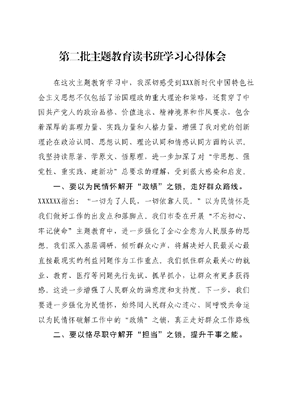 第二批主题教育读书班学习心得体会在这次主题教育学习中,我深切感受到XXX新时代中国特色社会主义思想不仅包括了治国理政的重大理论和策略,还贯穿了中国共产党人的政治品格、价值追求、精神境界和作风要求,包含着深厚的真理力量、实践力量和人格力量,增强了我对党的创新理论在政治认同、思想认同、理论认同和情感认同方面的认识。我坚持读原著、学原文、悟原理,进一步加深了对学思想、强党性、重实践、建新功总要求的理解,受到很大感染和启发。一、要以为民情怀解开政绩之锁,走好群众路线。XXXXXX指出:一切为了人民,一切依靠人民。以为民情怀是我们做好工作的出发点和落脚点。我们市委在开展不忘初心、牢记使命主题教育中,进一步强化了全心全意为人民服务的思想。我们深入基层调研,倾听群众心声,将解决好人民最关心最直接最现实的利益问题作为工作重点。我们抓住群众最关心的就业、教育、医疗等问题先行先试、抓早抓小,让群众有更多获得感。这进一步增强了人民群众的满意度和支持度。下一步,我们要进一步强化为民情怀,始终同人民群众心连心、同呼吸共命运以为民情怀破解工作中的政绩之锁,真正走好群众工作路线二、要以恪尽职守解开担当之锁,提升干事之能。XXXXXX指出:干部要有担当,敢于任事,勇于负责。以职责担当是我们做好工作的政治自觉。我们市委在开展主题教育中,进一步强化了勇于担当作为的思想。面对经济运行的严峻形势,我们主动担当作为,统筹各方资源,保障xx工作取得决定性成果经济运行重回正轨。我们主动作为、积极应变,及时出台稳企纾困政策,各项经济指标保持向好态势。这体现了我们增强的使命担当。下一步,我们要进一步强化职责担当,以对人民高度负责的精神,提升工作能力和效率,以恪尽职守的担当精神破解工作中的担当难题。三、要以真抓实干解开落实之锁,踩实脚下道路。XXXXXX指出:一切工作取决于抓落实。真抓实干是我们做好工作的根本遵循。我们市委在开展主题教育中,进一步强化了抓铁有痕、踏石留印的工作作风。我们紧盯重点工作,层层落实责任,确保各项民生实事项目如期完成。我们狠抓工作落实,对标对表对账,及时发现和解决问题,确保各项改革举措落地见效。这增强了我们坚持真抓实干的决心和勇气。下一步,我们要进一步强化真抓实干,一抓到底,以钉钉子精神抓好各项工作落实,以真抓实干的作风破解工作中落实的难题。