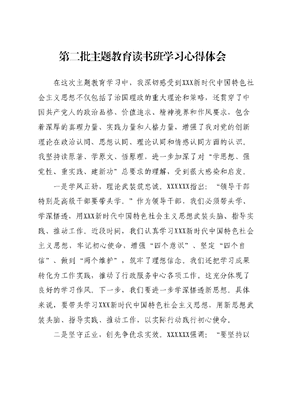 第二批主题教育读书班学习心得体会在这次主题教育学习中,我深切感受到XXX新时代中国特色社会主义思想不仅包括了治国理政的重大理论和策略,还贯穿了中国共产党人的政治品格、价值追求、精神境界和作风要求,包含着深厚的真理力量、实践力量和人格力量,增强了我对党的创新理论在政治认同、思想认同、理论认同和情感认同方面的认识。我坚持读原著、学原文、悟原理,进一步加深了对学思想、强党性、重实践、建新功总要求的理解,受到很大感染和启发。一是学风正劲,理论武装筑忠诚。XXXXXX指出:领导干部特别是高级干部要带头学。作为领导干部,我们必须带头学、学深悟透,用XXX新时代中国特色社会主义思想武装头脑、指导实践、推动工作。近段时间,我们认真学习XXX新时代中国特色社会主义思想,牢记初心使命,增强四个意识、坚定四个自信、做到两个维护,筑牢了理想信念。我们还把学习成果转化为工作实践,推动了行政服务中心各项工作。这充分体现了良好的学习作风。下一步,我们要进一步学深悟透新思想。具体来说,要带头学习XXX新时代中国特色社会主义思想,用新思想武装头脑、指导实践、推动工作,以实际行动践行初心使命。二是坚守正业,创先争优求实效。XXXXXX强调:要坚持以上率下,带头遵守党纪法规。作为领导干部,我们必须带头遵规守纪,坚守正业,努力创造工作实绩。我们严格遵守党纪法规带头履行好一岗双责,推进放管服改革,简政放权,优化服务流程,提升办事效率,让群众办事更加便利。我们还主动作为、真抓实干,确保各项工作取得明显成效。这充分体现了实干作风。下一步,我们要带头遵规守纪,强化责任担当,创新工作机制,提高工作质量和效率,努力开创各项事业新局面。三是以民为本,服务群众谋幸福。XXXXXX强调:各级领导干部要坚持人民至上,尽心尽力为人民服务。作为领导干部,我们必须牢记人民至上,坚持以民为本,服务好人民群众。我们坚持把人民放在心中最高位置,深入基层调研,倾听民声,了解民意,努力解决群众反映强烈的问题。我们简化办事流程,提升服务水平,让群众少跑腿、好办事,不断增进群众福祉,提升人民群众的获得感、幸福感、安全感。这充分体现了以民为本的宗旨。下一步,我们要深入基层一线,倾听民声,了解民情,努力解决群众急难愁盼问题,让人民过上好日子。
