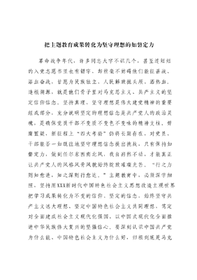 把主题教育成果转化为坚守理想的如磐定力革命战争年代,许多同志大字不识几个,甚至连短短的入党志愿书里也有错字,却丝毫不妨碍他们能征善战、浴血奋战,甘愿为民族独立、人民解放抛头颅、洒热血。追根溯源,就是他们骨子里对马克思主义、共产主义的坚定信仰信念。坚持真理、坚守理想是伟大建党精神的重要组成部分,充分说明坚定的理想信念是共产党人的政治灵魂,是确保党员干部不变质不变色不变味的精神支柱。毋庸置疑,新征程上四大考验仍将长期存在,对党员、干部能否一如既往地坚守理想信念提出挑战,只有保持如磐定力,做到任尔东西南北风,我自岿然不动,才能真正让共产党人的风格风骨风貌始终绽放璀璨光芒。行之力则知愈进,知之深则行愈达。主题教育中,必须深学细照,坚持用XXX新时代中国特色社会主义思想改造主观世界把学习成果转化为不变的信仰、坚定的信念,始终坚守共产主义远大理想、坚定中国特色社会主义共同理想,笃定对全面建成社会主义现代化强国、以中国式现代化全面推进中华民族伟大复兴的坚强信心。要深刻认识中国共产党为什么能、中国特色社会主义为什么好,归根到底是马克思主义行、是中国化时代化的马克思主义行。要全面把握XXX新时代中国特色社会主义思想的世界观和方法论,坚持好、运用好贯穿其中的立场观点方法,用以观察时代、把握时代、引领时代,始终做到在历史前进的逻辑中前进、在时代发展的潮流中发展,任何时候都理想不变、信仰不改、信念不移,永葆共产党人的政治本色与志气骨气底气把主题教育成果转化为对党忠诚的政治品质天下至德,莫大乎忠。忠诚是对党员干部的第一位要求,若貌合神离、言不由衷,乃至搞两面派、做两面人,只会给党的事业带来损害,同时也暴露出参加革命的投机心理、为官从政的别有用心。无论是长征路上矢志不移跟党走,还是社会主义革命与建设时期党叫干啥就干啥,抑或改革开放和社会主义现代化建设时期坚决服从组织决定,听从组织安排、新时代把党中央决策部署落到实处,都是无数共产党人对党忠诚,以党的旗帜为旗帜、以党的意志为意志、以党的使命为使命才让党团结成为一块坚硬的钢铁,始终葆有强健的领导力、强大的战斗力。奋进强国建设、民族复兴新征程,各种可以预料、难以预料的矛盾风险挑战只会多、不会少更加需要党员干部对党忠诚,心往一处想、劲往一处使,使党始终成为坚强领导核心、成为全国人民的主心骨。一语不能践,万卷徒空虚。广大党员、干部要把主题教育成果转化为对党忠诚的政治品质,切实做到在党言党在党爱党、在党忧党、对党尽责、为党尽忠、永不叛党。XXX同志成为党中央的核心、全党的核心,是历史的选择、人民的选择,党的XX大报告提出的两个确立是推动党和国家事业发展、应对前进道路上一切不确定性的最大确定性、最大底气、最大保障,全体党员、干部务必要深刻领悟两个确立的决定性意义,坚决做到两个维护以对党绝对忠诚推动中华号巨轮行稳致远。把主题教育成果转化为实干担当的生动实践全面建设社会主义现代化国家是充满光荣和梦想的远征,没有捷径,唯有实干。尤其发展是我们党执政兴国的第一要务,高质量发展是全面建设社会主义现代化国家的首要任务,决定了以中国式现代化打破现代化=西方化的迷思,展现独特魅力,创造人类文明新形态,必须在高质量发展上不断有新进展、新成就、新面貌。同时社会主义是干出来的,新时代是奋斗出来的。新征程上,党员、干部必须认识到担当作为只有进行时、没有完成时,必须始终心怀国之大者,事不避难、义不容辞、责无旁贷,奋进新征程、建功新时代,努力跑好属于自己的接力棒。有多大担当才能干多大事业,尽多大责任才会有多大成就。要通过主题教育,让党员、干部切实把心思、精力聚焦于推动经济社会高质量发展上,做到既为一域争光,又为全局添彩。要完整准确全面贯彻新发展理念努力推动构建新发展格局,实现质量变革、效率变革、动力变革,达至更高质量、更有效率、更加公平、更可持续更为安全的发展。要把党的XX大报告中统筹推进五位一体总体布局、协调推进四个全面战略布局的决策部署落到实处,瞄准新时代我国社会主要矛盾的变化,不断抓重点、补短板、强弱项、填洼地,推动中国式现代化展现更为强大的说服力、吸引力、感召力。每名党员、干部都要立足本职工作岗位作贡献,发扬拓荒牛闯的精神老黄牛干的作风,始终成为发展的开路人、群众的领路人。把主题教育成果转化为为民造福的务实行动江山就是人民,人民就是江山。百余年来,我们党坚持全心全意为人民服务的根本宗旨,付出的一切牺牲、进行的一切斗争、作出的一切奉献,都是为了让人民过上好日子。同时也正是权为民所用、情为民所系、利为民所谋人民紧紧凝聚在党的周围,党干革命、搞建设、抓改革才有了最大底气、根本保障。无论是人民用小米饭养活党、把最后的亲骨肉送上战场,还是用独轮车推出淮海战役的胜利、用小