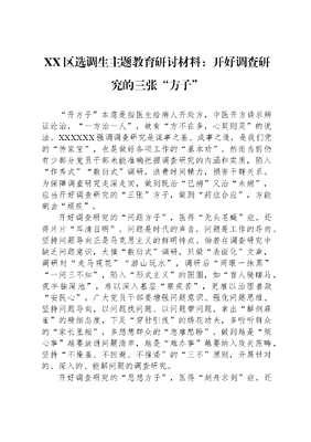 XX区选调生主题教育研讨材料:开好调查研究的三张方子开方子本意是指医生给病人开处方,中医开方讲求辨证论治,一方治一人,故有方不在多,心契则灵的说法。XXXXXX强调调查研究是谋事之基、成事之道,是我们党的传家宝,也是做好各项工作的基本功。然而当前仍有少部分党员干部未能准确把握调查研究的内涵和实质,陷入作秀式敷衍式调研,浪费时间精力,损害干群关系。为保障调查研究走深走实,做到既治已病又治未病,应当开好调查研究的三张方子,做到药症合应,方能剜去顽疾。开好调查研究的问题方子,医得无头苍蝇症,还得片片耳清目明。问题是时代的声音,问题是工作的导向。坚持问题导向正是马克思主义的鲜明特点。倘若在调查研究中缺乏问题意识,大搞敷衍式调研,只做表面化文章,调研时走马观花游山玩水,调研后两眼一抹黑一问三不知,陷入形式主义的囹圄,如盲人骑瞎马,夜半临深池,难以深入基层察疾苦,更难以治理善政安民心。广大党员干部要增强问题意识、强化问题思维、坚持问题导向,以问题找问题、以问题带问题,拿出解剖麻雀的精细态度,下足穿针引线的绣花功夫,多听听群众的家长里短,多想想群众的急难愁盼,做到越是烦心事越要放进问题清单,越是难办事越要纳入攻关范畴,坚持不掩盖、不回避、不推诿的三不原则,开展针对的、深入的、能解问题的调查研究。开好调查研究的思想方子,医得刻舟求剑症,还得处处量体裁衣。刻舟求剑是刻板拘泥、思想僵化的典型代表,现如今刻舟求剑式调研更是不知变通、墨守成规的反面教材。将调查研究放入一套模子,照搬优秀地区的先进方法,企图以不变应万变,试图用一把钥匙打开所有锁,全然不顾实际情况,不理百姓呼声,不想可行程度,只会导致调查研究偏离原本方向,无法达到预期效果。XXXXXX强调,调研方法要多样化,一种方法不如几种方法好。要大胆创新,多管齐下,提高调研工作的效率和调研成果的质量。广大党员干部应打破思维定式的束缚,突破固有经验的藩篱,针对不同的调研主题、调研目标、调研内容,制定不同的调研思路、调研方法、调研形式,既要用好走访、座谈、问卷这几大法宝,又要依托大数据、新媒体、云计算这几颗新星,将微观与宏观结合,定性与定量结合,用灵活科学的手段为调查研究保驾护航。开好调查研究的民生方子,医得官样文章症,还得各个喜笑开颜。从来治国者,宁不忘渔樵。从太行山上的顶风踏雪到黄土高原的两次凝望,从巍巍秦岭的切实守护到千年蜀道的殷殷关切,XXXXXX一次又一次跋山涉水、不畏艰辛,将自己的身心与广大群众紧紧联系在一起,感知百姓冷暖,倾听民众心声,为全党大兴调查研究做出了躬先表率。知屋漏者在宇下,知政失者在草野。囿于办公室翻文山,倒表海是看不出问题矛盾的,更是解不了万虑千愁的。广大党员干部一定要摒弃出发一车子、开会一屋子、发言念稿子式调研,充分利用好第二批主题教育契机,眼睛朝下、步子迈下、身子俯下、架子放下,坐一坐群众的热板凳,尝一尝百姓的家常菜,勤接地气,勤听嘘声,用土话、情话、暖心的话让群众放下戒备、敞开心扉、倒出苦水,做好事、实事、利民的事让群众愁容舒展、愁思舒缓、愁心舒畅。