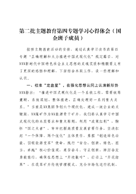 第二批主题教育第四专题学习心得体会(国企班子成员)按照主题教育活动的安排,通过认真学习读书班第四专题正确理解和大力推进中国式现代化规定篇目,对XXX新时代中国特色社会主义思想的灵魂实质和精髓要义有了更深的感悟和理解,下面结合本职工作,谈一些理解和认识。一、校准定盘星,在强化思想认同上认清新形势XXX指出:推进中国式现代化是一个系统工程,需要统筹兼顾、系统谋划、整体推进,正确处理好一系列重大关系。当前是XX集团争创六个现代化、建成一流企业的关键期,XX煤矿作为XX能源骨干矿井,我们将认真学习中国式现代化的本质要求和重大原则,利用政策红利,胸怀国之大者,牢牢把握高质量发展首要任务,坚决扛起一个保障、两个优化主体责任,勇担创造绿色动能、引领能源变革使命,践行安全、创新、绿色、担当、卓越核心价值观,艰苦奋斗、守正创新,踔厉奋发勇毅前行,确保在思想上开枝散叶、行动上开花结果,在改革矿井传统管理模式、完全市场化运行机制、升级传统生产方式、推进双重预防机制建设等方面下大力气,渗透到矿井安全生产、经营管控、改革创新的每一个环节,提升运用新思想、新方法推动工作的能力,实现各项工作再强化、再提升、再跨越,凝心聚力赋能高质量发展,谱写XX示范矿井建设新篇章。二、掌握金钥匙,在强化管理创新上提升新能力。XXX在党的XX大报告中指出:深入推进改革创新,坚定不移扩大开放,着力破解深层次体制机制障碍,不断彰显中国特色社会主义制度优势,不断增强社会主义现代化建设的动力和活力,把我国制度优势更好转化为国家治理效能。XX集团党委书记、董事长XX在2023年工作会议中指出:要坚定不移把改革创新作为第一动力。落实国有企业创新驱动高质量发展十条意见,深化现代企业制度、三项制度、市场化经营机制、混合所有制等全方位改革,实施科技研发、人力资源、数字转型等多领域创新,推动质量变革、效率变革、动力变革,持续提升企业核心竞争力。我们将深入贯彻实施五大创新攻坚工作部署,厚植企业核心竞争能力,在新一轮发展中抢占先机,开创高质量发展新局面积极构建XX煤矿四用五促人才文化体系,实施1247人才发展规划,让事业激励人才,让人才成就事业,为矿井高质量发展提供坚实人才保障。坚持用活三大创效平台,发挥金点子银点子成果转化、双创劳模(技能大师)创新工作室三大创新平台作用,拓展创新创效广度和深度。全力推进智能化矿山建设,深化绿色矿山建设,打造绿色高效、低碳环保示范矿井。三、焕发精气神,在强化党建工作上务求新成效中国式现代化是中国共产党领导的社会主义现代化,党的领导凝聚建设中国式现代化的磅礴力量。坚持党的领导、加强党的建设,是国有企业的光荣传统,是国有企业的根和魂。我们将树牢抓好党建是最大政绩理念,深推双入双创党建工作模式和兖矿新时代—融·创党建品牌落地,坚持党建工作与矿井中心工作紧密融合,以XXXX党建品牌为创新动力,秉持融创赋能同舟领航核心理念,推动党建工作全面加强、全面进步、全面过硬。以支部为点,以专业为线,创新载体深化拓展,力争创建一批基层精品党建品牌,有序实现一支部、一特色、一品牌创建目标,把党建工作质效转化为推动矿井高质量发展的强劲动能。加大作风整治力度,以优良作风推动实践、以优良作风促进工作、以优良作风成就事业,积极营造干事创业、向上向善、公平公正良好氛围。创新培育XXXX企业文化品牌,提升全员的归属感、认同感、自豪感,增强助推矿井发展的软实力,聚力建设本质安全、生态优美、智能高效、人事相宜的XXXXX。实践发展永无止境,认识真理永无止境。在下一步工作中,我们将以学习贯彻XXX新时代中国特色社会主义思想为引领,勇担中国式现代化新使命,持续推动主题教育见行见效,聚力赋能矿井高质量发展,谱写XXXX矿井建设新篇章。