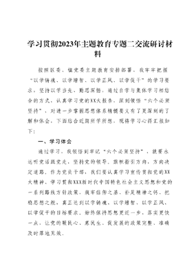 学习贯彻2023年主题教育专题二交流研讨材料按照区委、镇党委主题教育安排部署,我牢牢把握以学铸魂、以学增智、以学正风、以学促干的学习要求,坚持以学当先、勤思深悟,通过自学与集体学习相结合的方式,认真学习党的XX大报告,深刻领悟六个必须坚持,对进一步掌握思想体系精髓要义有了更深刻的了解和体会,下面结合近期所学所想,现将学习心得汇报如下:一、学习体会通过学习,我领悟到牢记六个必须坚持,就要永远听党话跟党走,坚持党的领导。旗帜指引方向,方向决定道路。作为党员干部,我们要认真学习宣传贯彻党的XX大精神、学习贯彻XXX新时代中国特色社会主义思想和党的一系列路线方针政策,筑牢信仰之基、补足精神之钙、把稳思想之舵,真正达到以学铸魂、以学增智、以学正风、以学促干的目标要求。始终保持思想更近一步,落实更快一点,让党的暖民心、惠民生、促发展的政策完整、准确及时落地见效。通过学习,我领悟到牢记六个必须坚持,就要始终坚持人民至上,站稳人民立场。历史是人民书写的。作为党员干部,始终牢记全心全意为人民服务的宗旨,始终牢记中国共产党的伟大历史使命,驰而不息纠治群众身边的不正之风,把好传统带进新征程,将好作风弘扬在新时代。坚持从现实镇情、村情出发,坚持贯彻全过程人民民主,尊重人民群众,遇事和老百姓商量着办,把实事办实好事办好,实事求是,真心、真意、真情为百姓谋福利。通过学习,我领悟到牢记六个必须坚持,就要使命在肩、责任在胸、冲锋在前。作为党员干部,要深植理论之根,牢筑信仰之基,积极提炼党性修养,永远发挥先锋模范作用。不断适应新形势新任务新命题,常怀为民之心,常做有用之功,常怀若谷之心,常葆奋进之态,以时不我待、只争朝夕的精神投入工作,奋发有为推进党和国家各项事业。要紧密结合镇党委中心工作,求真务实、真抓实干、紧张快干,坚决反对和防止形式主义,务求取得实效。二、存在的突出问题(一)在政治素质方面。一是理论学习不走心不深入没有做到学干结合、以学促干。没有深刻理解领会精神实质和丰富内涵,总觉着通过集体学习和集中研讨就够用,用什么学什么反而更具针对性。逐步放松了平时的自学和思考,放松了对党性修养的锻炼,平时学习接受新知识比较被动,学习的针对性、实效性不强,导致出现了重抓具体业务、轻理论学习的现象,脱离实际学习理论,不得要领,根源还是在思想上,主要是党性修养不够。比如在专题一学习上,就属于被动学习状态,让学什么就学什么,说到底还是党性修养不够。二是政治站位不高。觉着只要在大是大非面前与党中央保持高度一致就不会有问题,比如在专题一学习中,就对两个确立、XXX新时代中国特色社会主义思想深研细钻不够,学习党的XX大报告精神的力度还不够大,有时不能从政治、从全局角度去思考工作导致对两个确立的政治意义和深刻内涵把握不准,落实中央重大决策部署和市、区委要求不全面,履行政治责任还不到位。(二)在担当作为方面。一是干事创业的精气神不足在落实具体工作中,缺乏紧迫感、没有责任感,攻坚克难的冲劲闯劲不足,关键时刻扛不住、危难关头冲不上。比如XXXXXXXXX。二是创新实践不够主动。在大胆实践、勇于探索、攻坚克难的劲头有所欠缺,自己对此虽有认识,但实践的勇气不足,提高素质能力的紧迫感不强,行动还比较缓慢。特别是用好调查研究这项传家宝的意识还不够强烈,研究解决分管工作的新情况、新问题力度不大;贯彻落实上级决策部署不够坚决主动,存在等靠依赖思想。(三)在工作本领方面。一是面对复杂问题时束手无策、无从下手。我是XXXX年才到XXXX镇工作,之前一直在区直部门历练,农村工作经验明显不足,面对一些历史遗留的矛盾和敏感问题缺少勇气和办法,没有从更高的标准更深的层次去研究工作、解决问题。工作上对经验丰富的领导和同事有依赖心理,面对困难和问题,总是想着让领导出面解决,挑重担、讲担当的勇气不足。二是在化解信访矛盾、防范化解风险和隐患等本领欠缺。比如,在信访接待大厅接待群众时,大多数是以XXXXXXX(四)在工作作风方面。一是工作进度缓慢、办事拖拉、人民至上思想树得不牢,遇事明哲保身,斗争精神不强。习惯于走套路、吃老本和用老眼光看新问题,面对工作推进中的困难,信心和勇气不足,缺乏改革创新、锐意进取的精气神。遇到困难,客观因素想的多主动谋划少,还存在等靠要思想,缺少从高标准抓好信访工作、政法工作的决心和毅力,缺乏瞄准先进的魄力和勇气。二是在开展工作时没有把维护和发展群众利益作为根本出发点和落脚点。比如,有时下村检查调研,仅限于召开座谈会或者跟村干部了解情况,而没有敲开村民家的门向村民了解实际情况,没有真正做到扑下身子走进村民身边、走进村民心里,没有与群众打成一片,不能主动积极到困难矛盾集中、群众意见多的地方去了解情况、研究问题、思考对策。三、改进工作的措施(一)提升政治素质