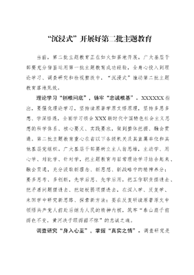 沉浸式开展好第二批主题教育当前,第二批主题教育正在如火如荼地开展,广大基层干部要充分借鉴运用第一批主题教育成功经验,全身心投入到理论学习、调查研究和检视整改中,沉浸式推动第二批主题教育落地见效。理论学习刨根问底,铸牢忠诚根基。XXXXXX指出,要强化理论学习,坚持读原著学原文悟原理,坚持多思多想、学深悟透,全面学习领会XXX新时代中国特色社会主义思想的科学体系、核心要义、实践要求,做到整体把握、融会贯通。第二批主题教育重心在省以下各级机关及其直属单位和其他基层党组织。广大基层干部要树立主人翁思维,主动学、用心学、对比学、针对学,把主题教育与日常理论学习结合起来、融会贯通,充分汲取新理念、新思想、新战略中的精神养分;要多思考、多创新,先学后思、先学后用,把工作职责摆进去、把矛盾问题摆进去、把短板弱项摆进去,在深入学、反复学、来回学中研究新思路、探索新方法;要在反复研读原著原文中领悟共产党人前赴后继为人民的精神内核,筑牢泰山崩于前而色不变,黄河决于顶而面不惊的忠诚之魂。调查研究身入心至,掌握真实之情。调查研究是获得真知灼见的源头活水,是做好工作的基本功。大兴调查研究,以深化调查研究推动解决发展难题,是学习贯彻XXX新时代中国特色社会主义思想主题教育的重要内容和鲜明特色。知屋漏者在宇下,知政失者在草野。广大基层干部要充分利用好身在基层的绝对优势,深入调查研究,为上级决策部署提供源源不断的科学依据和现实参考。要根除拍照取景沿途看花道听途说等形式主义调研思想,放下背后背着的手,低下人前仰着的头,换掉一尘不染的鞋,走进田间地头,深入村寨院落,虚心、用心、细心听一听群众呼声、看一看基层实况、聊一聊急难愁盼。要在一线发现问题、分析问题、解决问题,及时总结新经验、新办法;要拜群众为师,把办公室里看不到、学不到的经验带回去,为更高效、更科学的决策提供服务。检视整改深入透彻,根治顽瘴痼疾。XXXXXX强调要突出问题导向,查不足、找差距、明方向,接受政治体检,打扫政治灰尘,纠正行为偏差,解决思想不纯、组织不纯方面存在的突出问题,不断增强党的自我净化、自我完善、自我革新、自我提高能力。广大基层干部要用好检视整改这面放大镜显微镜照妖镜,深入查找对照、深刻检视剖析、深挖问题根源,以抓铁有痕、踏石有印的工作作风,真刀真枪直面问题。要利用好主题教育契机重新审视自己,敢于揭短亮丑,敢于自我斗争,坚持问题导向、增强问题意识,深入细致查不足、找差距,把问题整改贯穿主题教育始终,针对自身存在问题建立短、中、长期整改计划,坚持当下改与长久立相结合,在检视整改中坚持精准把脉、对症下药、逐项销号,让人民群众切实感受到解决问题的实际成效。