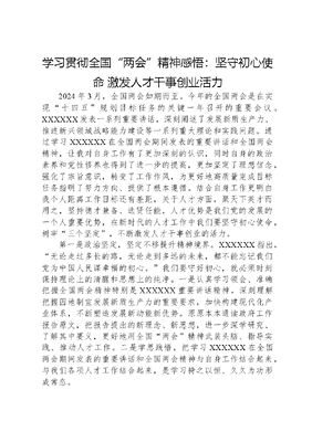 学习贯彻全国两会精神感悟:坚守初心使命 激发人才干事创业活力2024年3月,全国两会如期而至。今年的全国两会是在实现十四五规划目标任务的关键一年召开的重要会议。XXXXXX发表一系列重要讲话,深刻阐述了发展新质生产力、推进新兴领域战略能力建设等一系列重大理论和实践问题。通过学习XXXXXX在全国两会期间发表的重要讲话和全国两会精神,让我对自身工作有了更加深刻的认识,同时自身的政治素养和党性修养也得到了进一步的提高,更加坚定了理想信念,强化了宗旨意识,转变了工作作风,为更好地高质量完成目标任务指明了努力方向、提供了根本遵循。结合自身工作更明白我个人距离工作目标还有差距,关于人才方面,聚天下英才而用之,坚持德才兼备、选贤任能,人才优势是我们党的发展的一个人重要优势,在新时代的人才工作中我们要坚守初心使命,树牢三个坚定,不断激发人才干事创业的活力。第一是政治坚定,坚定不移提升精神境界。XXXXXX指出,无论走过多长的路,无论走到多远的未来,都不能忘记我们党为中国人民谋幸福的初心。我们要守好初心,就必须时刻保持理论上的清醒和思想上的纯净。一是认真学习领会、准确把握全国两会精神特别是XXXXXX重要讲话精神。深刻理解把握因地制宜发展新质生产力的重要要求,加快构建现代化产业体系,不断塑造发展新动能新优势。原原本本通读政府工作报告原文,把报告提出的新理念、新思想,进一步深学研究、了解其中要义,更好地用全国两会精神武装头脑、指导实践、推动人才工作。二是学思践悟,把学习XXXXXX在全国两会期间发表的重要讲话和全国两会精神与自身工作结合起来,与我们各项人才工作结合起来,是学习持之以恒、久久为功形成常态。第二是坚定完善人才体系,健全人才队伍保障。今年全国两会,新质生产力成为热词。发展新质生产力,需要创新人才。XXXXXX在参加江苏代表团审议时也指出,为创新人才脱颖而出、尽展才华创造良好环境。我们要精心营造人才无忧环境,打造全方位全要素全过程人才服务体系,建立人才日常考核、工作考核制度,健全任人唯贤、以德为先的工作机制,完善基本的配套设施和福利待遇,健全人才安居保障机制,为人才提供高品质居住环境,不断提升党管人才工作水平。这样才能增强我们的人才的政治认同、思想认同、情感认同,才能真正让我们基层、让一线能够在人才工作、人力资源服务工作当中,能够找到自己的位置,能够更好的发挥作用。第三是坚定体制机制改革,强化人才支撑。发展是第一要务,人才是第一资源,创新是第一动力。新征程上,科学用才要提升人才驱动效能,健全科学有序的人才评价机制。人才是第一资源,好的体制机制制度是靠人探讨出来的,好的体制机制也是靠人来完善出来的。干任何事我们都要有目标,坚持和完善中国特色社会主义制度、推进国家治理体系和治理能力现代化建设,都离不开各方面优秀的人才的支持。我们更应大力实施引才聚才工程,建立健全更加有效的人才政策体系,推进各类人才队伍建设,创新人才考核机制,健全人才交流机制,完善人才激励机制,鼓励人才敢于尝试、大胆突破,实现人尽其才、才尽其用、用有所成为推动人才工作高质量发展提供坚强的人才保障和智力支撑。古往今来,人才资源一直是富国之本、兴邦大计,面对新形势新格局,人才工作的开展不仅要别出心裁,更要知往鉴今、古为今用。育才造士,为国之本,坚持和完善中国特色社会主义制度、推进国家治理体系和治理能力现代化,是全党的一项重大战略任务。这项任务最终还是会落在我们每一个人的身上。贯彻好全会精神,就是我们人才工作的重要职责使命,在以后的学习、工作和生活中,更要立足工作实际,进一步理文可居文库——海量学习资料,手机电脑均可下载www.wenkeju.com清工作思路,狠抓任务落实,以实实在在的工作业绩,推动人才工作迈向新台阶。文可居文库——海量学习资料,手机电脑均可下载www.wenkeju.com