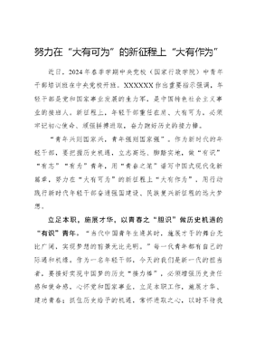 努力在大有可为的新征程上大有作为近日,2024年春季学期中央党校(国家行政学院)中青年干部培训班在中央党校开班。XXXXXX作出重要指示强调,年轻干部是党和国家事业发展的生力军,是中国特色社会主义事业的接班人。新征程上,年轻干部重任在肩、大有可为,必须牢记初心使命、顽强拼搏进取,奋力跑好历史的接力棒。青年兴则国家兴,青年强则国家强。作为新时代的年轻干部,要把握历史机遇,立志高远、脚踏实地,做有识有志有为青年,用青春之笔谱写中国式现代化新篇章,努力在大有可为的新征程上大有作为,用行动践行新时代年轻干部奋进强国建设、民族复兴新征程的远大梦想。立足本职,施展才华,以青春之胆识做历史机遇的有识青年。当代中国青年生逢其时,施展才干的舞台无比广阔,实现梦想的前景无比光明。每一代青年都有自己的际遇和机缘。作为一名年轻干部,今天的我们是新一代的担当者,要接好实现中国梦的历史接力棒,必须增强历史责任感和使命感,心怀党和国家事业,立足本职工作,施展才华、建功青春;抓住历史给予的机遇,常怀进取之心,以时不待我的激情斗志走在时代前列,积极面对新时代的风风雨雨,以直面困难、破解障碍的勇气在实现民族复兴的赛道上劈波斩浪,用青年人特有的气魄和胆识打开工作局面,让青春在全面建设社会主义现代化国家的火热实践中绽放绚丽之花。立志高远,锚定方向,以青春之坚定做勇立潮流的有志青年。立志而圣则圣矣,立志而贤则贤矣。少年周恩来为了中华之崛起而读书,立下面壁十年图破壁的远大志向。志向是青年干部成长的航向标和不懈奋斗的螺旋桨,年轻干部唯有志存高远、锚定方向,心怀国之大者,心系复兴使命,将个人理想同国家前途结合起来,将个人命运与国家命运联系起来,以为有牺牲多壮志,敢教日月换新天的激情,擦亮好男儿志在四方的原色、保持初生牛犊不怕虎的底色、淬炼一代更比一代强的亮色,争做壮志满怀、奔腾不息的时代后浪,用青春逐梦唱响请党放心,强国有我的主旋律,激荡起推动时代发展的澎湃春潮。立足当下,脚踏实地,以青春之奋斗做引领时代的有为青年。怀抱梦想,方有行动目标;脚踏实地,才能行稳致远。嫦娥揽月、北斗组网、天问探火、蛟龙入海……回望过往的奋斗路,一项项重点工程、一个个国之重器、一次次创文可居文库——海量学习资料,手机电脑均可下载www.wenkeju.com新突破,印证着伟大梦想都是拼出来、干出来的。年轻干部要立足当下、脚踏实地,将工匠精神内化为一种习惯,干一行、爱一行、钻一行,一丝不苟地做好每件小事,锤炼意志品质、练就过硬本领、在平凡中书写不凡,努力在大有可为的时代大有作为;勇于承担起自己的责任,走实干家的道路,以明知山有虎,偏向虎山行的大无畏精神,逢山开路,遇水架桥的拼搏精神,坚定信心、埋头苦干、勇毅前行,在时代洪流中激流勇进。文可居文库——海量学习资料,手机电脑均可下载www.wenkeju.com