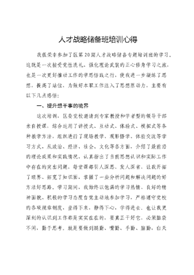 人才战略储备班培训心得我很荣幸参加了区第20期人才战略储备专题培训班的学习。这既是一次接受党性洗礼、强化理论武装的正心修身学习之旅,也是一次更好推动工作的学思悟践之行,使我进一步凝练了思想,提高了站位,为做好本职工作注入了思想原动力,主要有以下几点感悟:一、提升想干事的境界这次培训,区委党校邀请到专家教授和学者型的领导干部亲自授课,综合运用了讲授式、互动式、体验式、模拟式等各种教学方法,组织进行了现场教学、观影悟学、体验交流等学习方式,从政治、经济、社会、文化等各方面,介绍了最前沿的理论成果和实践情况,认真指出了当前思想认识和实际工作中存在的突出问题,每堂课都引人深思、发人深省,让我开拓了眼界、拓宽了知识面,掌握了一些分析问题和解决问题的好方法好思路。学习期间,我始终以饱满的学习热情、良好的精神面貌、积极的学习态度自觉主动地参加学习,严格遵守党校的各项规章制度,坐得下来,静得下心,学得进去。也让我更深刻的认识到工作都是实实在在的,要真正干好它,必须脑袋不闲,勤于思考。就是要做到腿勤、嘴勤、手勤、脑勤,白天到基层走一走、看一看、听一听、讲一讲,晚上写点笔记、过过电影、作些思考。二、锻造敢干事的作风从区博物馆到居民社区到红色教育基地、再到街头志愿服务,通过这一系列现场教学活动,观看到了洪灾来临时大家众志成城、昼夜奋战,打赢了保障人民群众生命财产安全的攻坚战;参观到洪灾后正在逐步重建发展的乡村。自己真抓实干的指向更加清晰,奋发求新的行动更加务实,这些发生在身边的感人故事让我真切地感到自己的思想受到了深刻洗礼、宗旨意识得到了极大提升、党性得到了巩固加强,自觉在思想上、政治上、行动上同以XXXXXX为核心的党中央保持高度一致,干事创业的信心与精神更加坚定与振奋。营商环境是市场主体生存发展的土壤,更是经济社会高质量发展的源泉,良好的营商环境是企业敢干的前提。今年,全区持续推进营商环境提升年活动,作为园区人,就是要牢固树立人人、事事、案案都是营商环境的理念,聚焦市场主体最痛之处敢为,扎实开展服务市场主体活动,在优化营商环境方面展现应有担当。三、提升干成事的能力文可居文库——海量学习资料,手机电脑均可下载www.wenkeju.comXXXXXX指出:干部敢于担当作为,这既是政治品格,也是从政本分。XXXXXX还强调:全面建成社会主义现代化强国、实现第二个百年奋斗目标,以中国式现代化全面推进中华民族伟大复兴,是全党全国各族人民在新时代新征程的中心任务。这是前无古人的开创性事业,前进道路上,必然会遇到大量从未出现过的全新课题、遭遇各种艰难险阻、经受许多风高浪急甚至惊涛骇浪的重大考验。唯有始终保持锐意进取、敢为人先、迎难而上的奋斗姿态,积极担当作为、敢于善于斗争,才能胜利推进强国建设、民族复兴的历史伟业。作为一名党员干部,我们要深入学习贯彻XXXXXX重要讲话精神,牢记职责使命,胸怀国之大者,主动融入工作大局,从要我做转变到我要做做得更好,以时时放心不下的责任感、积极担当作为的精气神和求极致、止于至善的高标准做好各项工作。培训学习期间,专家与领导的前沿理论与实际工作的有效结合,在《提高战略思维能力》《有效提升执行力》《责任与担当的七个习惯》等课程的学习中,架构起了我观察现实和展望未来的望远镜,为分析与解决问题提供了显微镜。在我区改革发展的过程中越往前进,新情况、新问题就越多,难以预料的风险就会越多,我们不能用一成不变的眼光去看待问题,也不能用刻舟求剑的姿态去解决问题,要用联文可居文库——海量学习资料,手机电脑均可下载www.wenkeju.com系、发展的眼光看待事物。不断加强创新精神,发挥自己新知识优势,多学习、多思考,立足实际大胆创新,不让套路束缚,不让惯性羁绊,打破思维定势,摆脱路径依赖,在日常工作中细化目标,量化任务,并不断进取。回首学习期间的点点滴滴,俯有拾、仰有取,俯仰之间,皆是收获,值得认真铭记和回味。XXXXXX在2024年春季学期中央党校(国家行政学院)中青年干部培训班开班之际作出重要指示强调,新征程上,年轻干部重任在肩、大有可为,必须牢记初心使命、顽强拼搏进取,奋力跑好历史的接力棒。我将用心体会XXX的殷切期望和深情厚爱,持续学深悟透五个自觉,将自觉的要求转化为必然的行动,以春光为序,追梦前行,作为青年一代我将坚定信仰、迈稳脚步、锚准目标、接续奋斗,才能不负时代、无愧使命,为公司踔厉奋发、笃行不怠,为我区高质量发展贡献更多青春力量。文可居文库——海量学习资料,手机电脑均可下载www.wenkeju.com