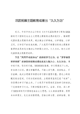 巩固拓展主题教育成果当久久为功近日,中共中央办公厅印发《关于巩固拓展学习贯彻XXX新时代中国特色社会主义思想主题教育成果的意见》,强调要巩固拓展主题教育成果,建立健全以学铸魂、以学增智、以学正风、以学促干的长效机制。广大党员干部要切实将主题教育取得的成果转化为推动工作的强大动力,久久为功,持之以恒巩固拓展主题教育成果。下足风雨不动安如山的持续学习之功,以深学细悟常学常新的韧劲持续推动理论武装入脑入心、久久为功。博学而不穷,笃行而不倦。XXXXXX强调,学习需要沉下心来,贵在持之以恒,重在学懂弄通,不能心浮气躁、浅尝辄止、不求甚解。此次主题教育将理论学习摆在重要位置,理论上的清醒是政治坚定、行动自觉的前提,主题教育虽然已经收官,但是理论学习不能止步,广大党员干部要铆足坚持学习的韧劲,下足持续学习之功,不断加强理论学习,全面、系统、深入学习XXX新时代中国特色社会主义思想,认认真真读原著、原原本本学原文、扎扎实实悟原理,坚持以学为要、深学细悟、常学常新,抓住空闲学、持之以恒学,下足理论学习的真功夫、实功夫、细功夫,持续深化巩固主题教育学习成果,内化于心、外化于行,持续推动理论武装入脑入心、久久为功。下足绝知此事要躬行的持续调研之功,以深研细究实事求是的闯劲持续推动为民造福走深走实、久久为功。不登高山,不知山之高;不临深谷,不知地之厚。XXXXXX强调,调查研究是谋事之基、成事之道,没有调查就没有发言权,没有调查就没有决策权。调查研究是实现党的实事求是思想路线的重要途径,也是此次主题教育的关键环节,广大党员干部要从实际出发,下足持续调研之功,深研细究、实事求是,深入基层一线开展调查研究,主动到情况复杂、矛盾突出的地方去,要铆足干事创业的闯劲,始终带着问题进行调查研究,主动倾听群众呼声、了解群众疾苦,抓住主要矛盾,找准问题的症结所在,坚持结果导向,解决好群众急难愁盼的问题,稳扎稳打、踏踏实实做好调查研究,把工作切实落实到群众的心坎上,推动为民造福走深走实、久久为功。下足不破楼兰终不还的持续整改之功,以深挖细掘追根溯源的拼劲持续推动取信于民见行见效、久久为功。不贵于无过,而贵于能改过。XXXXXX指出,要坚持边学习、边对照、边检视、边整改,把问题整改贯穿主题教育始终,让人文可居文库——海量学习资料,手机电脑均可下载www.wenkeju.com民群众切实感受到解决问题的实际成效。检视整改是取得主题教育实效的关键环节。主题教育虽然已经结束,但持续抓实问题、及时整改落实仍要继续,广大党员干部要把检视整改当作一项长久性工作看待,对标整改要求,在检视上动真格,在整改上求实效,要铆足真整改、真落实的拼劲,深挖细掘、追根溯源、直达病灶,找准问题的关键,以刀刃向内、刮骨疗毒、猛药去疴的勇气与决心整改落实问题,对于不同的问题要分类施策、对于整改措施要及时建章立制、对于整改完成的问题要及时回头看,推动取信于民见行见效、久久为功。文可居文库——海量学习资料,手机电脑均可下载www.wenkeju.com