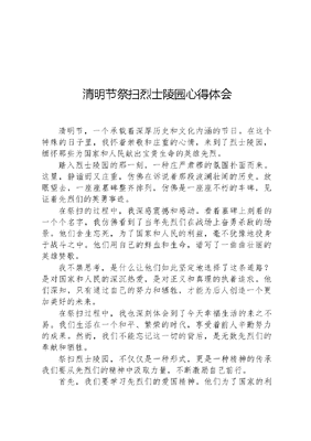 清明节祭扫烈士陵园心得体会清明节,一个承载着深厚历史和文化内涵的节日。在这个特殊的日子里,我怀着崇敬和庄重的心情,来到了烈士陵园,缅怀那些为国家和人民献出宝贵生命的英雄先烈。踏入烈士陵园的那一刻,一种庄严肃穆的氛围扑面而来。这里,静谧而又庄重,仿佛在诉说着那段波澜壮阔的历史。放眼望去,一座座墓碑整齐排列,仿佛是一座座不朽的丰碑,见证着先烈们的英勇事迹。在祭扫的过程中,我深感震撼和感动。看着墓碑上刻着的一个个名字,我仿佛看到了当年先烈们在战场上奋勇杀敌的场景。他们舍生忘死,为了国家和人民的利益,毫不犹豫地投身于战斗之中。他们用自己的鲜血和生命,谱写了一曲曲壮丽的英雄赞歌。我不禁思考,是什么让他们如此坚定地选择了这条道路?是对国家和人民的深沉热爱,是对正义和真理的执着追求。他们深知,只有通过自己的努力和牺牲,才能为后人创造一个更加美好的未来。在祭扫过程中,我也深刻体会到了今天幸福生活的来之不易。我们生活在一个和平、繁荣的时代,享受着前人辛勤努力的成果。然而,我们不能忘记这一切的背后,是无数先烈们的奉献和牺牲。祭扫烈士陵园,不仅仅是一种形式,更是一种精神的传承我们要从先烈们的精神中汲取力量,不断激励自己前行。首先,我们要学习先烈们的爱国精神。他们为了国家的利益,不惜牺牲自己的生命。在当今社会,我们要以国家利益为重,自觉维护国家的尊严和荣誉。其次,我们要学习先烈们的奉献精神。他们无私地奉献出自己的一切,为了人民的幸福而奋斗。我们要在自己的工作和生活中,发扬奉献精神,为社会的发展做出自己的贡献。最后,我们要传承先烈们的奋斗精神。他们在艰苦的条件下,顽强拼搏,取得了一个又一个的胜利。我们要在面对困难和挑战时,坚定信心,勇往直前,不断努力奋斗。清明节祭扫烈士陵园,是一次心灵的洗礼。让我们铭记先烈们的功绩,传承他们的精神,为实现中华民族的伟大复兴而努力奋斗。文可居文库——海量学习资料,手机电脑均可下载www.wenkeju.com