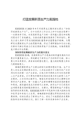 打造发展新质生产力实践地XXXXXX在2023年9月考察黑龙江期间首次提出加快形成新质生产力,在中央经济工作会议上和中央政治局第十一次集体学习时,对发展新质生产力的一系列重大理论和实践问题进行了系统阐述,为推动高质量发展提供了科学指引。黑龙江省认真学习贯彻XXXXXX重要讲话重要指示精神,专题研究发展新质生产力的思路举措,形成了调研报告和行动方案,在新时代新征程着力打造发展新质生产力实践地,为推进强国复兴伟业作出贡献。 深刻领悟发展新质生产力的重大意义 XXXXXX强调,发展新质生产力是推动高质量发展的内在要求和重要着力点。深刻阐述了新质生产力的科学内涵、核心要义和本质要求,具有深刻的理论意义、重大的实践意义和非凡的战略意义。 准确把握新质生产力提出的时代背景和理论价值。生产力是人类社会发展的根本动力。人类社会经历了以蒸汽机广泛应用为标志的第一次产业革命,以电力和内燃机应用为标志的第二次产业革命,以计算机和高科技迅速发展为标志的第三次产业革命,正在迎来以数字化、智能化和生物技术为主要特征的第四次产业革命。每一次重大产业革命都带来经济发展的量变和质变,高质量发展成为新时代主旋律,新质生产力已经展示出对高质量发展的强劲推动力、支撑力,需要新的生产力理论指导新的发展实践。XXXXXX统筹中华民族伟大复兴战略全局和世界百年未有之大变局,准确洞察和把握世界科技和经济发展趋势,创造性提出了新质生产力,深化了对我国经济发展阶段性特征和规律的认识,指引了新一轮科技革命和产业变革,实现了马克思主义生产力理论的新飞跃,是XXX经济思想的最新成果。新质生产力必将带来产业与经济的新变革,既决定了国家的国际竞争力和发展方向,也将为构建人类命运共同体贡献中国智慧、中国力量,展现了中国共产党为人类谋进步、为世界谋大同的天下情怀,体现了中国共产党为中国人民谋幸福、为中华民族谋复兴的初心使命,彰显了我们党是一个重视理论创新并运用理论创新引领发展实践的伟大政党。我们要坚持用党的创新理论武装头脑、推动工作,以新质生产力引领振兴发展,努力走出高质量发展、可持续振兴的新路子。 准确把握新质生产力的科学内涵和核心要义。社会生产力的跃升,必将导致更加强大的先进生产力对传统生产力的更新和迭代。新质生产力是创新起主导作用,摆脱传统经济增长方式、生产力发展路径,具有高科技、高效能、高质量特征,符合新发展理念的先进生产力质态。新质生产力由技术革命性突破、生产要素创新性配置、产业深度转型升级而催生,基本内涵是劳动者、劳动资料、劳动对象及其优化组合的跃升,大幅提升全要素生产率、不断塑造发展新动能新优势,体现了生产力演变规律和生产力升级方向,蕴含着新发展阶段、新发展理念、新发展格局、新质生产力的内在逻辑。发展新质生产力是实现中华民族伟大复兴的必然选择,是建设社会主义现代化强国的坚实支撑,是推动高质量发展、可持续振兴的重要动力,是持续提升国际竞争力的战略举措,也是满足人民群众对美好生活向往的现实需要。我国用几十年的时间走完了西方发达国家几百年走过的工业化历程,建成全球最完整、规模最大的工业体系,进入创新型国家的行列,生产力水平和科技创新能力大幅提升,为发展新质生产力奠定坚实基础。新时代新征程,黑龙江要全面贯彻XXXXXX重要指示,着力打造新质生产力实践地,建好建强三基地一屏障一高地,为维护国家五大安全、发展新质生产力、推进中国式现代化作出新贡献。 准确把握新质生产力的本质要求和显著特点。解放和发展文可居文库——海量学习资料,手机电脑均可下载www.wenkeju.com社会生产力,是中国特色社会主义的根本任务。中国式现代化必须以高度发展的社会生产力为支撑,加快形成新质生产力是当务之急。这就需要我们聚焦创新这个特点,抓住质优这个关键,把握先进生产力这个本质,把加快建设现代化经济体系、推进高水平科技自立自强、加快构建新发展格局、统筹推进深层次改革和高水平开放、统筹高质量发展和高水平安全等战略任务落实到位。黑龙江科技资源丰富、创新底蕴深厚,拥有哈工大、哈工程等78个高校,哈兽研、中船重工703所等120个独立科研院所,哈电集团、中国一重等大国重器企业,多项技术成果助力载人航天、火星探测、万米海试等国家战略任务。构建新质生产力是发展的新起点、新动能,我们要继续做好创新这篇大文章,以科技攻关推进技术和业态模式创新,以体制机制改革推进管理和制度创新,推动经济发展质量变革、效率变革、动力变革,为推进龙江全面振兴和中国式现代化提供持久动能。 牢牢把握发展新质生产力的重点任务 XXXXXX强调,必须继续做好创新这篇大文章,推动新质生产力加快发展。我们要坚持创新驱动,把推进中国式现代化作为最大的政治,把坚持高质量发展作为新时代的硬道理,发挥科技和产业基础优势,加快形成