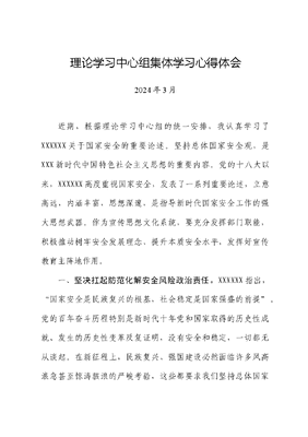 理论学习中心组集体学习心得体会2024年3月近期,根据理论学习中心组的统一安排,我认真学习了XXXXXX关于国家安全的重要论述。坚持总体国家安全观,是XXX新时代中国特色社会主义思想的重要内容。党的十八大以来,XXXXXX高度重视国家安全,发表了一系列重要论述,立意高远,内涵丰富,思想深邃,是指导新时代国家安全工作的强大思想武器。作为宣传思想文化系统,要充分发挥部门职能,积极推动树牢安全发展理念、提升本质安全水平,发挥好宣传教育主阵地作用。一、坚决扛起防范化解安全风险政治责任。XXXXXX指出,国家安全是民族复兴的根基,社会稳定是国家强盛的前提。党的百年奋斗历程特别是新时代十年党和国家取得的历史性成就、发生的历史性变革反复证明,没有安全和稳定,一切都无从谈起。在新征程上,民族复兴、强国建设必然面临许多风高浪急甚至惊涛骇浪的严峻考验,这些都要求我们坚持总体国家安全观,以新安全格局保障新发展格局。宣传部门更要重视意识形态和政治安全,用总体国家安全观武装头脑、指导实践、推动工作,管好用好全媒体平台,引导社会舆论进入客观、理性、爱国、守法的良好氛围,把握好网上舆论引导的时、度、效,使网络空间清朗起来,守牢意识形态阵地,筑牢网络安全屏障,抓牢核心价值培育,提高应对风险挑战能力。二、准确把握安全生产工作面临的风险挑战。安全生产形势仍处于爬坡过坎期,必须更加清醒正视问题,认识到安全生产短板仍然突出,安全发展理念还树立的不牢。近期国内安全事故频发,1.19南阳英才学校重大火灾事故、2.23南京住宅楼火灾事故、3.13河北燕郊镇燃气爆炸事故,教训深刻,令人深省。我们一定要以XXX新时代中国特色社会主义思想为指导,深入宣传贯彻党的XXX精神和XXXXXX关于安全生产重要论述,坚持人民至上、生命至上,坚持统筹发展和安全,坚持安全第一、预防为主,持续树牢安全红线意识。进一步加强安全生产宣传教育阵地建设,以人人讲安全、个个会应急为重点在区内开展策划报道,以线上线下相结合的形式展文可居文库——海量学习资料,手机电脑均可下载www.wenkeju.com开安全生产宣传工作,进一步提升全社会安全意识和避险逃生能力。三、务实有力严守保密工作高压线。保密工作事关全局、事关党的事业发展、事关国家的长治久安,立足工作大局,胸怀国之大者,宣传部门要认真贯彻落实党中央关于保密工作的决策部署和XXXXXX重要指示批示精神,主动谋划加强并改进保密工作,切实增强保密等安全工作的系统性、精准性、科学性。全面落实归口管理要求,认真落实请示报告、业务工作统筹等制度,切实把讲政治的要求贯彻落实到宣传工作的全过程、各方面。建立完善主要领导亲自抓、分管领导主动抓、科室负责人具体抓、全体干部共同落实的管理体系,层层把关、分级负责,做到业务工作与保密工作齐抓共管,相互促进。文可居文库——海量学习资料,手机电脑均可下载www.wenkeju.com