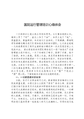 医院运行管理培训心得体会一天的培训让我从热工作到冷思考,从忙事务到提认知,精神上开了窍、能力上加了油、知识上充了电,获益匪浅、教益颇深。本次培训正当其时,干货满满。感谢院领导高瞻远瞩为我们引进如此优秀的培训团队,让大家在短短一天内就感受到了别开生面的培训模式和一次次思想层面上火花的冲击。 其次感谢宋老师团队带给我们一场体验式运营管理能力提升培训,一天下来喊哑了嗓子、拍肿了手掌、烧干了脑袋,身体上疲惫,思想上亢奋,真正用亲身体验来验证了宋老师和邢老师教授的一个个自我如何提升、科室如何管理、医院如何发展的底层逻辑。最后感谢同心队各位同学的认可和支持,大家各个有特长、人人有特色,为了本次培训勇夺第一,八仙过海各显神通,我在你们身上看到了积极向上,顽强拼搏的工作态度,很荣幸与你们在医院这个大圆下组成小圆同心队。下面我就本次培训谈谈我的收获。一、一切都是最好的安排当前,医疗行业黄金时代已过,随着国家层面推动公立医院高质量发展、全国大型公立医院国考排名公布、医保部门强力推行医保支付方式改革和即将到来的大型医院巡查,面对时代大浪潮的排空而来,我们难免感到迷茫和紧张。一切都是最好的安排无疑是一剂醒酒汤,对自己无法控制、无从影响的大浪潮,不敌视、不排斥,欣然接纳已经发生的一切,不破不立、先破后立,立足自身做到最好,关关难过关关过,深刻明白我们虽然是第一批被卷入时代大浪潮的人,但同时我们也是新时代的开路人、大浪潮的弄潮儿!二、运营管理关系你我他先要把蛋糕做大做好,然后再切再分。这次运营管理能力提升培训恰恰是一次教大家认识到如何做大做好蛋糕的专题课。在患者对医疗服务的期望越来越高、医疗技术飞速发展、信息网络高度繁荣的今天,医院成立运营部十分必要。我们常说医院好的管理就是行政服务临床、临床服务患者,通过今天的培训我还要追加一句,运营服务医院!运营部是一个服务组织,是从医院整体层面为全体职工和来院患者提供服务的组织,关系到我们每一个人。运营部不是用来替代某一个职能部门的功能,而是来帮助整合医疗服务流程,提高医疗服务质量及患者满意度,提升品牌知名度,全方位增加医院效益的部门。它充分整合与优化各部门之间的协作,统筹复杂项目管理;真正推动精细化的医疗服务流程,标准化、流程化解决医院管理难题;分析各项经营数据,提出解决方案,推动医院战略目标实现,有效、及时、全面向院领导提供有效的管理和决策支持。三、文化建设是医院的魂医院文化是医院的灵魂,是推动医院发展不竭的动力。一个有着旺盛生命力的医院,必然有着优秀的思想文化建设为指引。宋老师对特鲁多墓志铭的解读,让我明白一个人,如果心灵有温度,他的服务就会产生温度;一个医院,如果每个人都有温度,那么这个医院一定会产生温度。商医是一支有着光荣传统和优良作风的队伍,八十三年来,先后涌现出了X等一大批医者仁心有温度的好医生,他们正是医院发展过程中自发形成的优秀文化代表。酒香也怕巷子深,我们要善于用微信、微博、抖音、快手等新媒体宣传工具,围绕我们优秀文化代表,开专题、发作品、做直播,总结好、传承好、发扬好我们医院文化。文可居文库——海量学习资料,手机电脑均可下载www.wenkeju.com